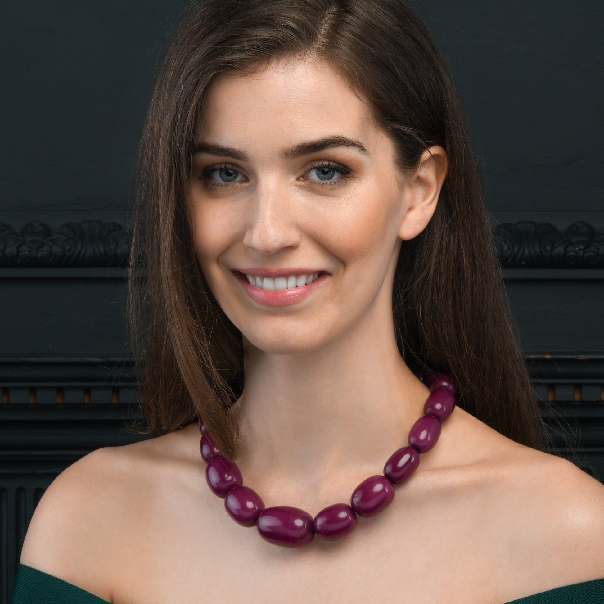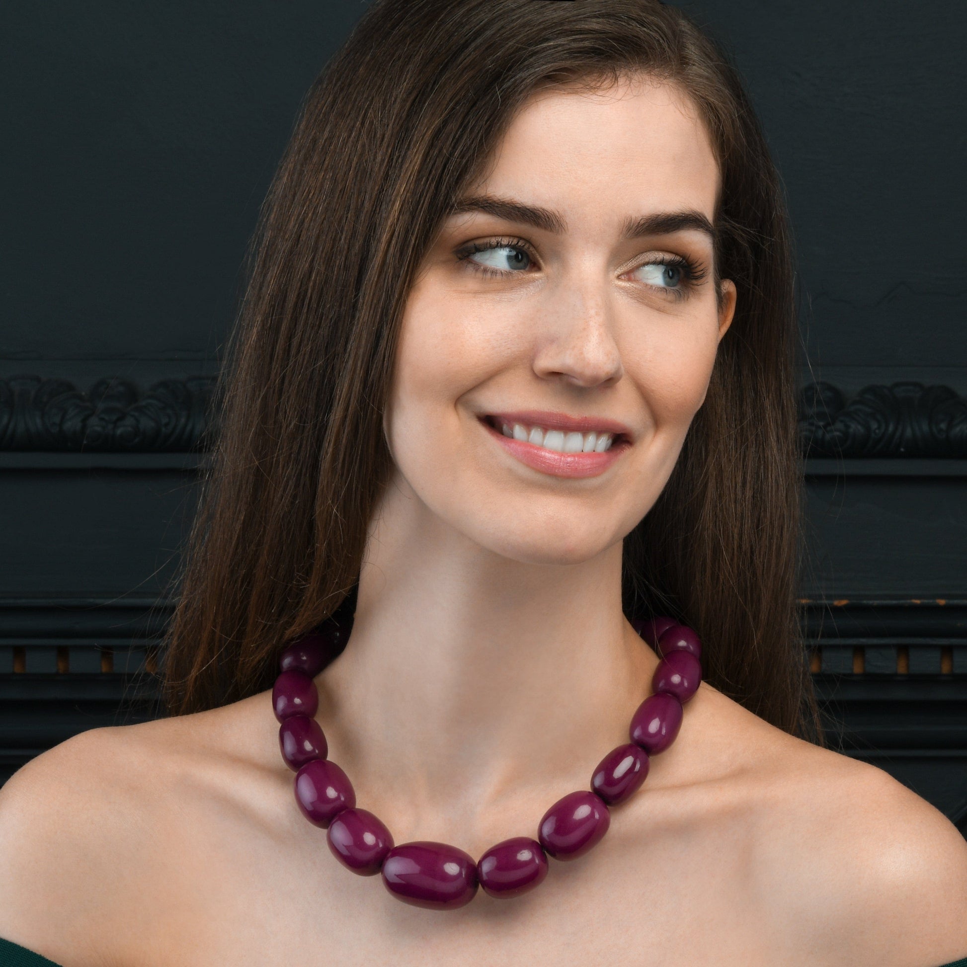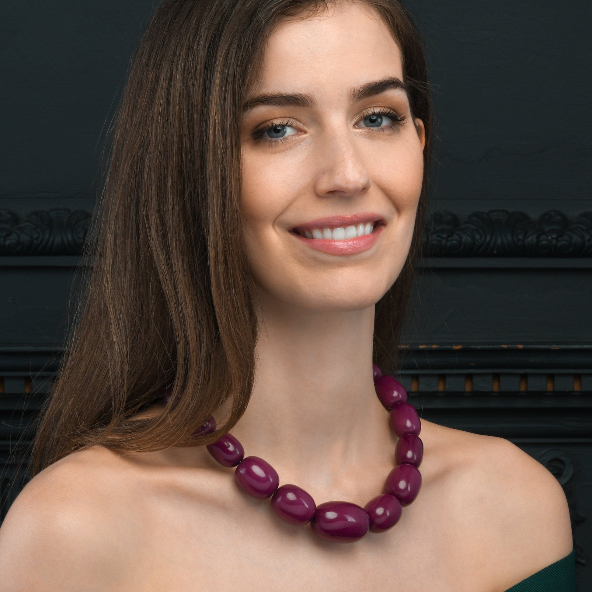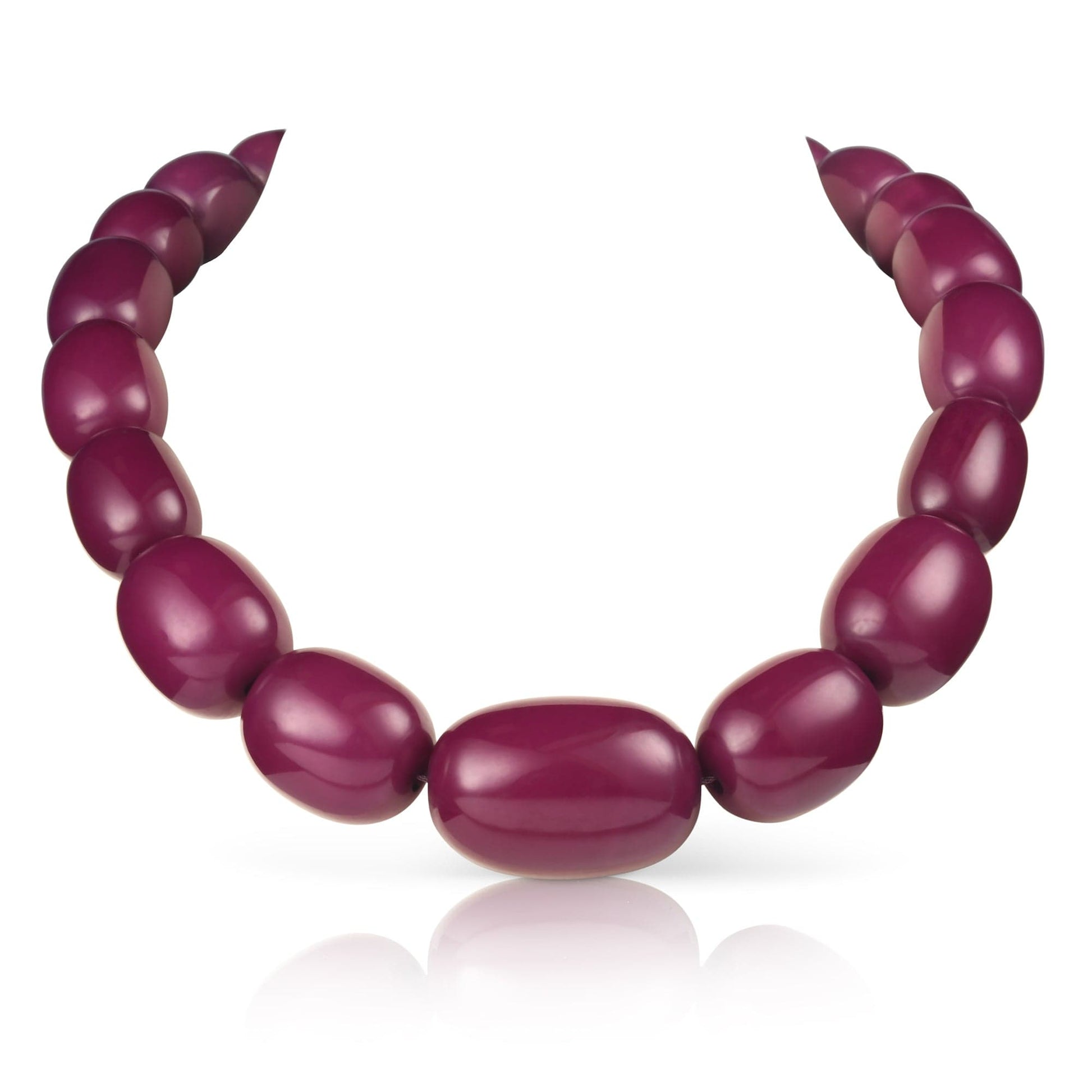 • 20-inch long wide necklace for women with big oval beads. 1 inch at its widest part with a screw clasp closure