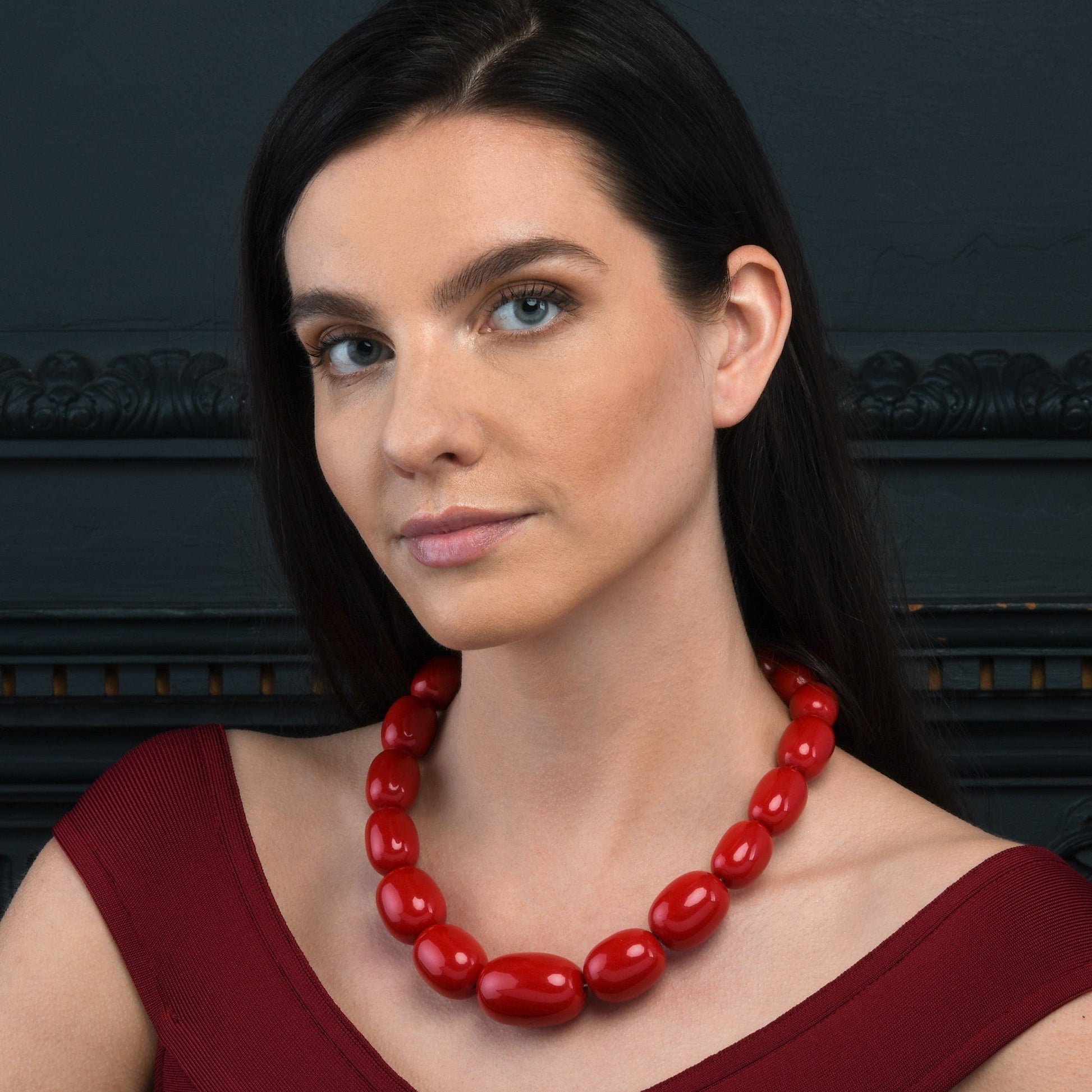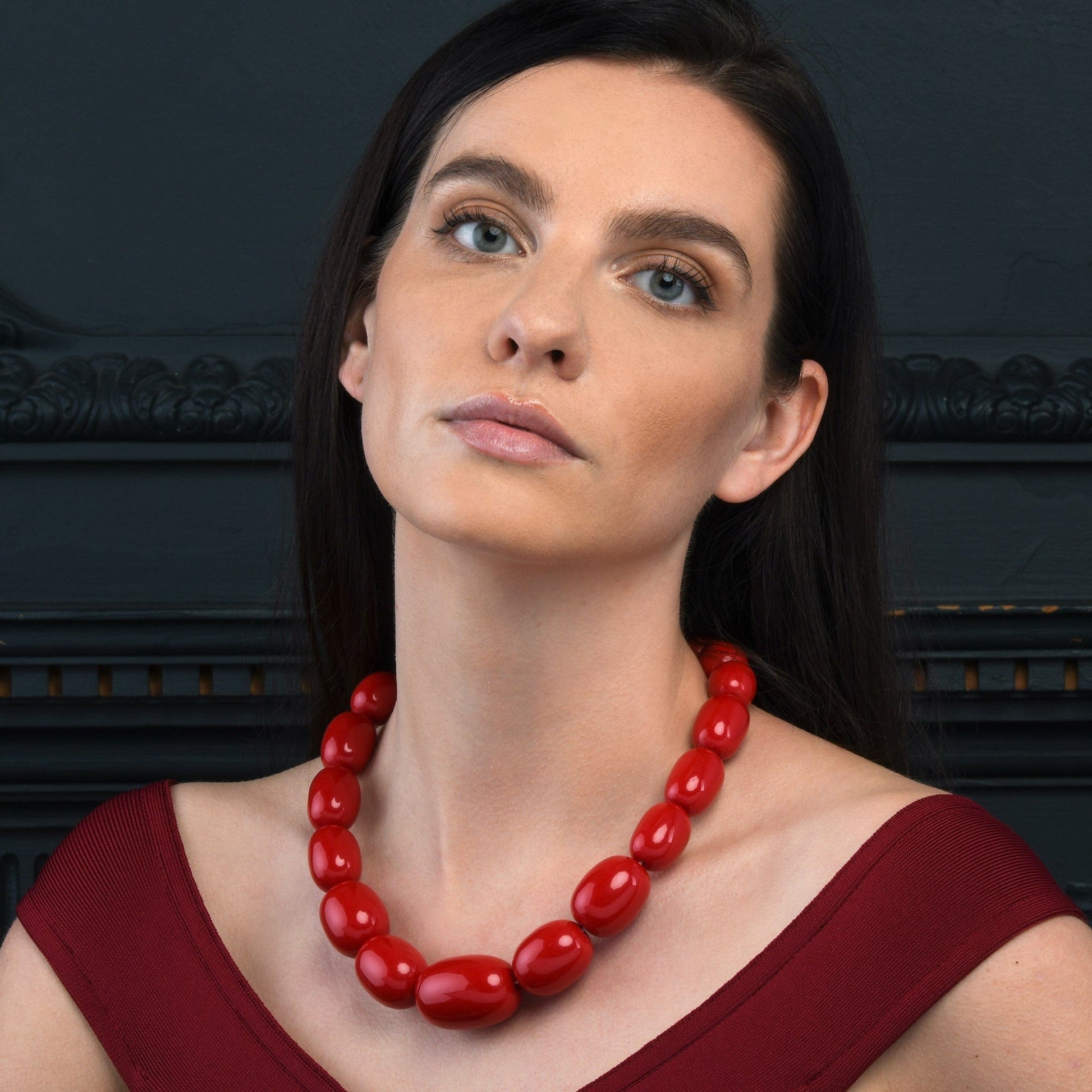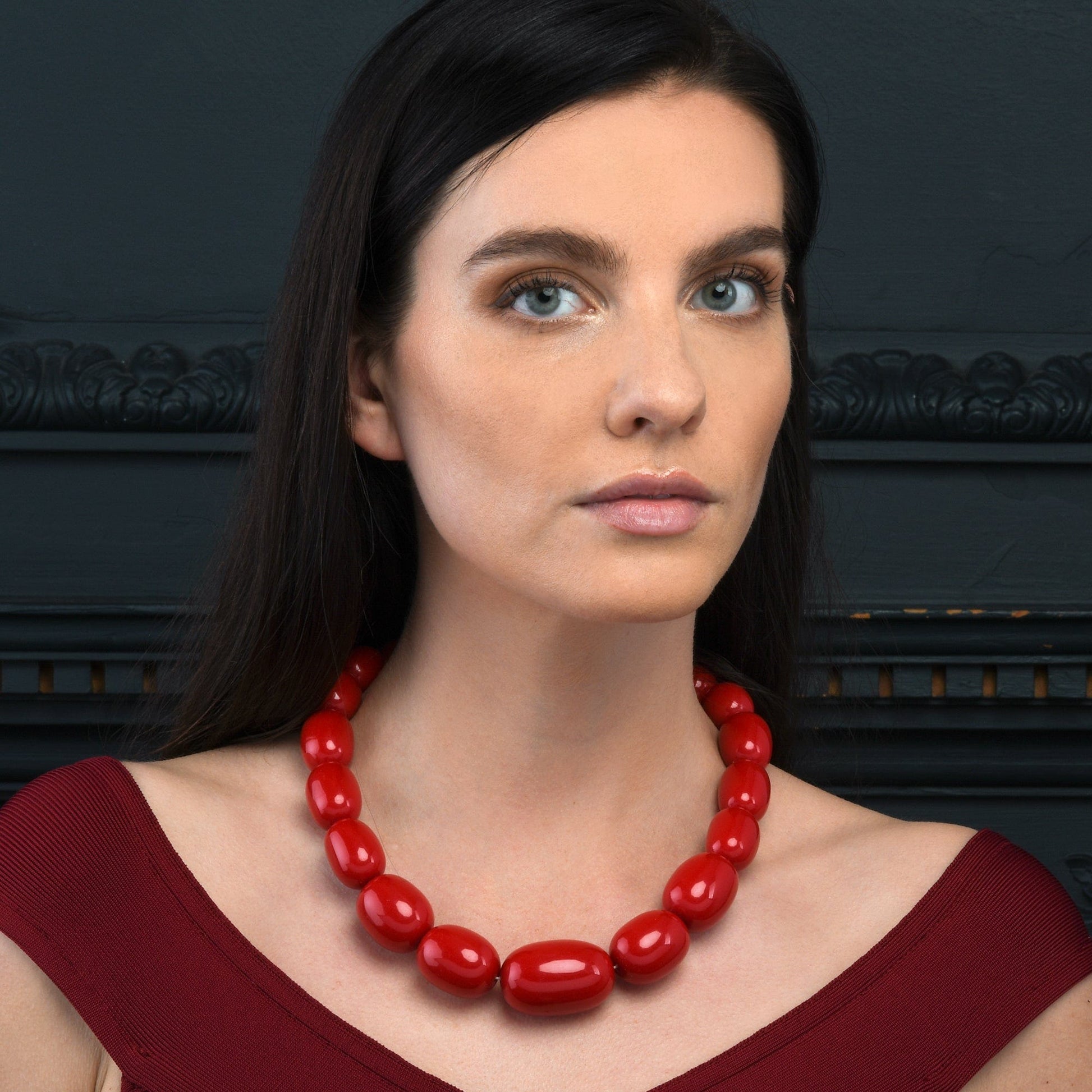 • Elegant large statement necklaces for women in red. You can pair these bold necklaces with a floral dress, a plain T-shirt, or even with formal office wear