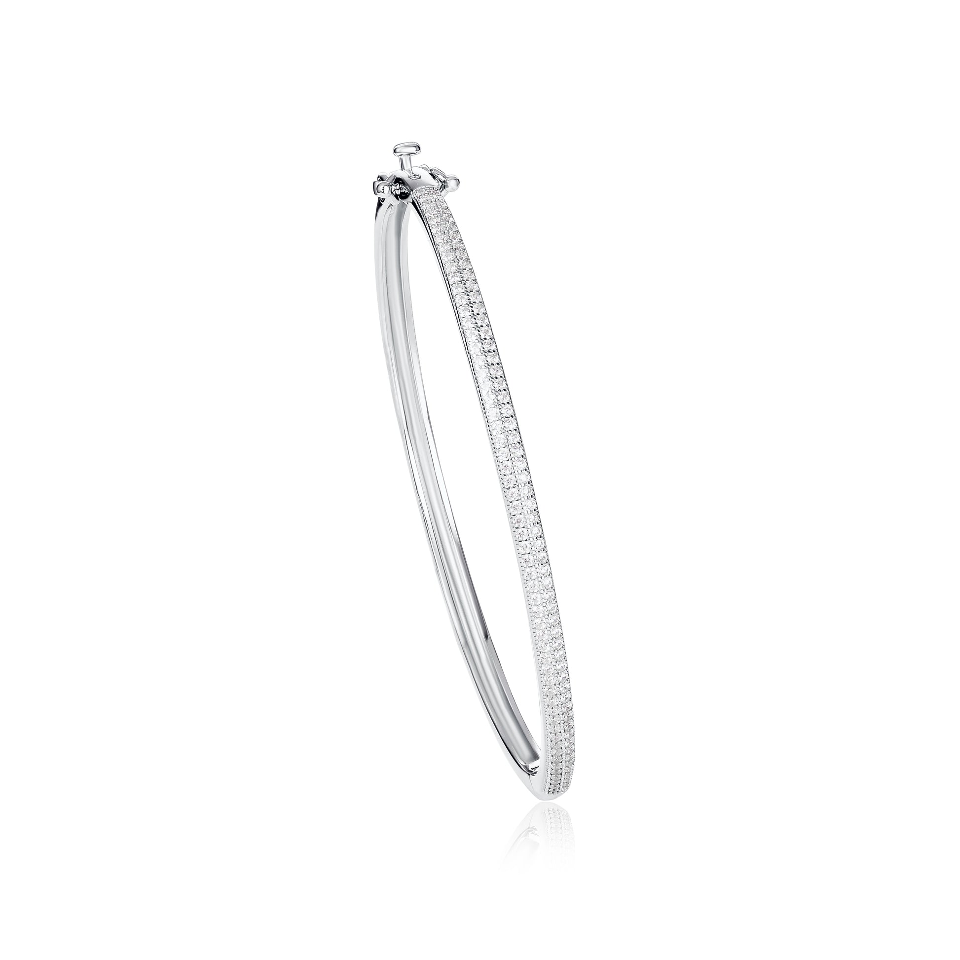 - 3 mm wide 925 Sterling Silver bangle for women with 2 rows of sparkling cubic zirconia stones.