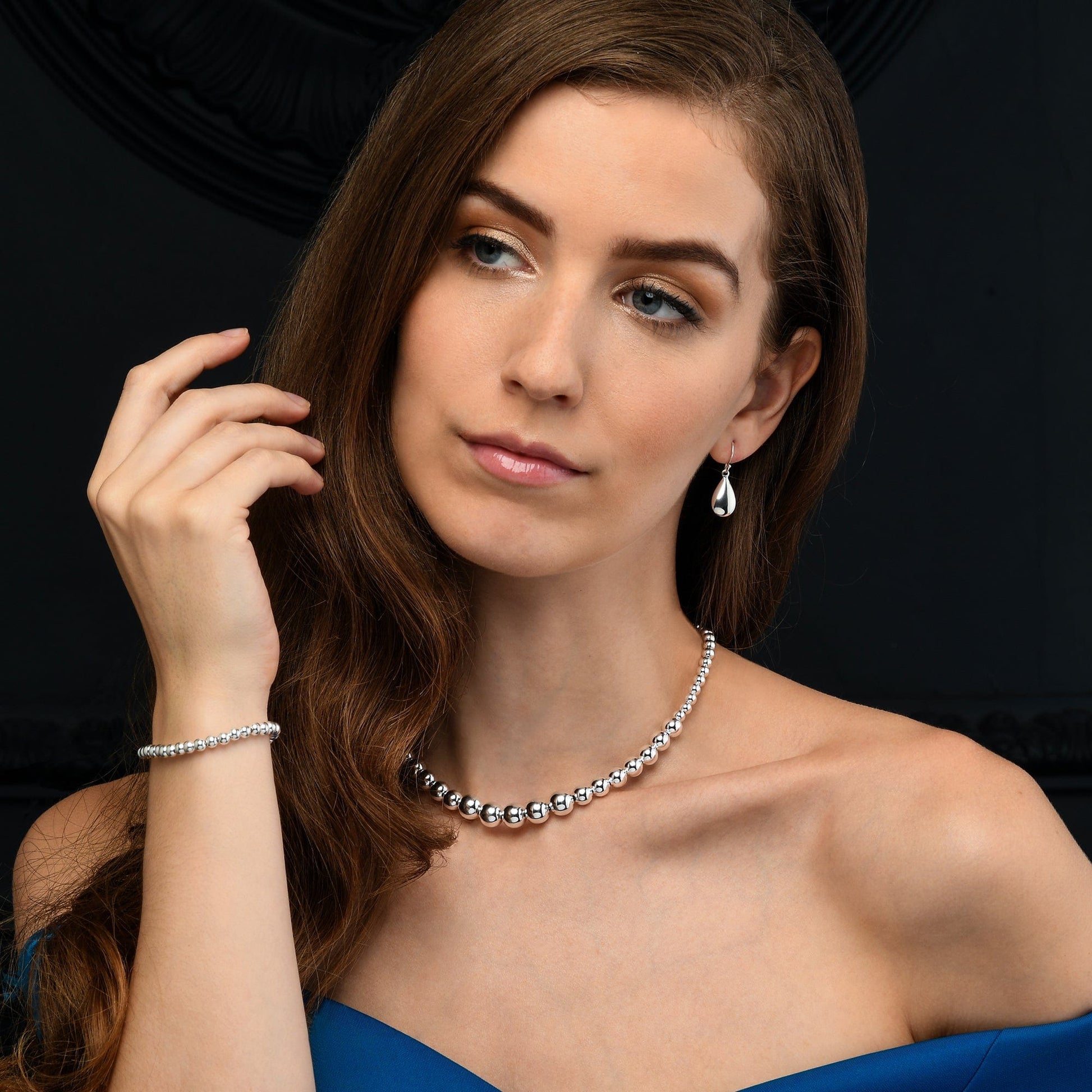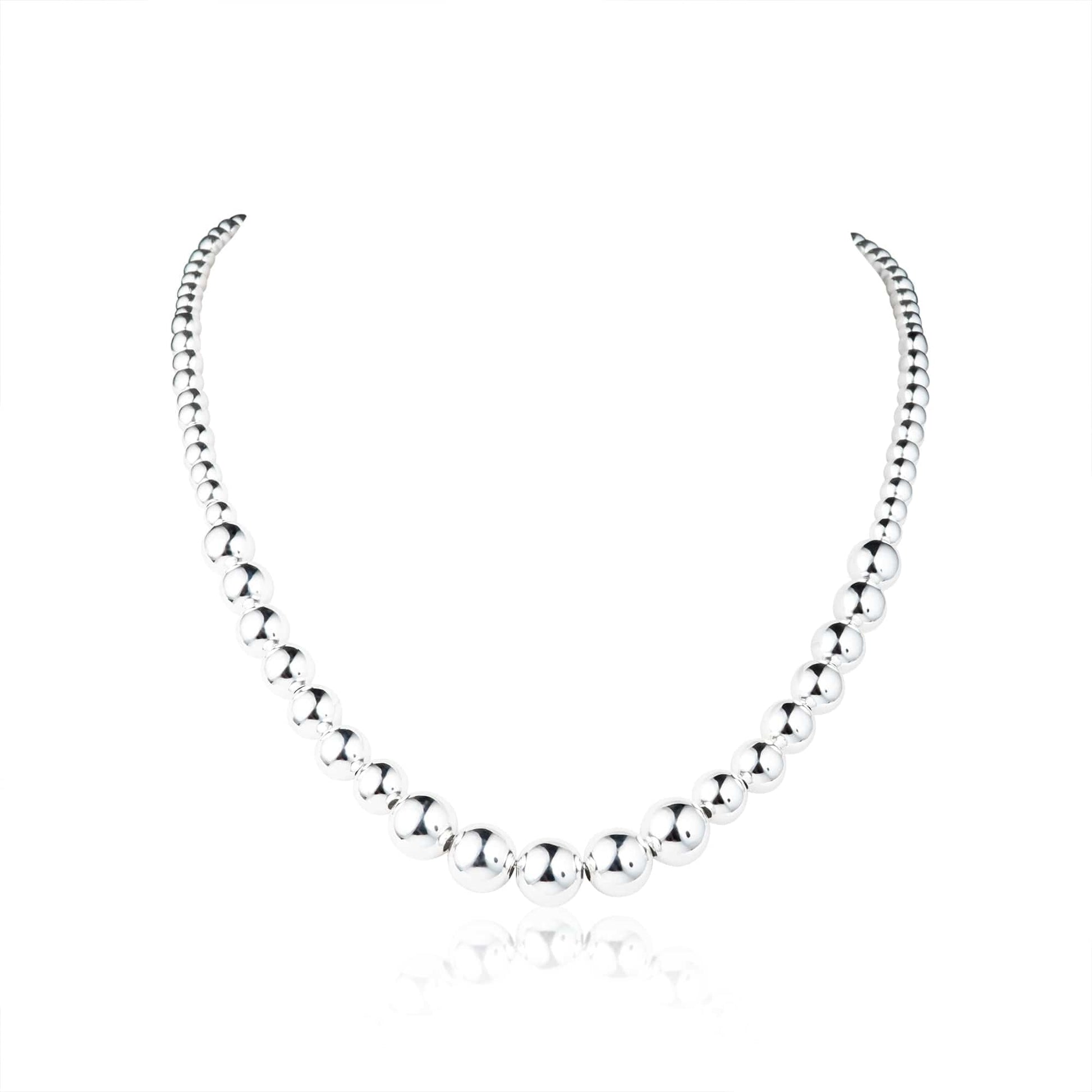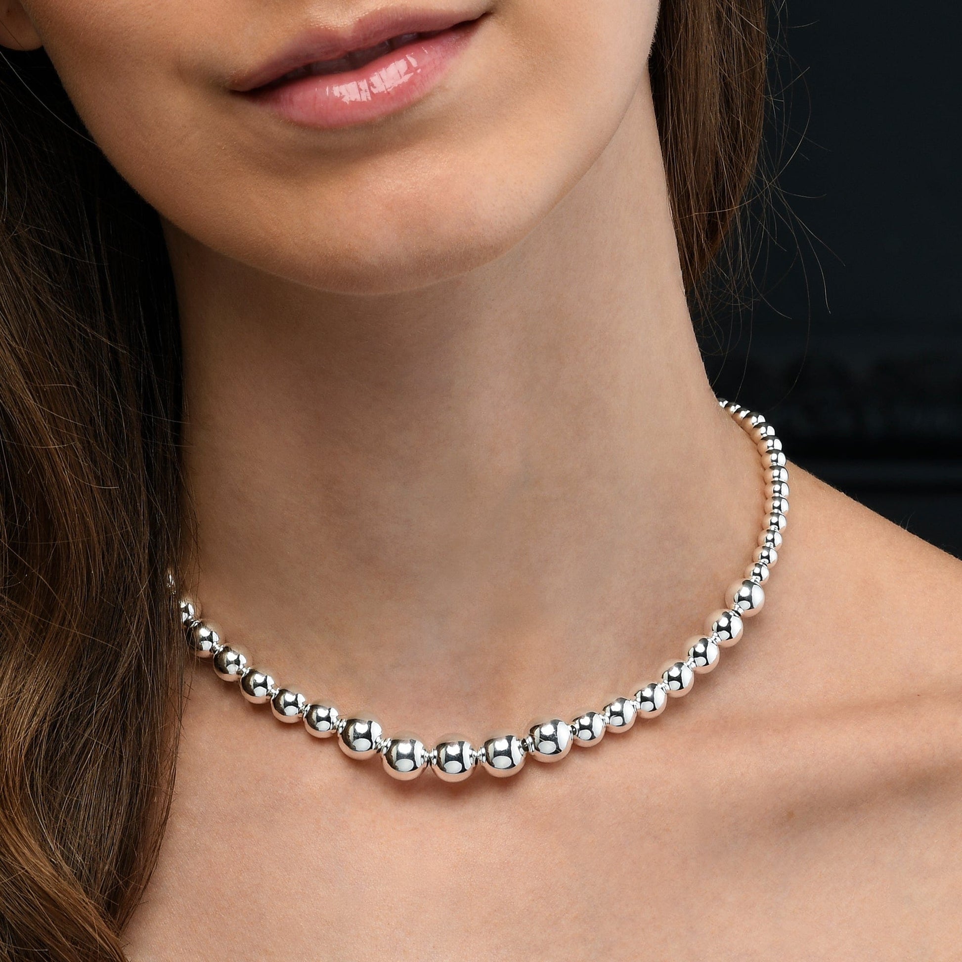 - Statement necklace with a gradient of silver round beads with the smallest bead measuring 4 mm and the largest bead measuring 10 mm