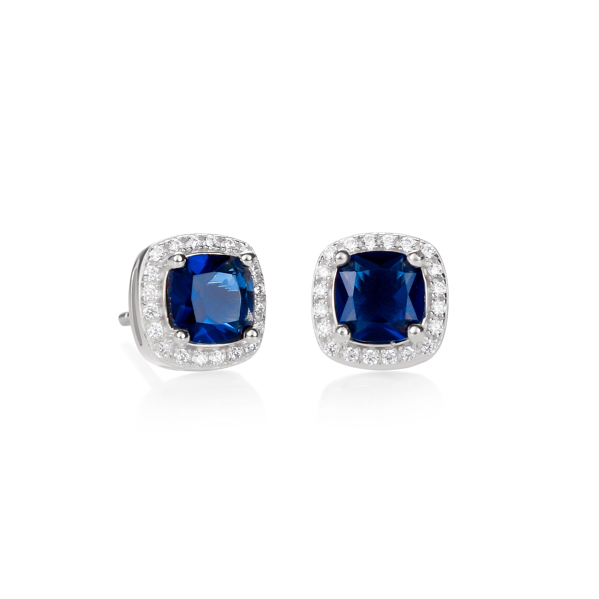 • 9 mm x 9 mm cushion-shaped stud earrings for women set with 6 mm x 6 mm cushion-cut sapphire blue cubic zirconia stones and a halo of small sparkling white cubic zirconia stones.