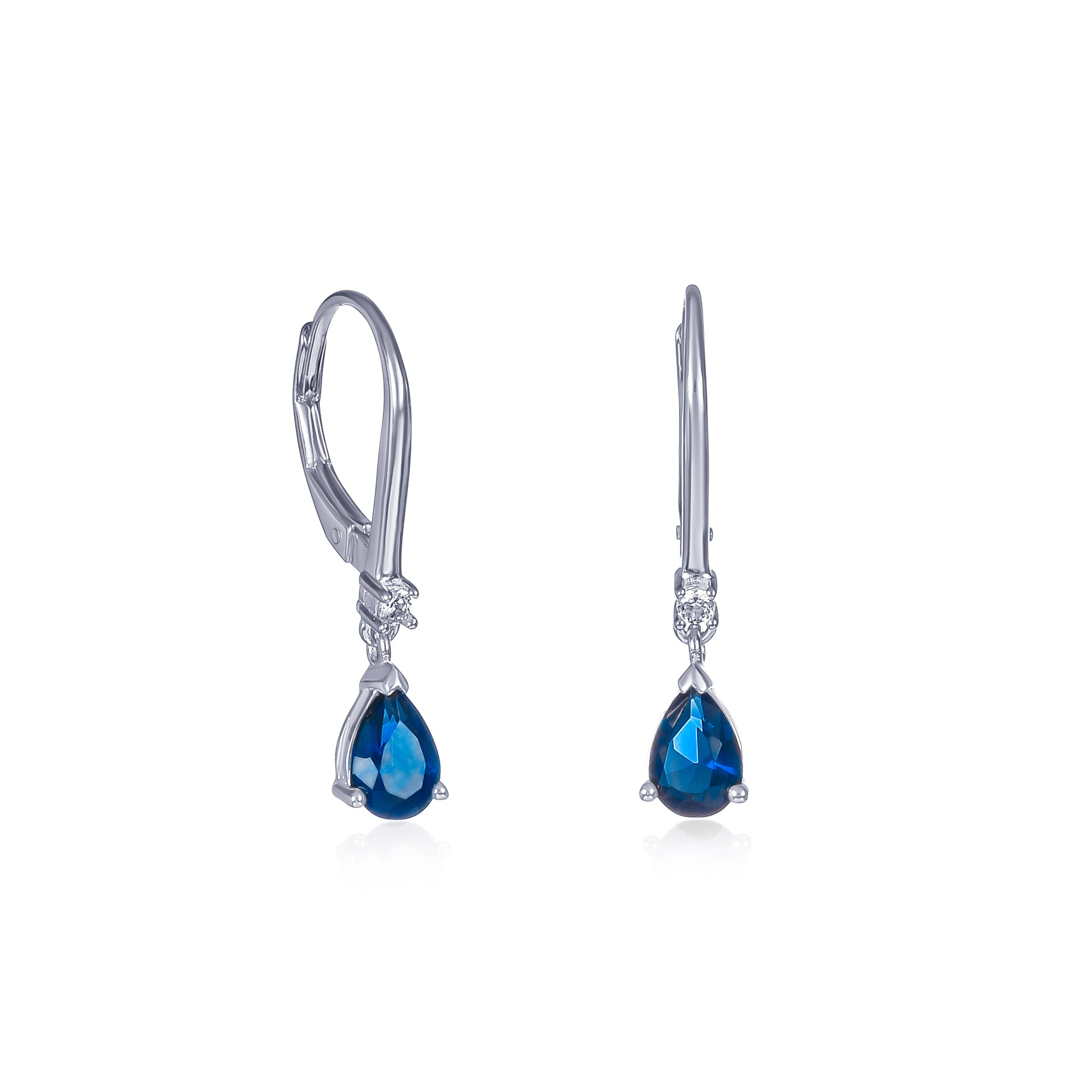• Small drop earrings for women with 6 mm x 8 mm pear-shaped sapphire blue stones and an accent with 2 mm round clear cubic zirconia. 925 Sterling silver dangle earrings for women with leverback clasps.