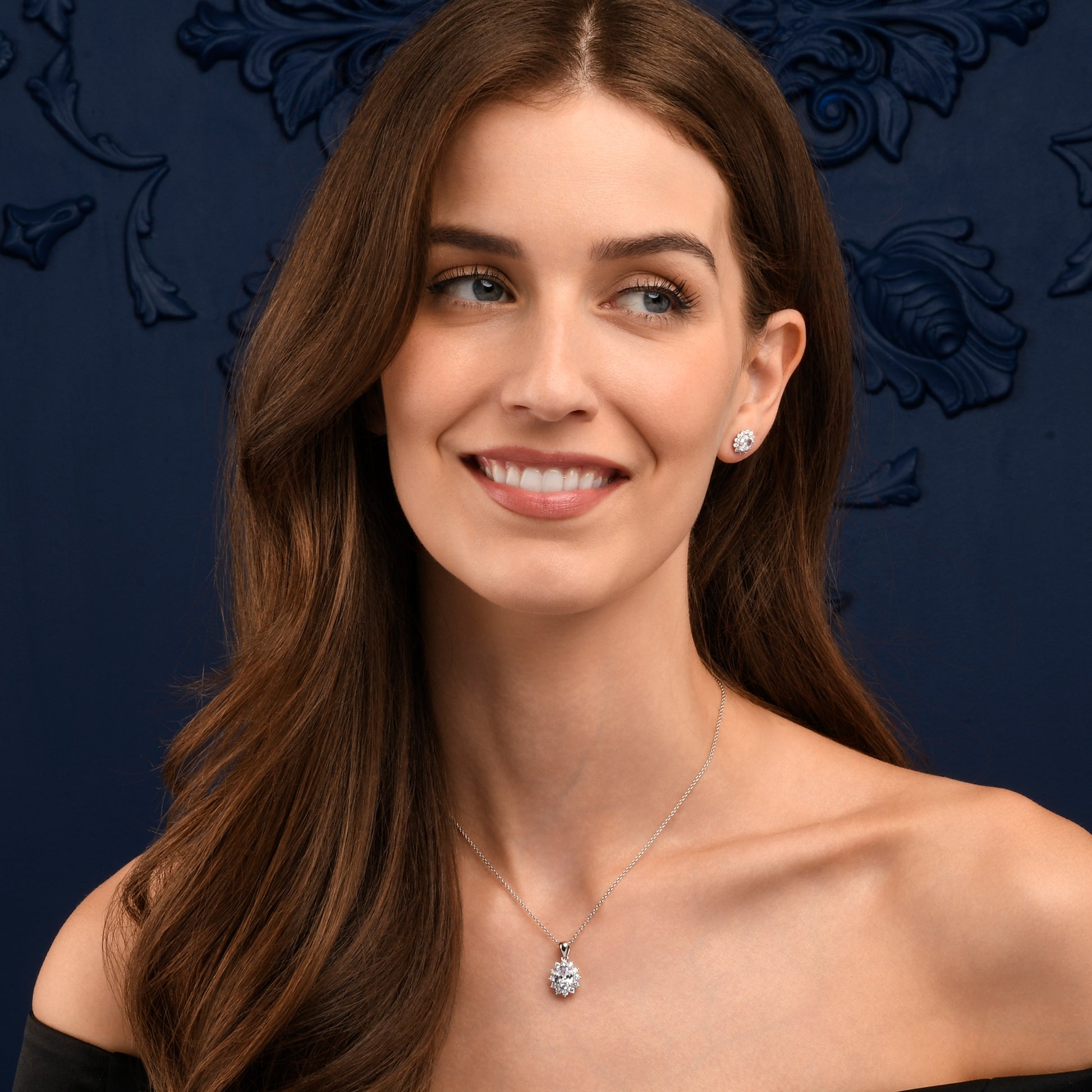 • 925 Sterling Silver necklace for women with a silver pendant set with a sparkling oval AAA cubic zirconia stone with a halo of smaller white cubic zirconia stones.