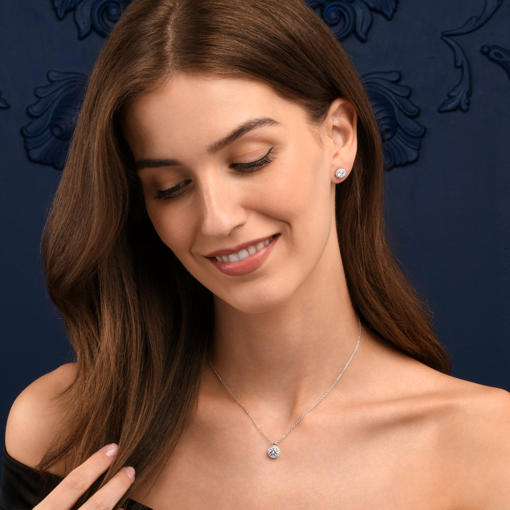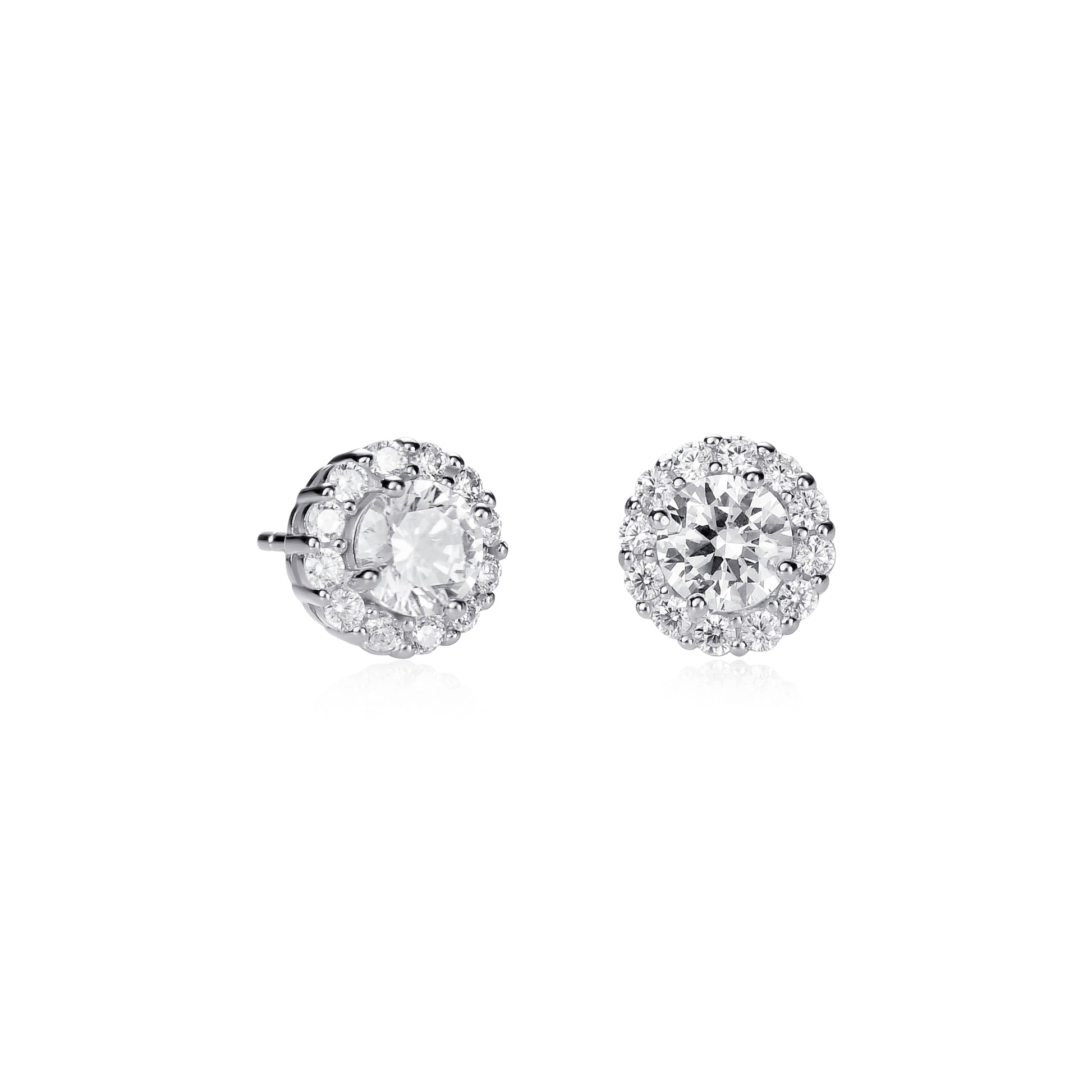 • 8 mm x 8 mm round stud earrings for women set with 5 mm brilliant-cut cubic zirconia stones and a halo of small sparkling white cubic zirconia stones.