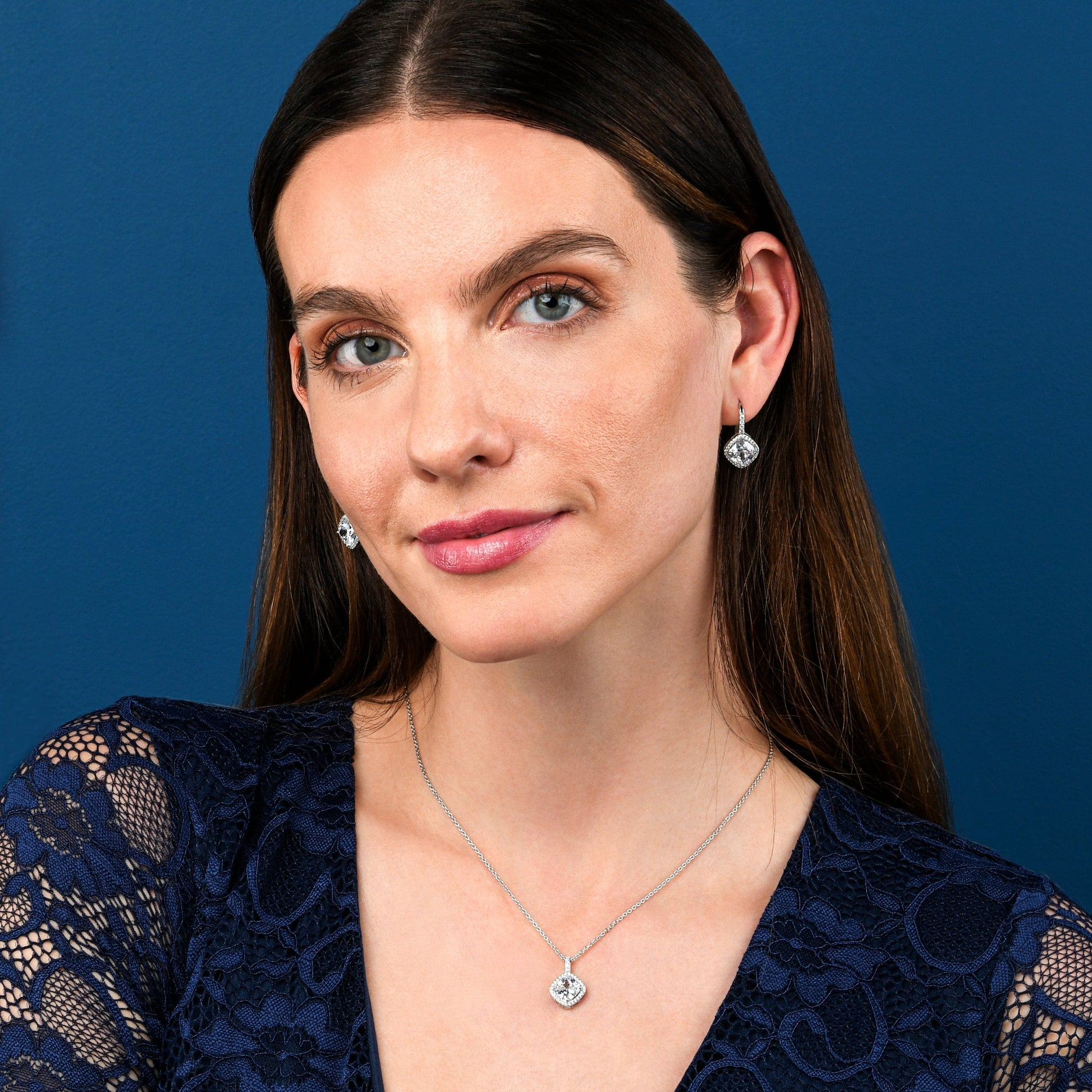 • 12 mm x 18.5 mm silver pendant for women with 8 mm x 8 mm cushion-cut Cubic Zirconia stone encircled by a halo of smaller 1.5 mm CZ stones on an adjustable 18” chain, including 2-inch extension links.