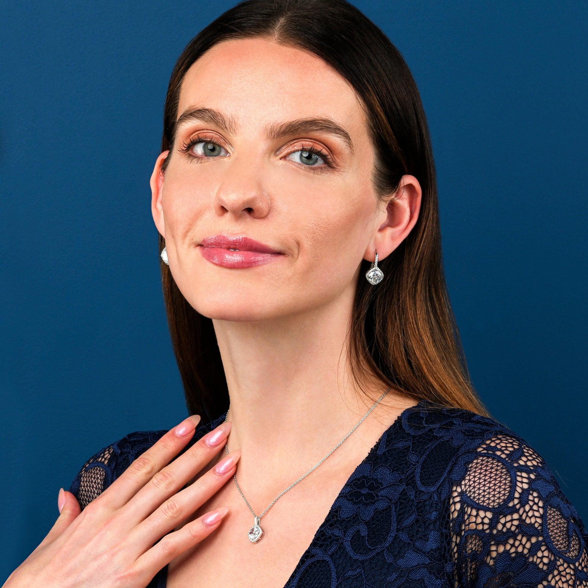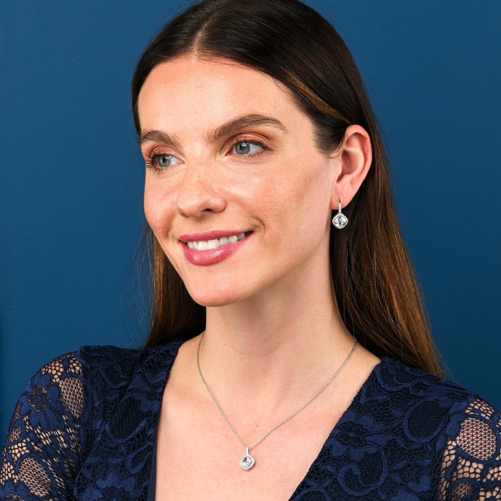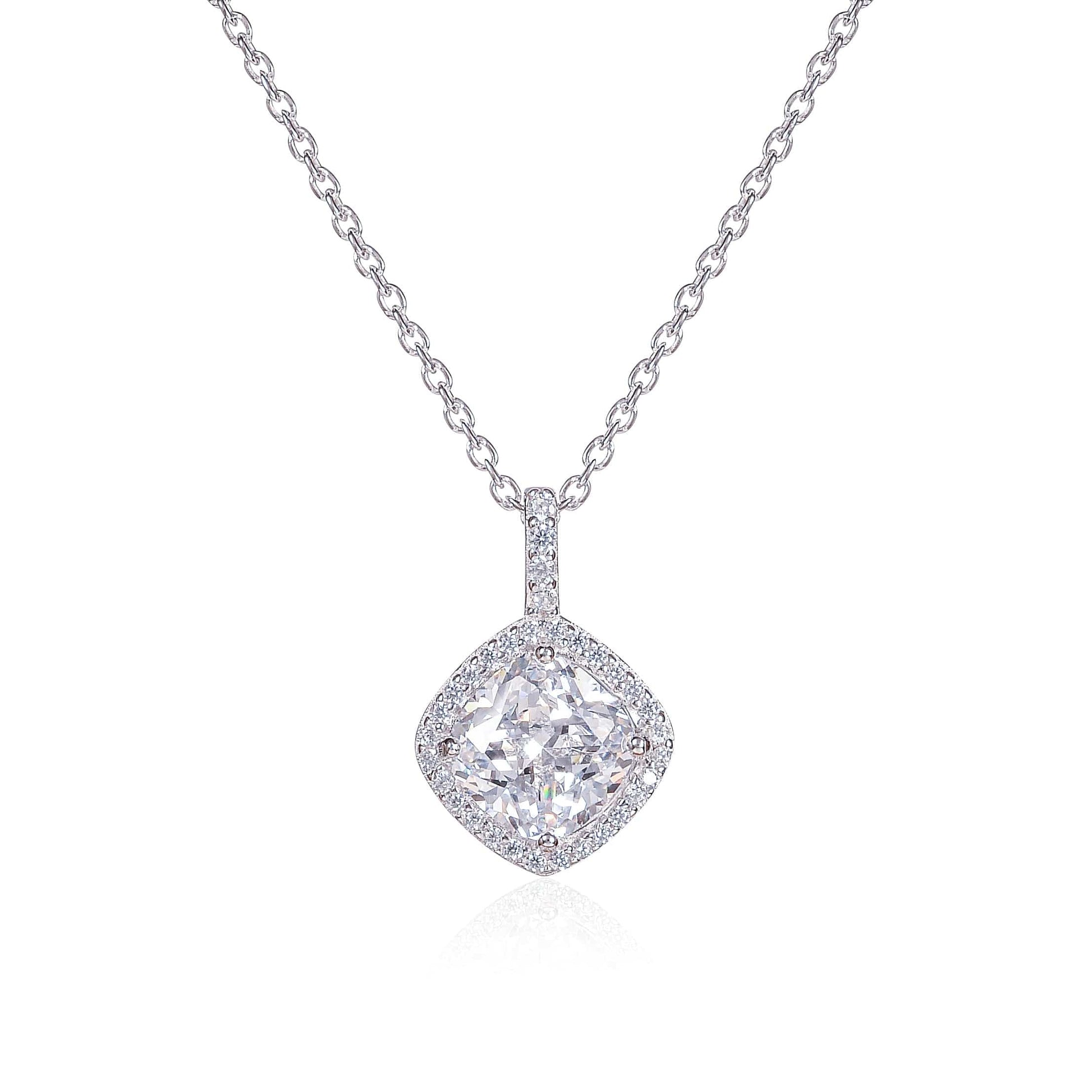 • 925 Sterling Silver necklace for women with a silver pendant set with a cushion shaped AAA cubic zirconia stone with a halo of smaller white cubic zirconia stones.