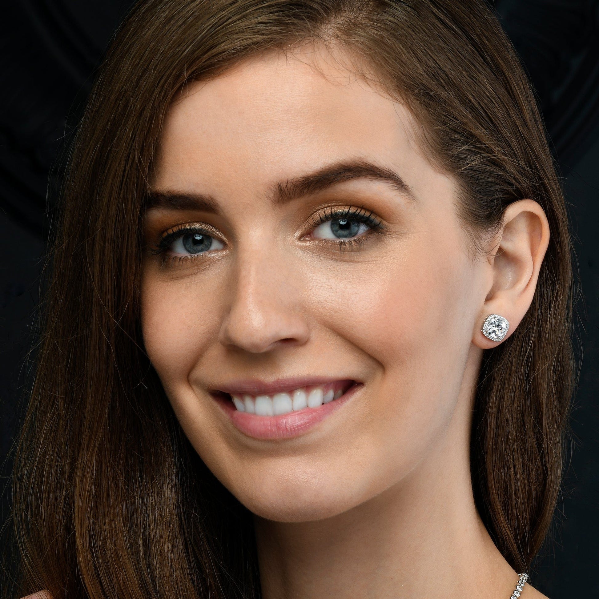 - 10 mm x 10 mm studs for women with 7 mm cushion-shaped stones encircled by a halo of smaller white stones
