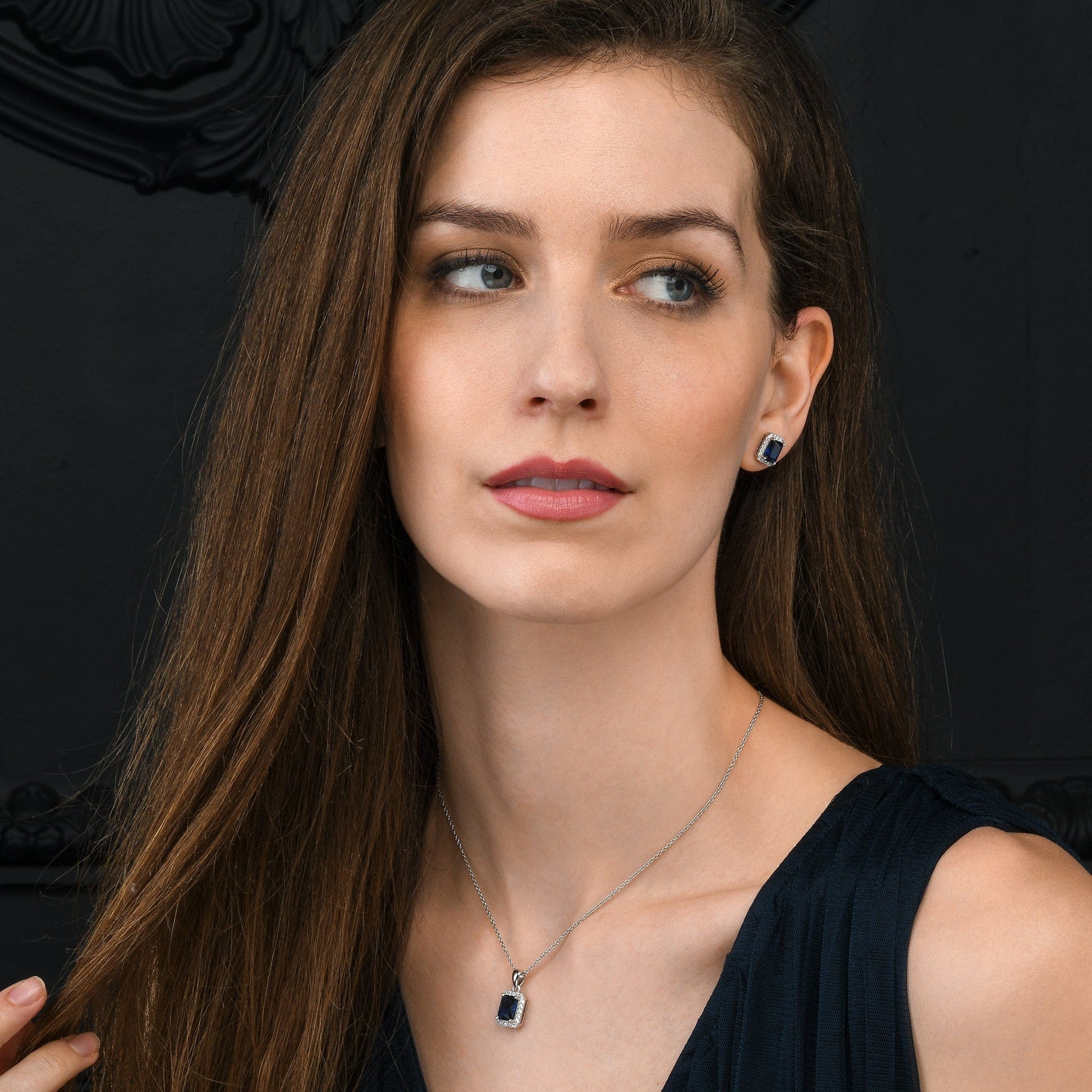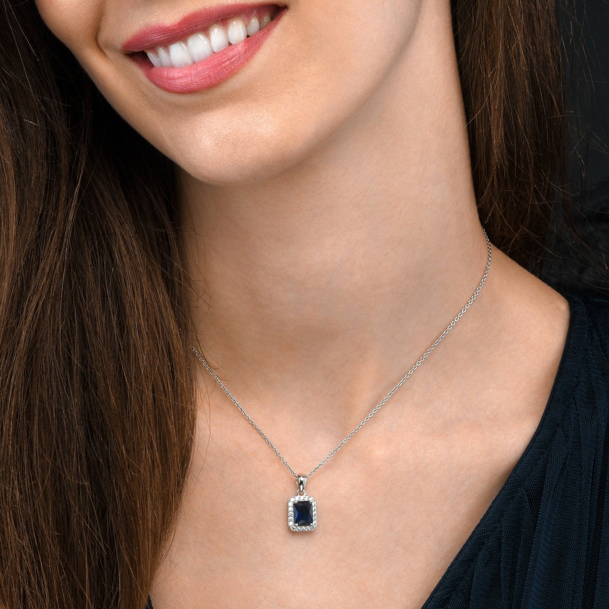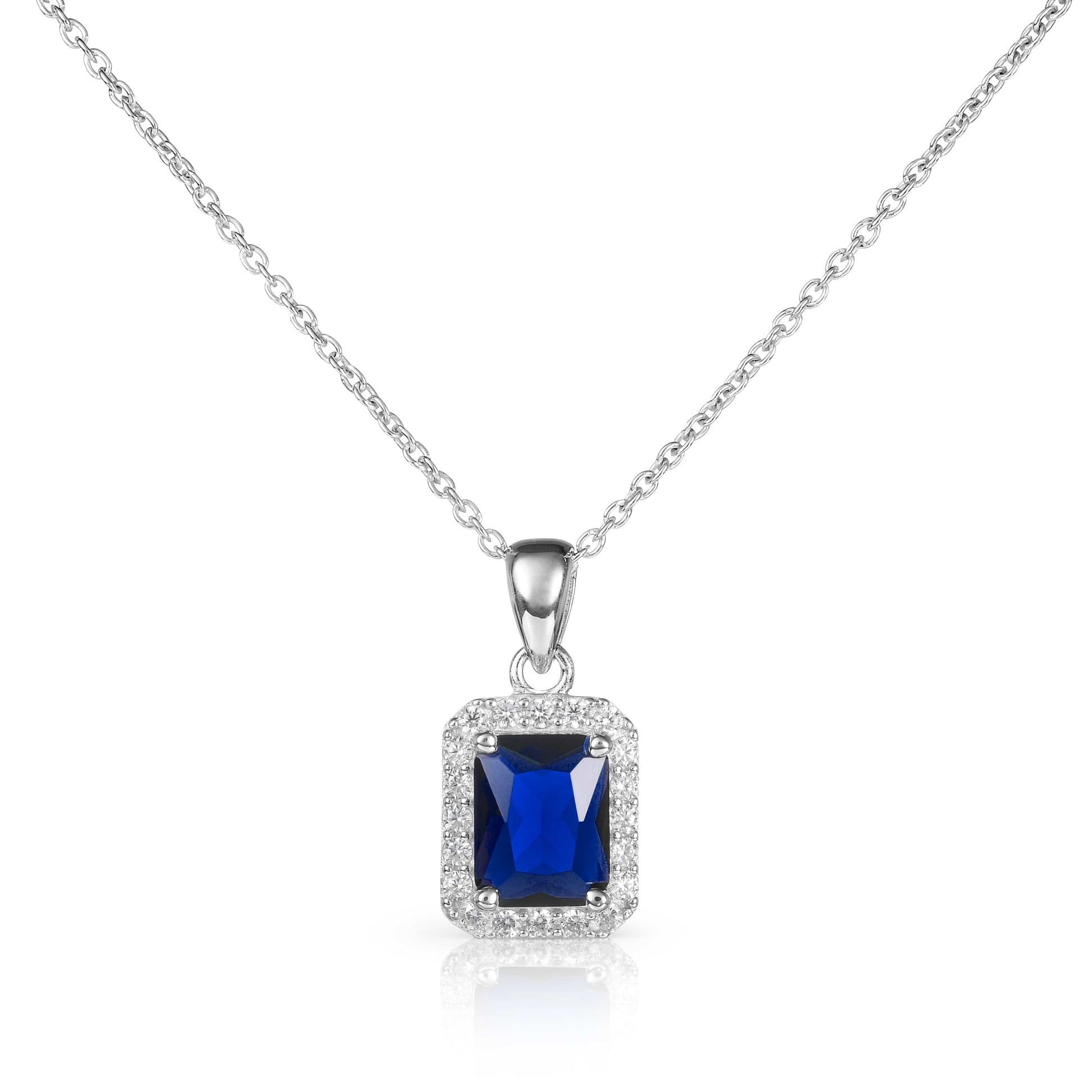• 10mm x 12.5mm rectangle shaped halo pendant for women with 7 mm x 9 mm emerald cut Blue stone encircled by a halo of smaller 1.5mm white stones on an adjustable 18” chain, including 2-inch extension links.