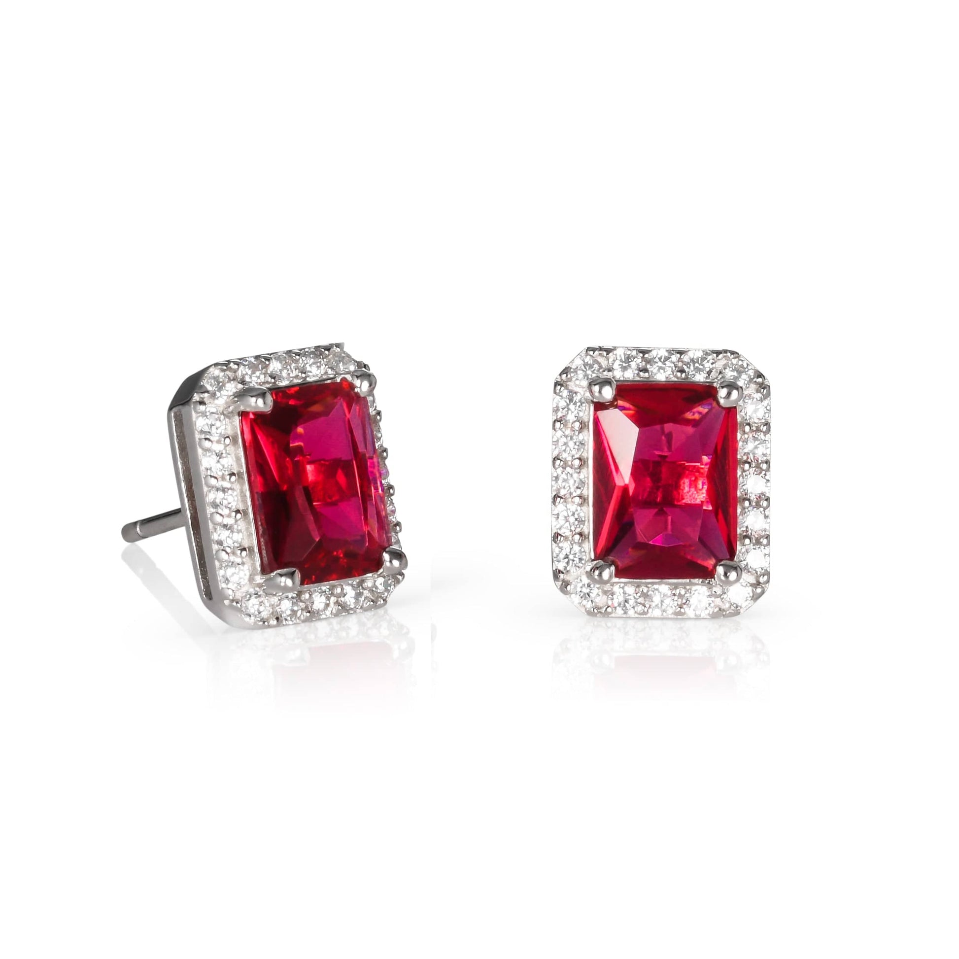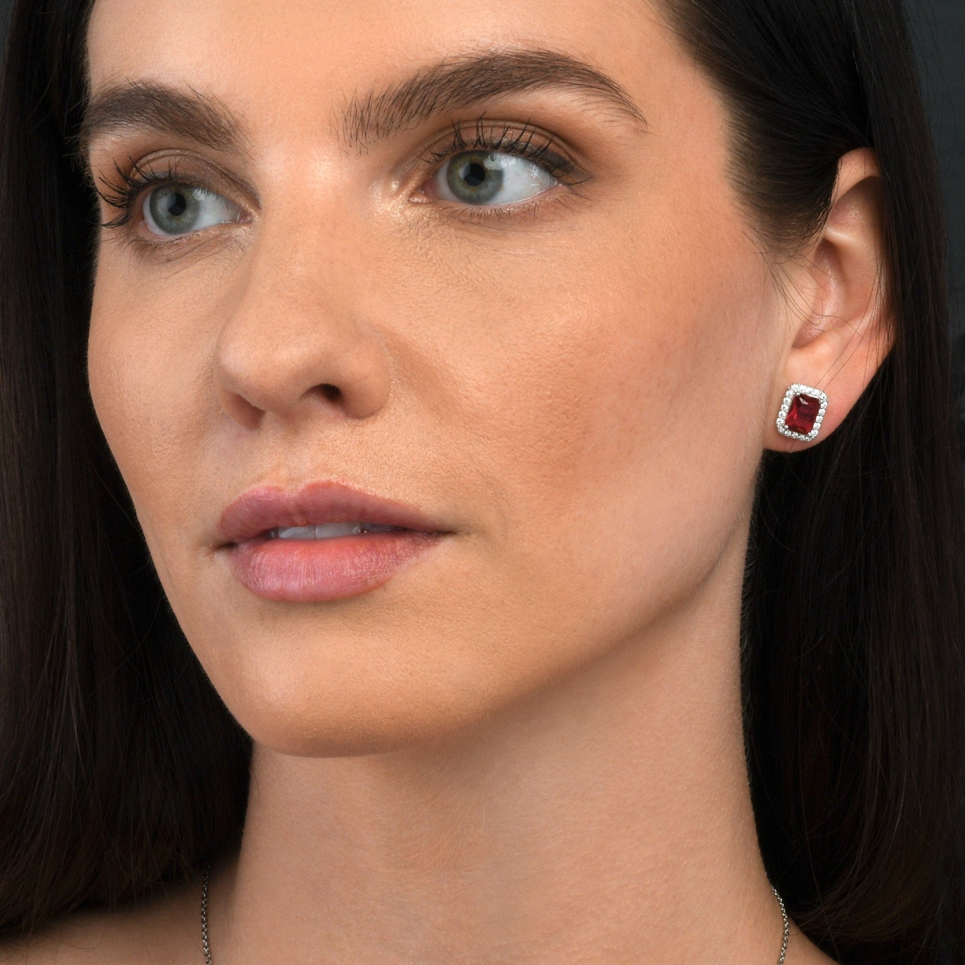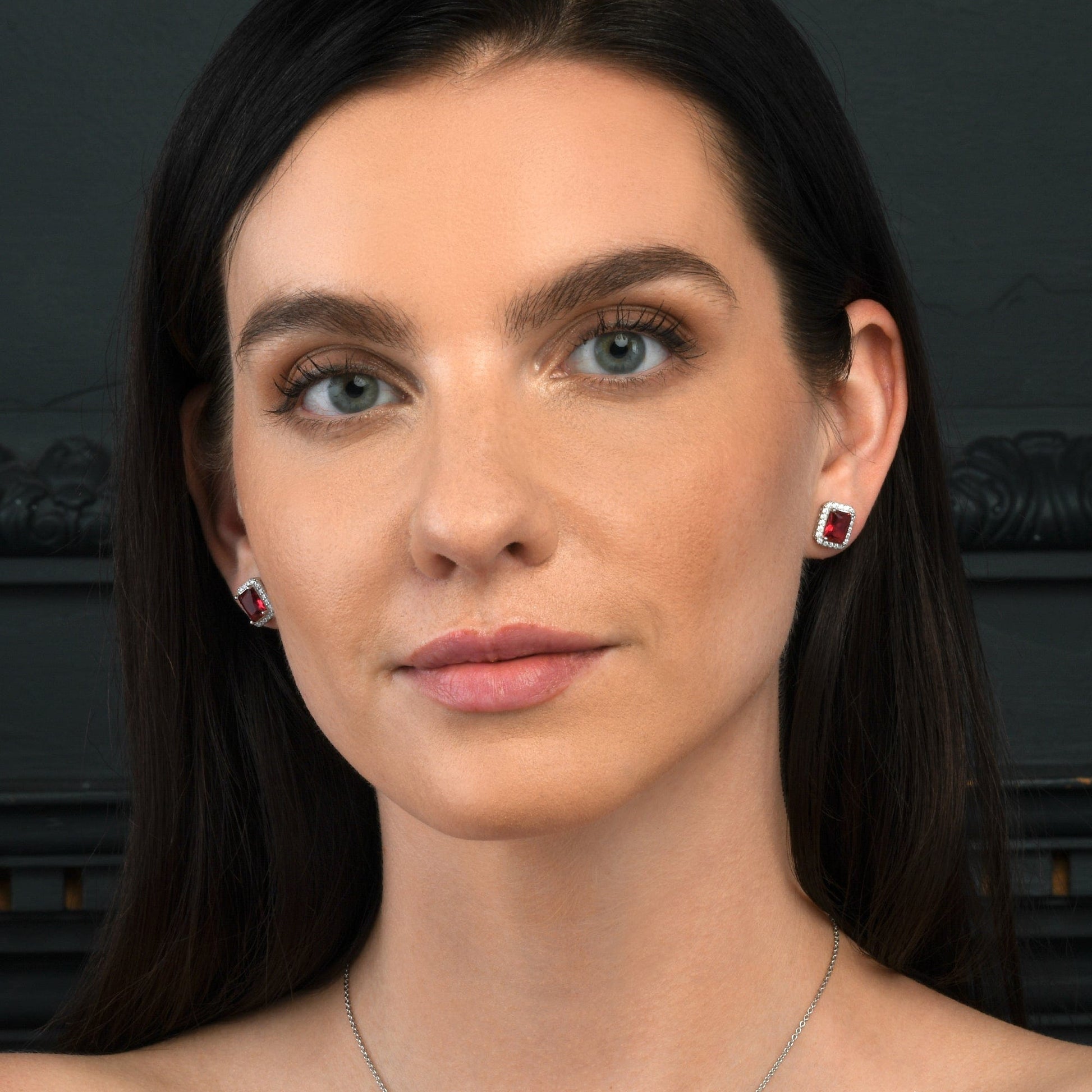 • 9mm x 11mm rectangle studs are set with 6mm x 8mm emarald cut ruby red cubic zirconia stones and 1.5mm small sparkling white cubic zirconia stones.