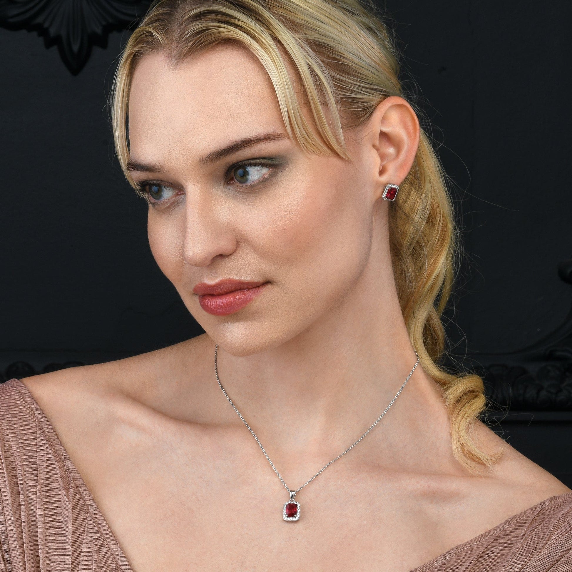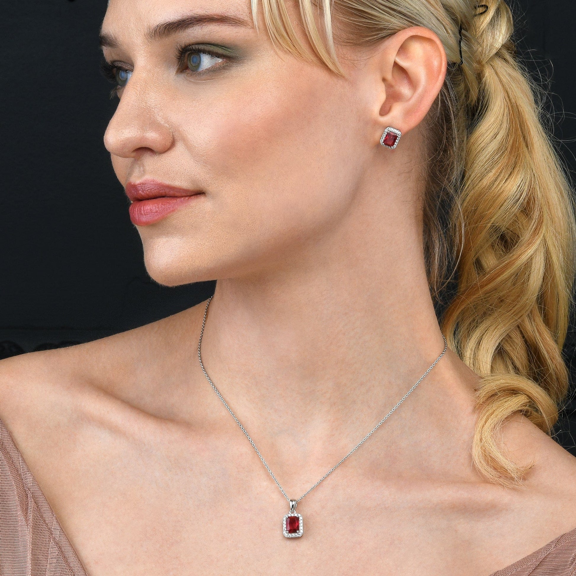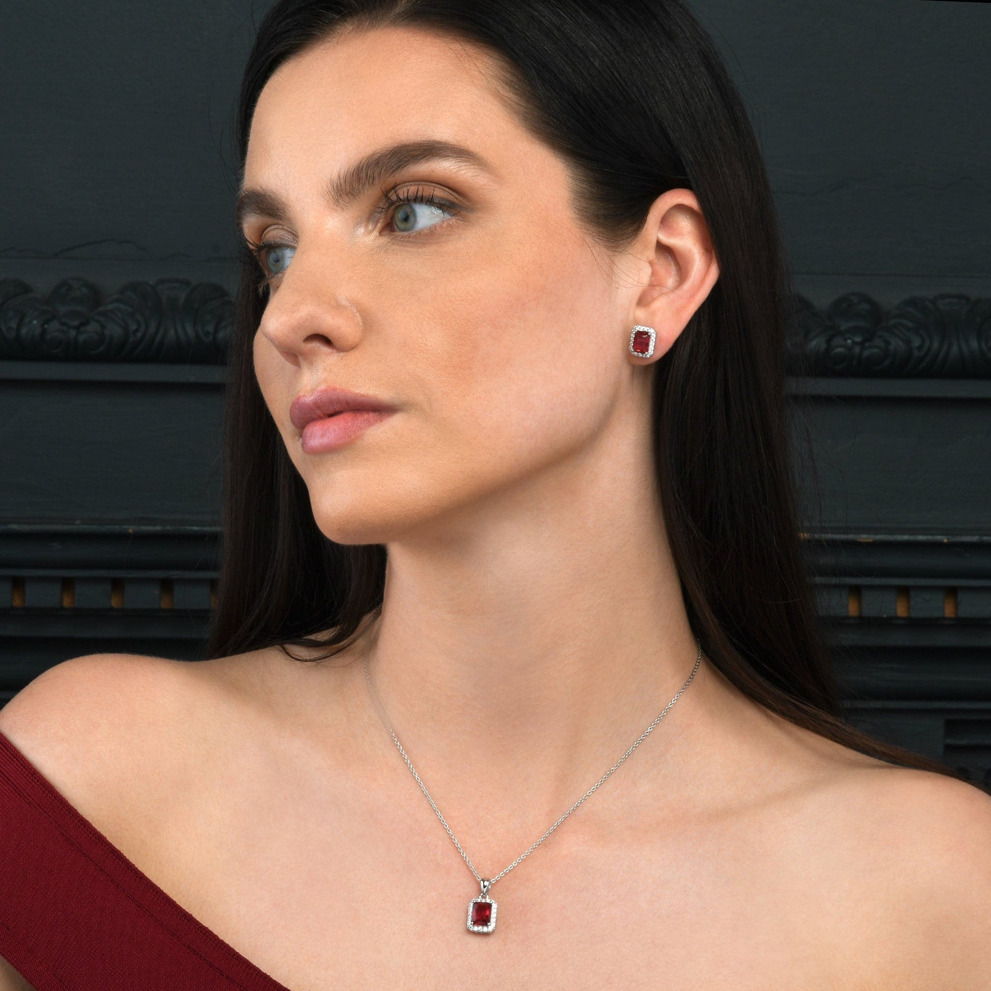 • 9mm x 11mm rectangle studs are set with 6mm x 8mm emarald cut ruby red cubic zirconia stones and 1.5mm small sparkling white cubic zirconia stones.