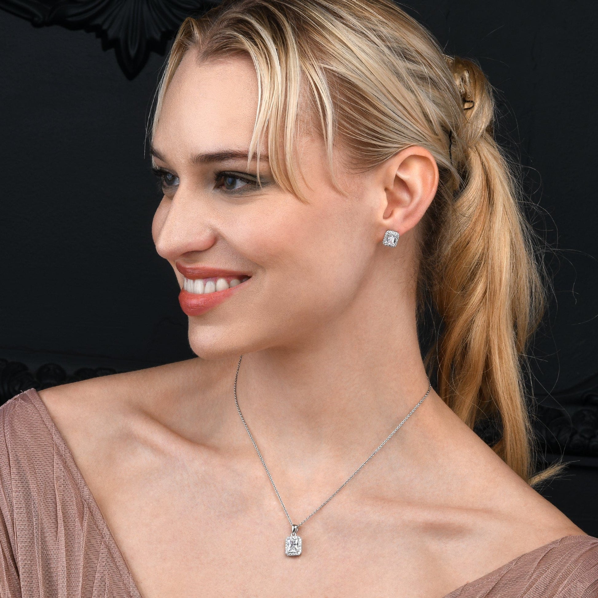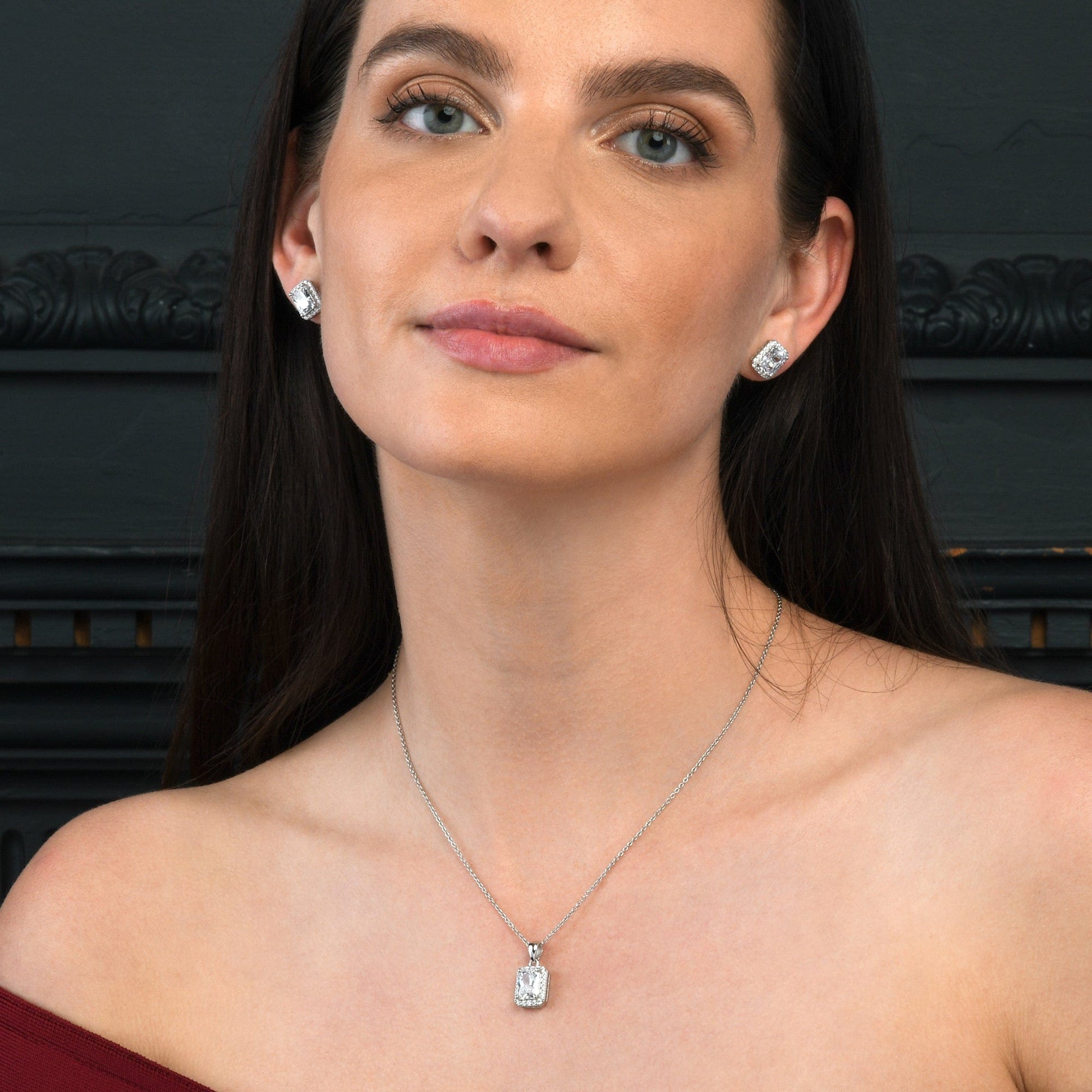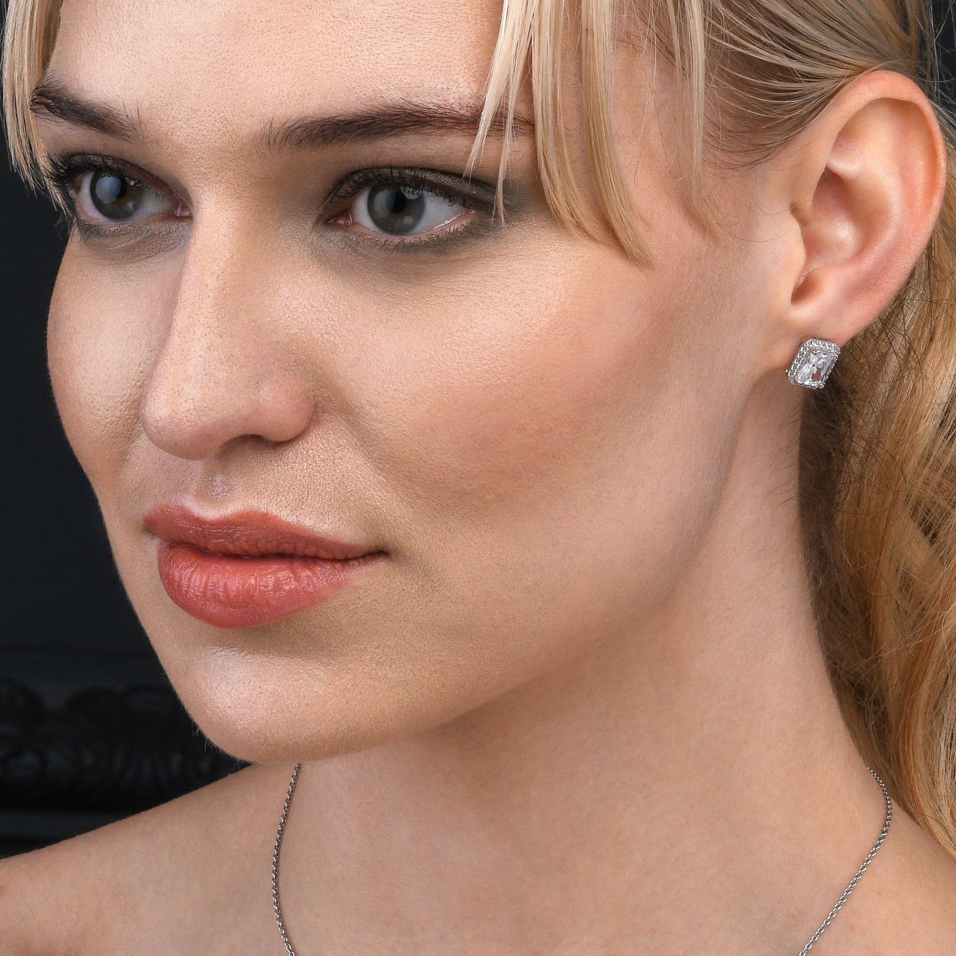 • 9mm x 11mm rectangle studs are set with 6mm x 8mm emarald cut white cubic zirconia stones and 1.5mm small sparkling white cubic zirconia stones.
