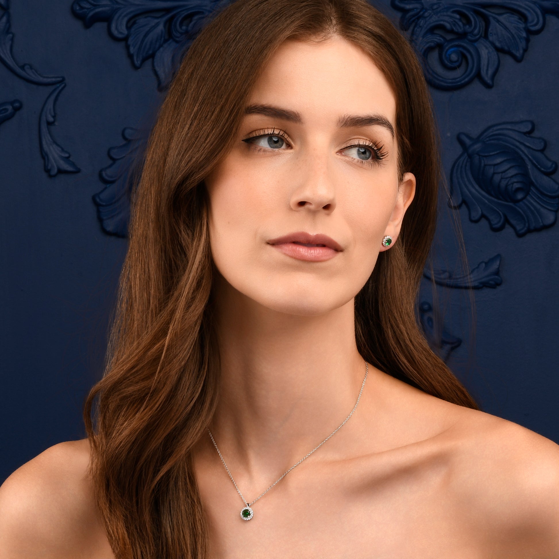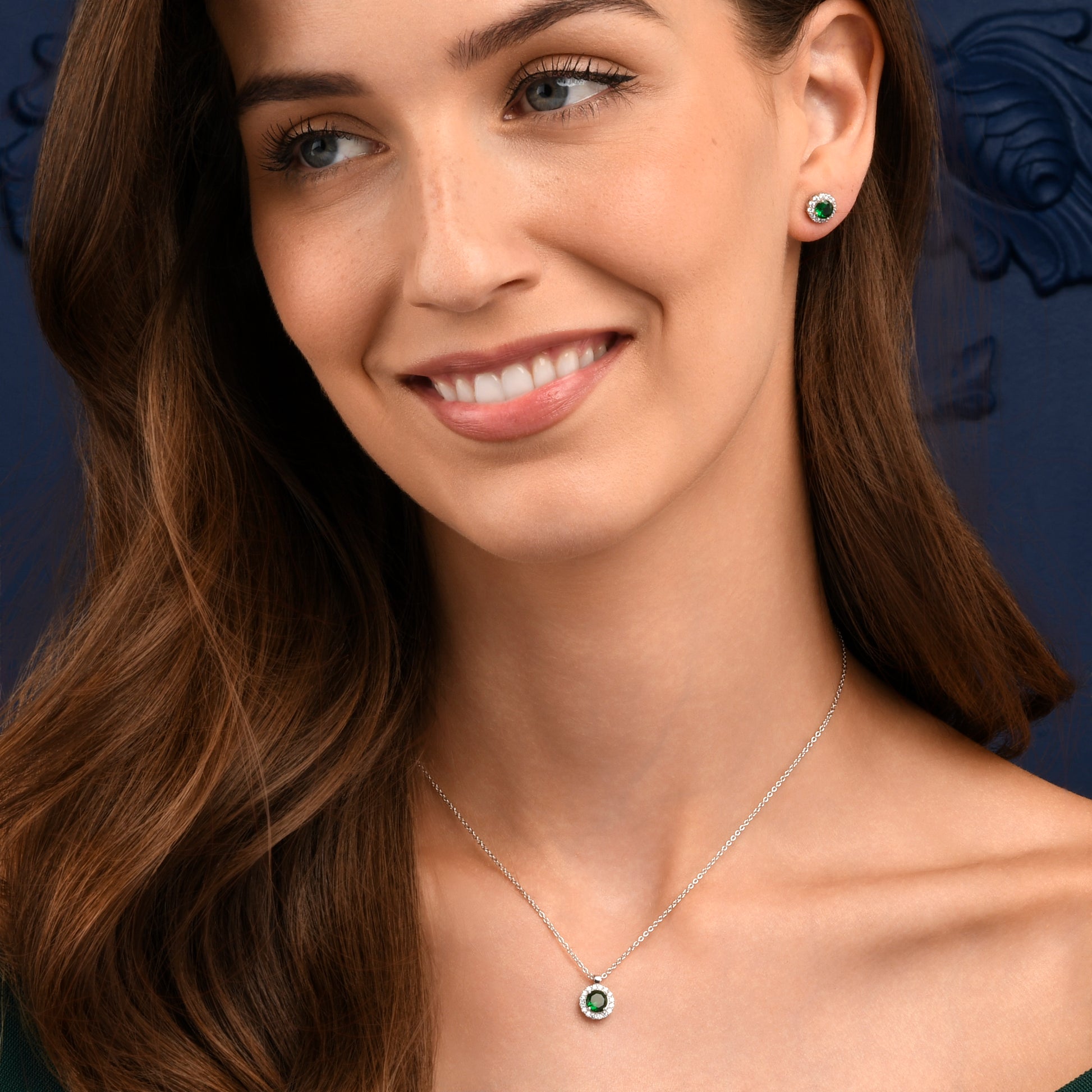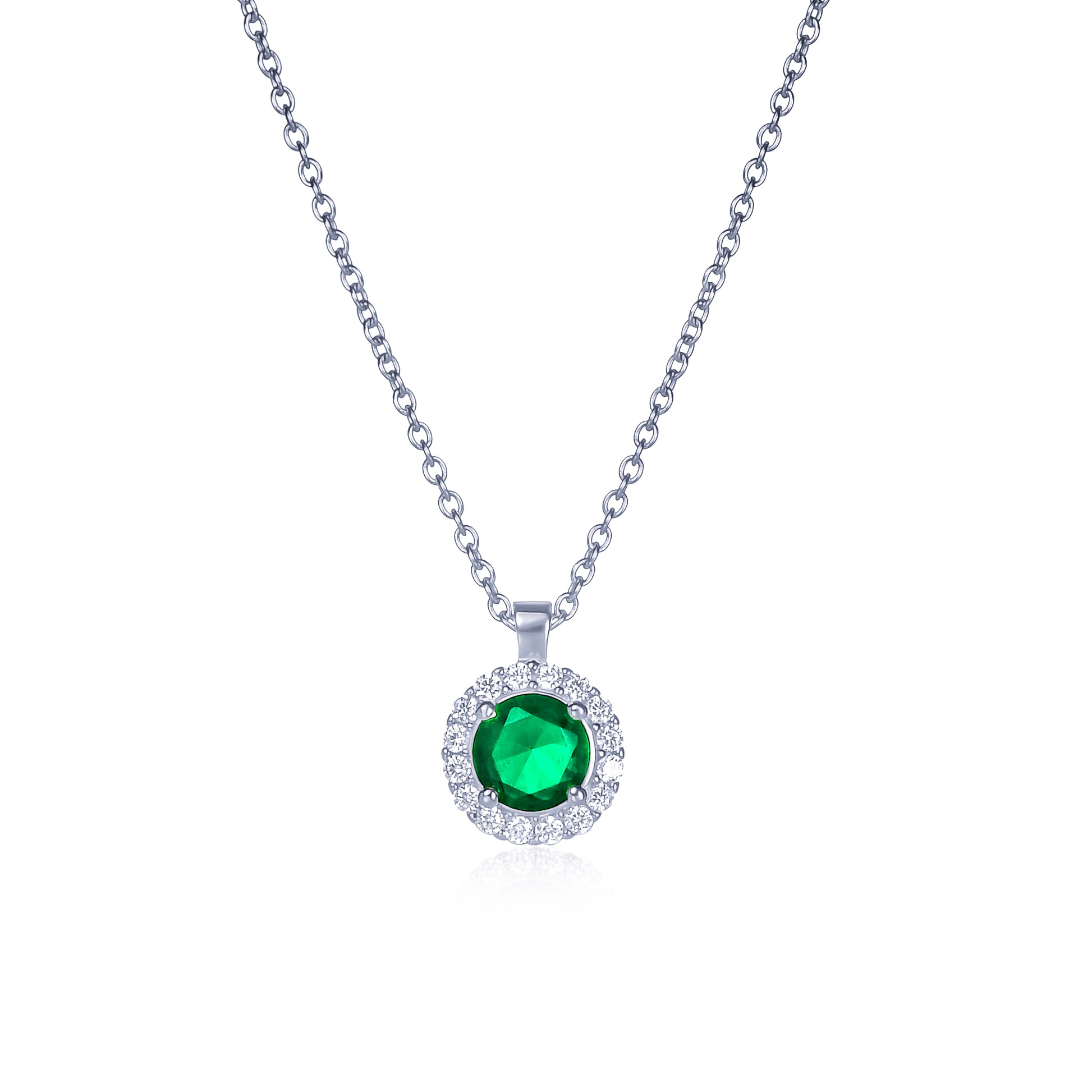• 9 mm x 9 mm round pendant for women with a 6 mm emerald green Cubic Zirconia stone encircled by a halo of smaller white stones on an adjustable 18” chain, including 2-inch extension links.