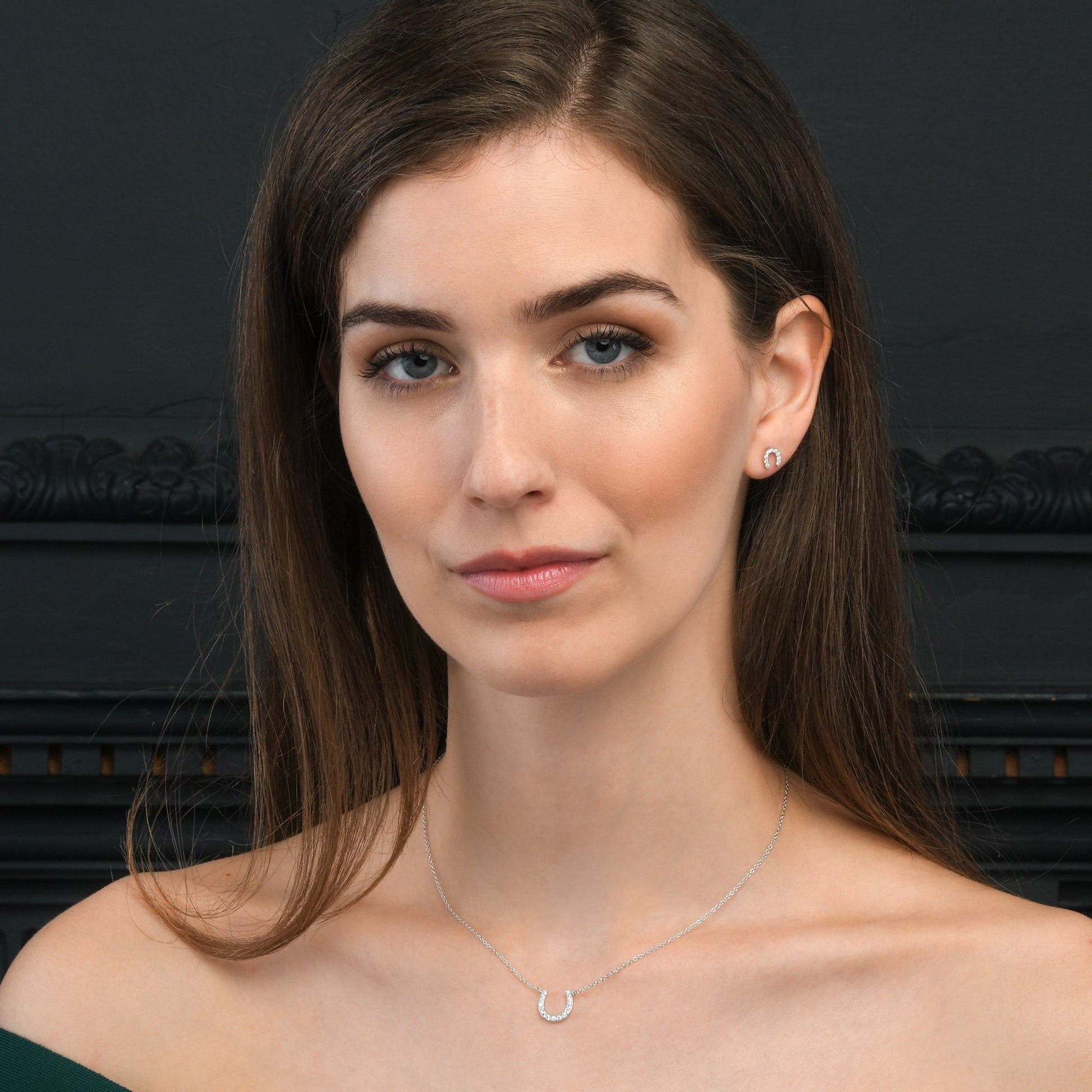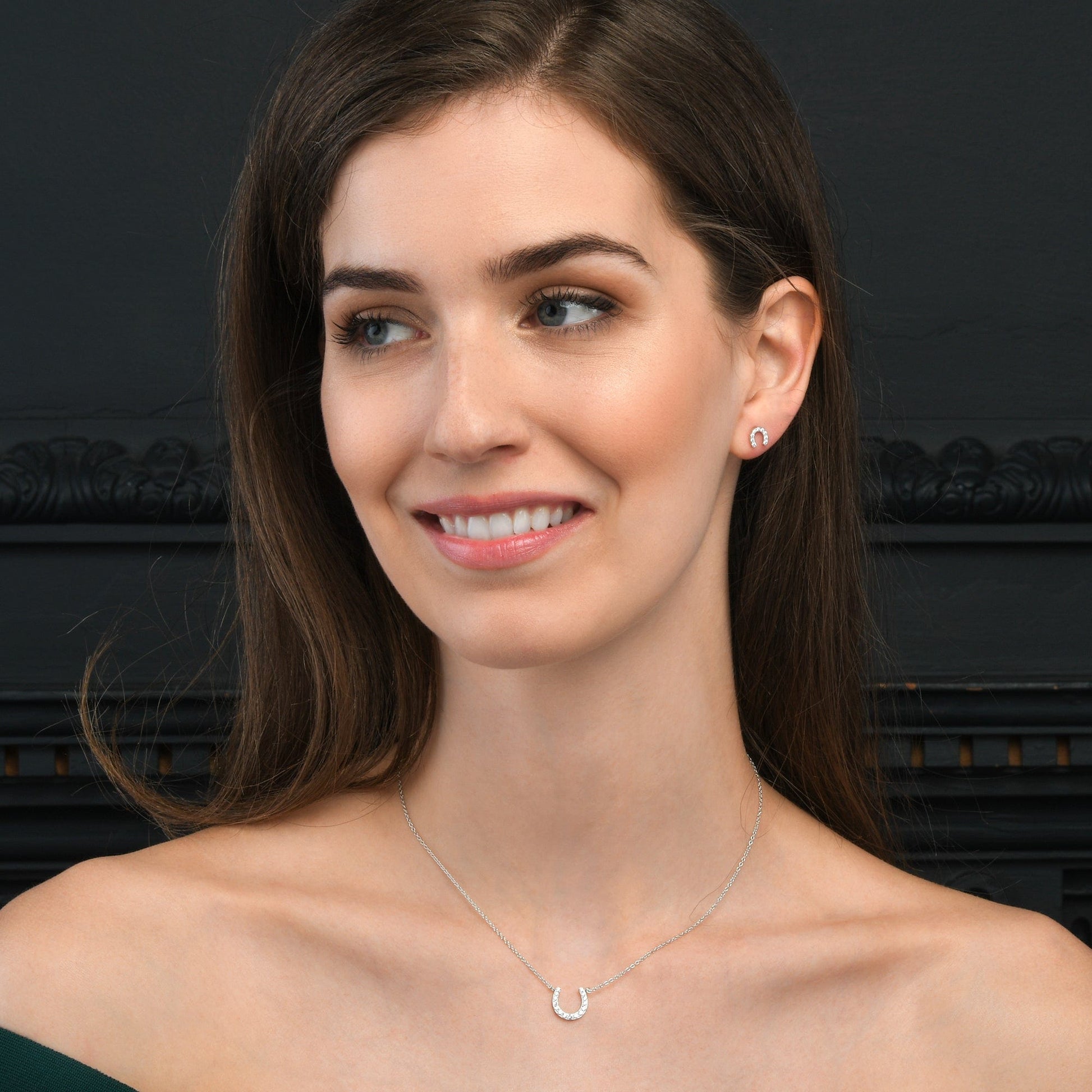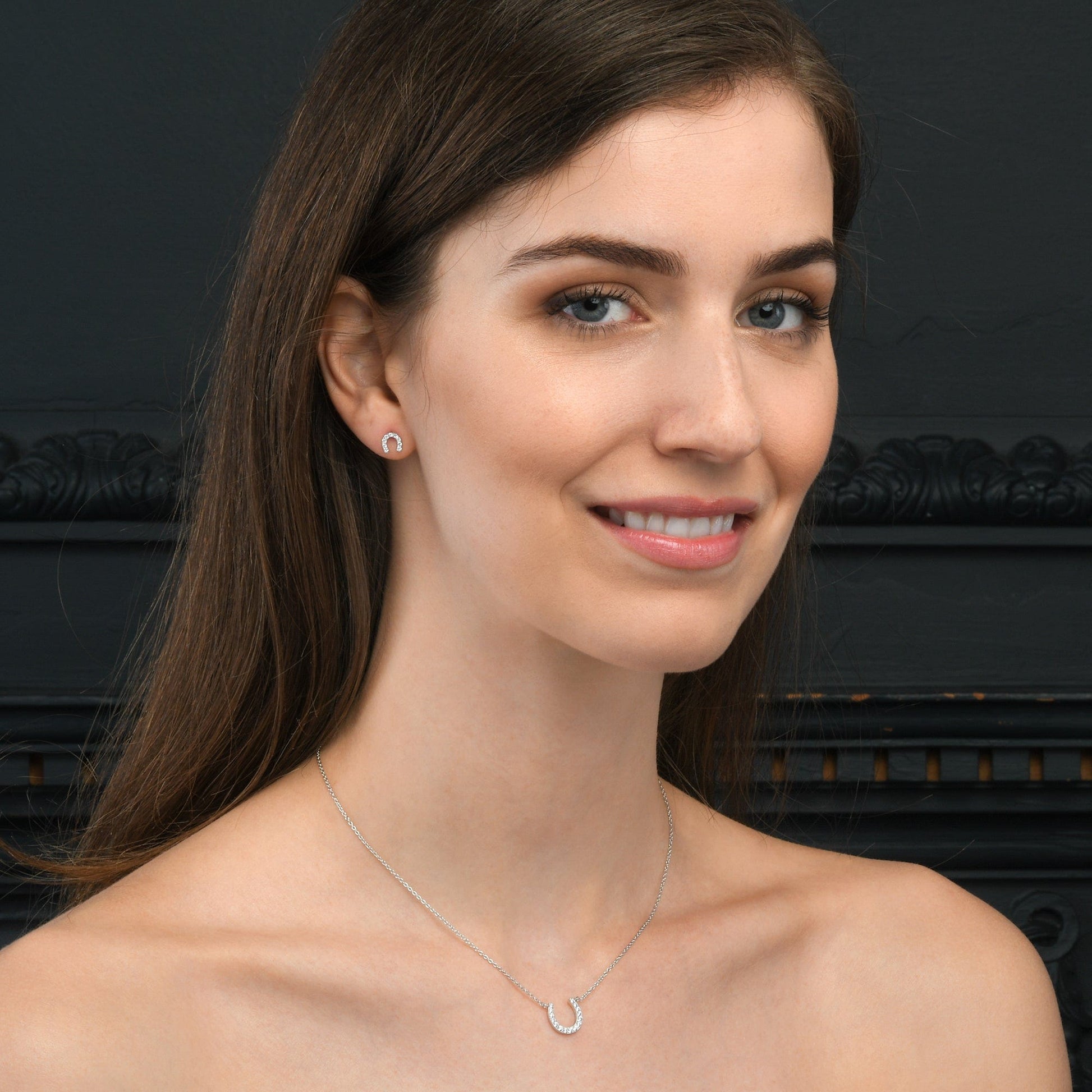 - Silver lucky horseshoe stud earrings for women with clear AAA cubic zirconia stones