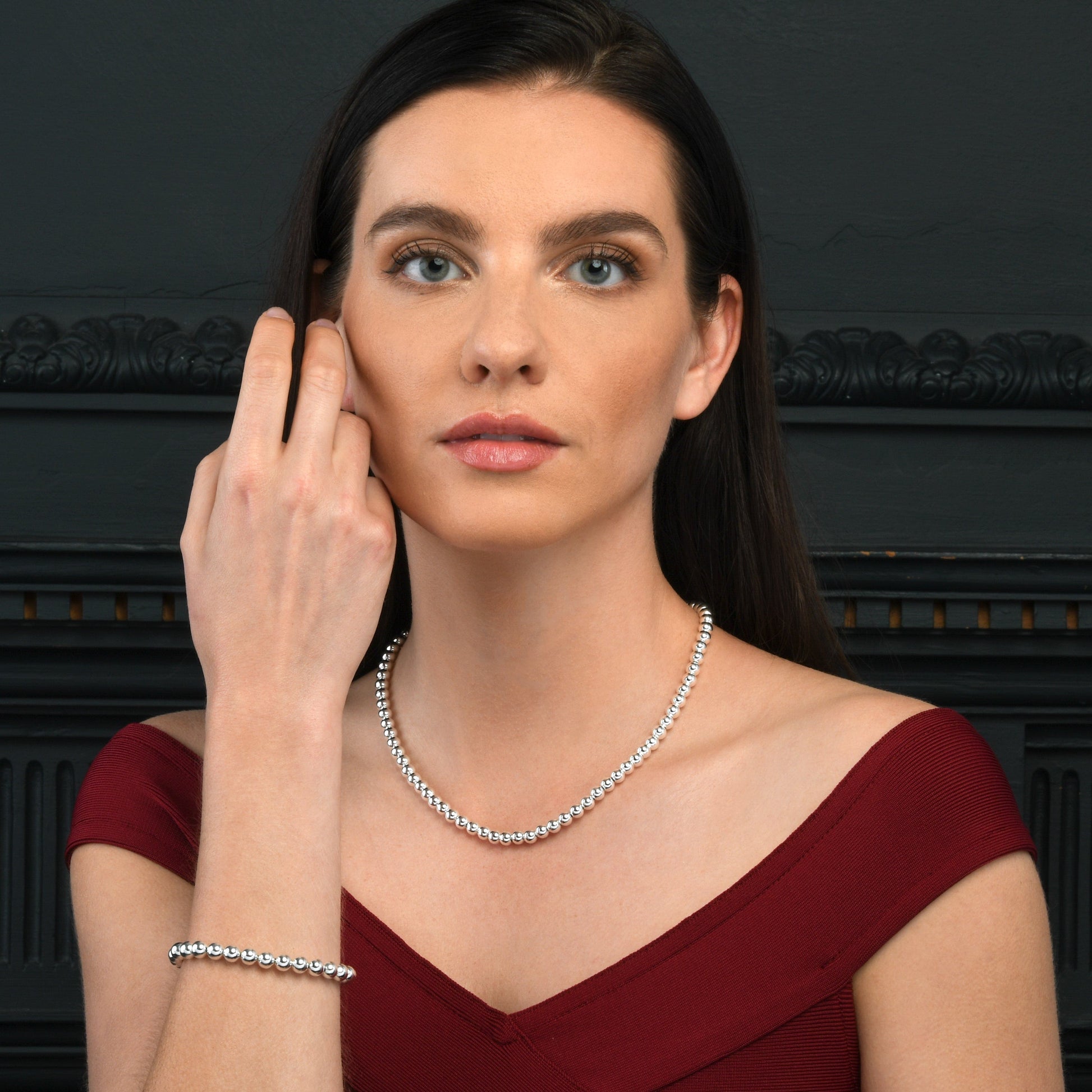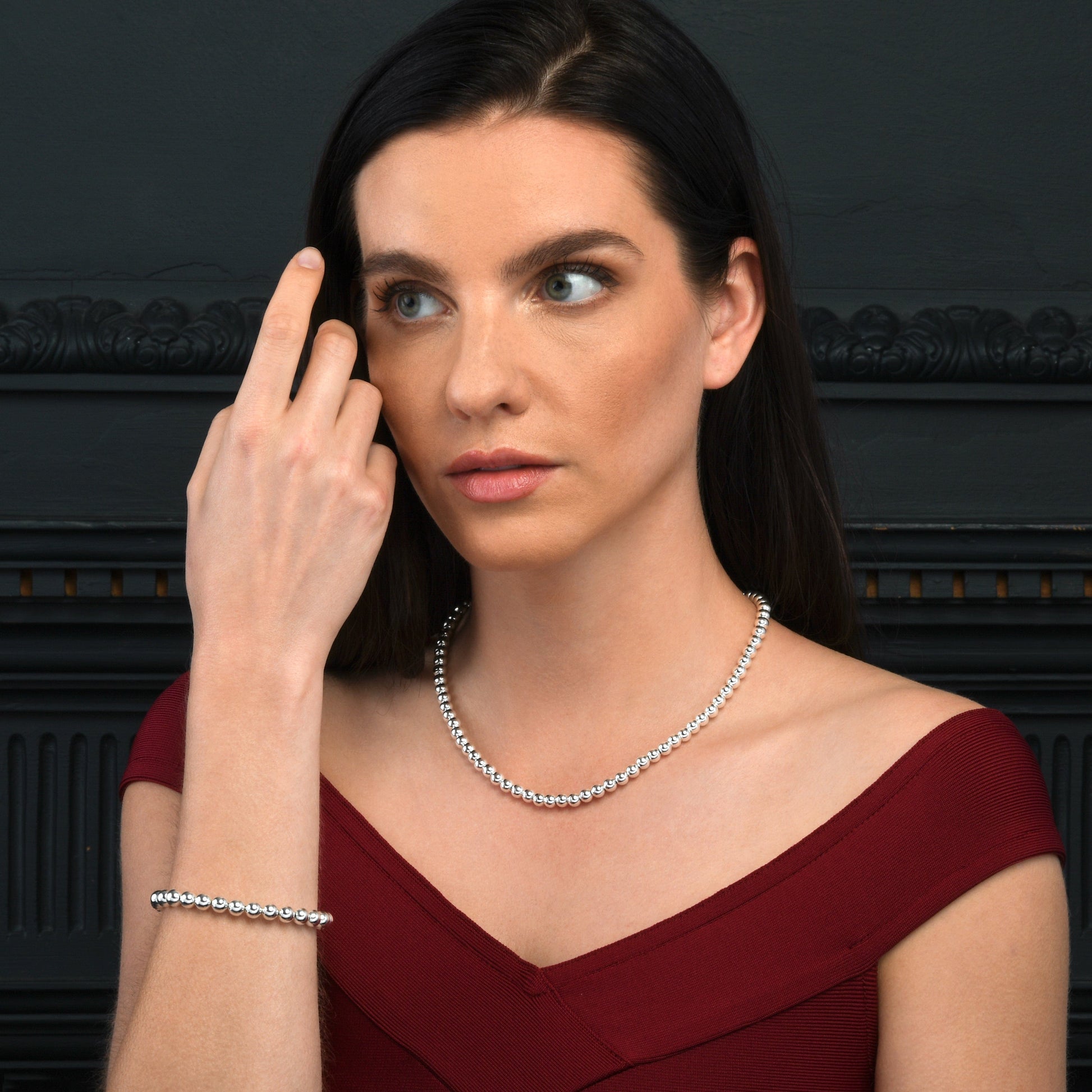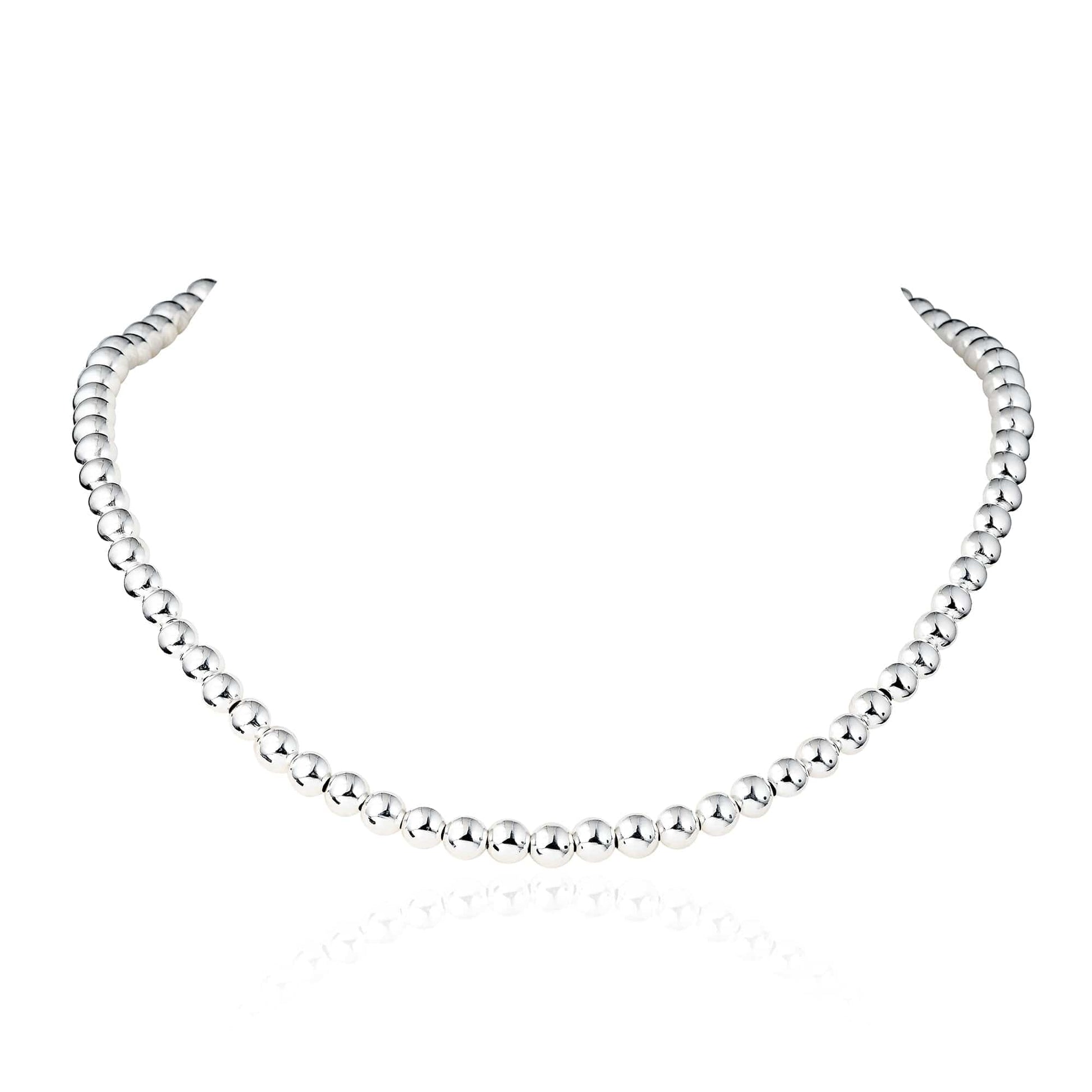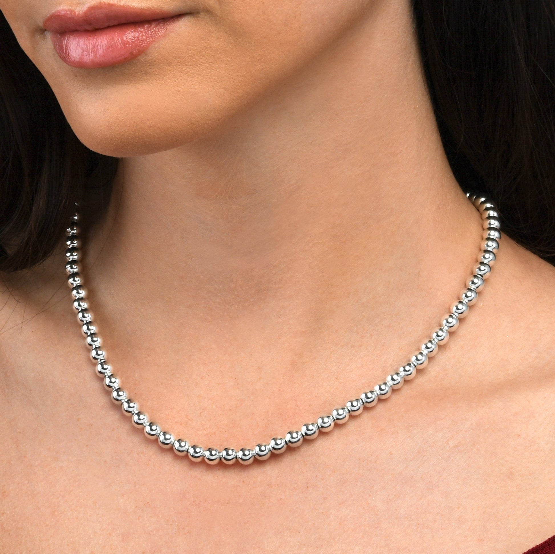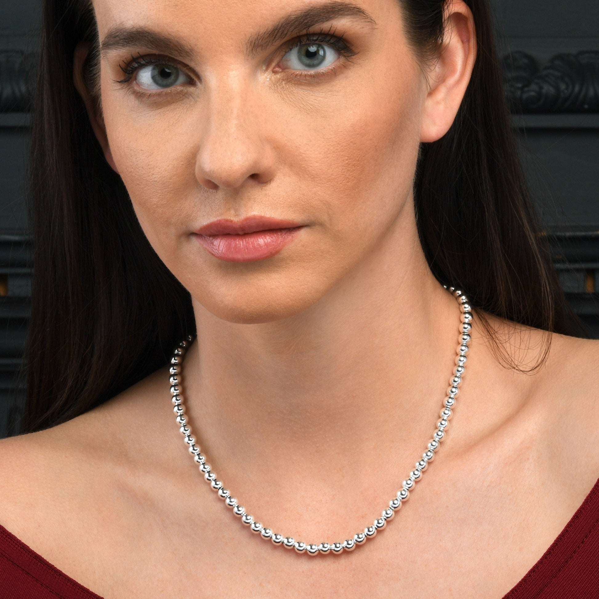 - Beautiful statement necklace with 6mm silver beads all the way around threaded on a silver chain made from Rhodium plated 925 Sterling Silver