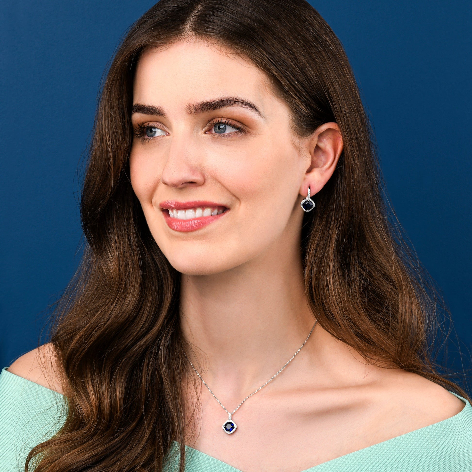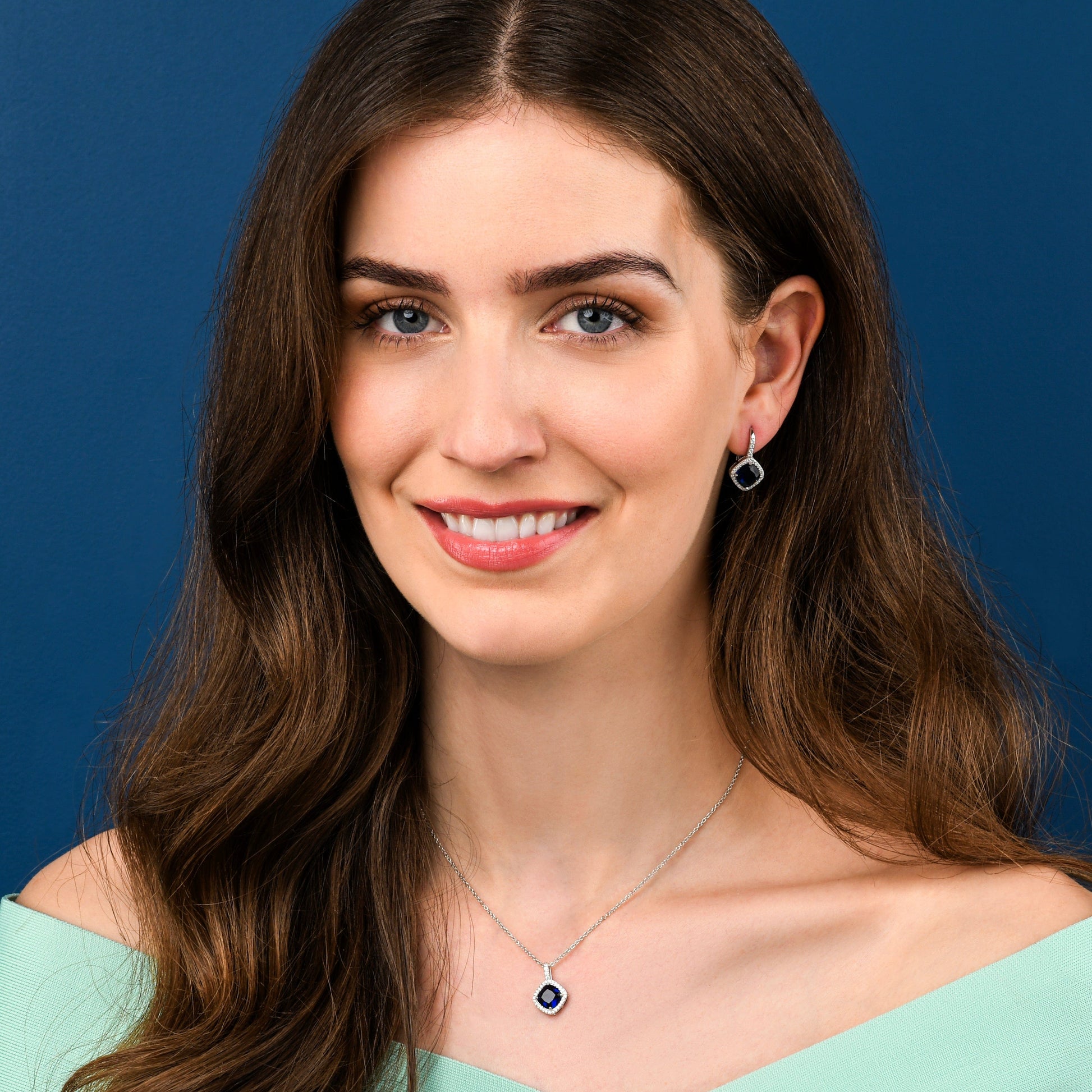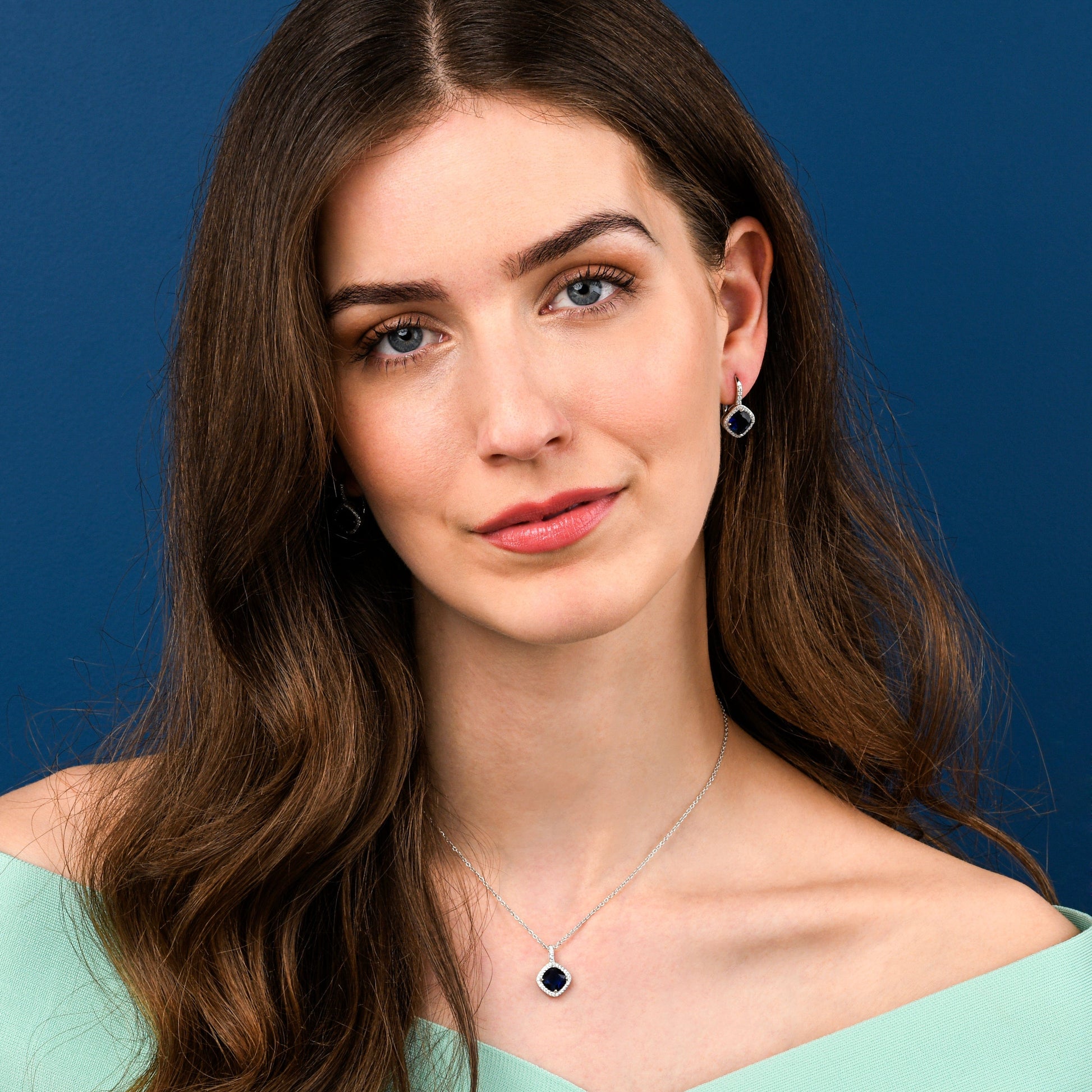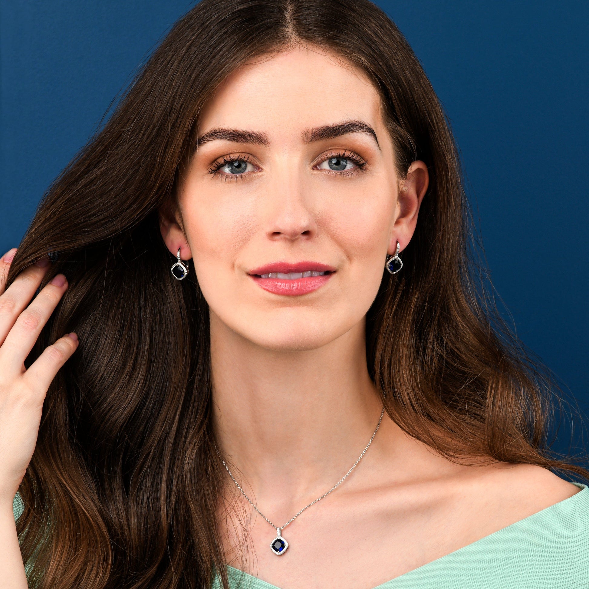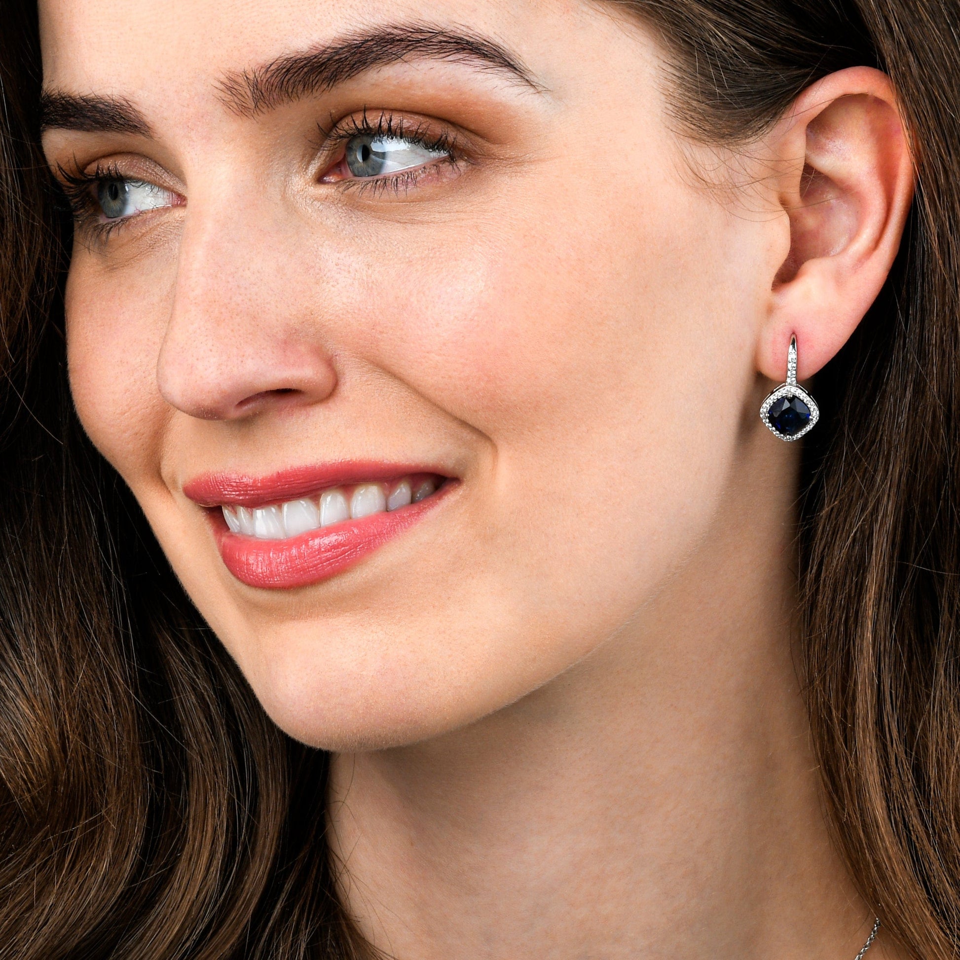 • Sterling silver blue drop earrings for women and girls. Elegant 925 sterling silver earrings for women with leverback clasps and cushion-shaped sapphire blue and clear AAA Cubic Zirconia stones.