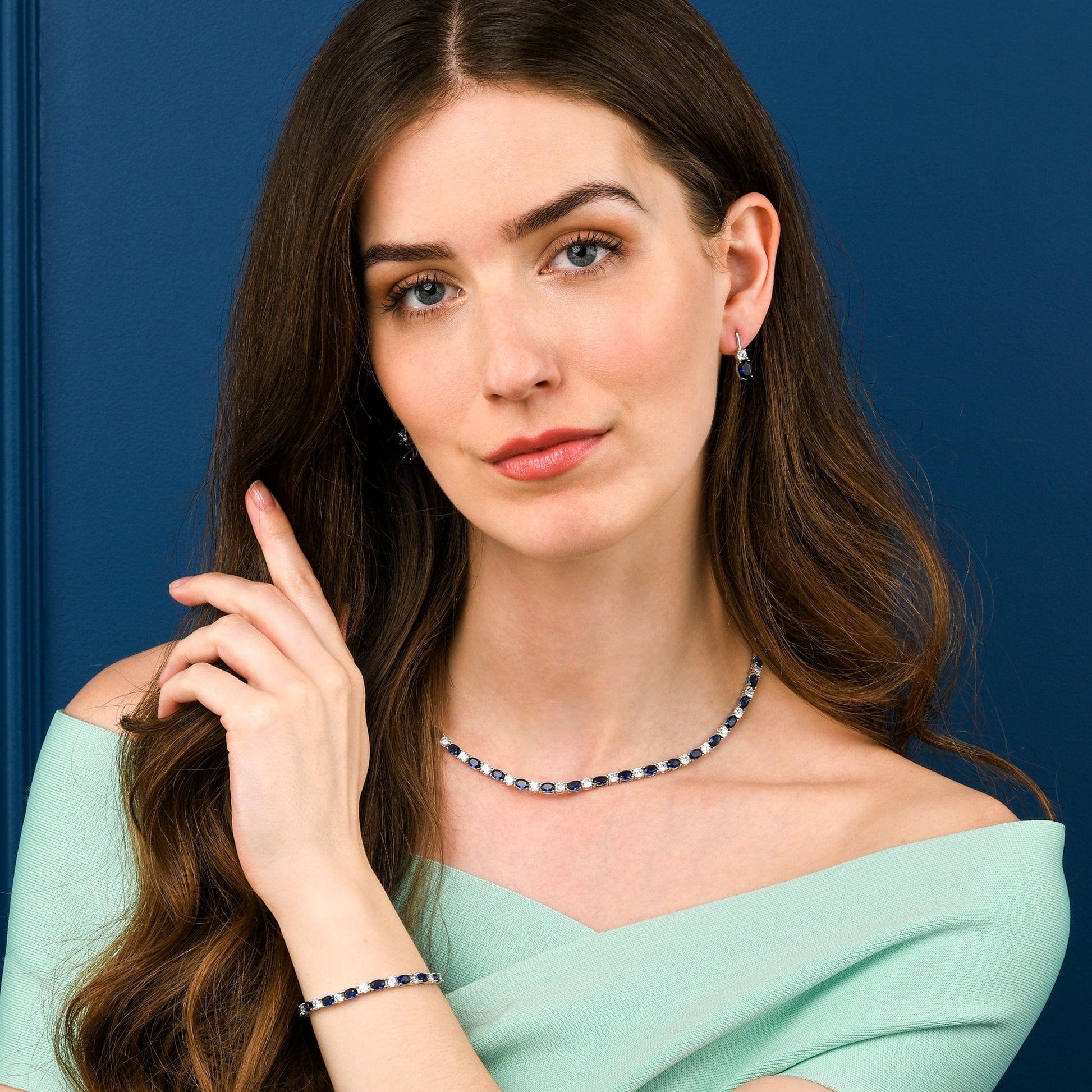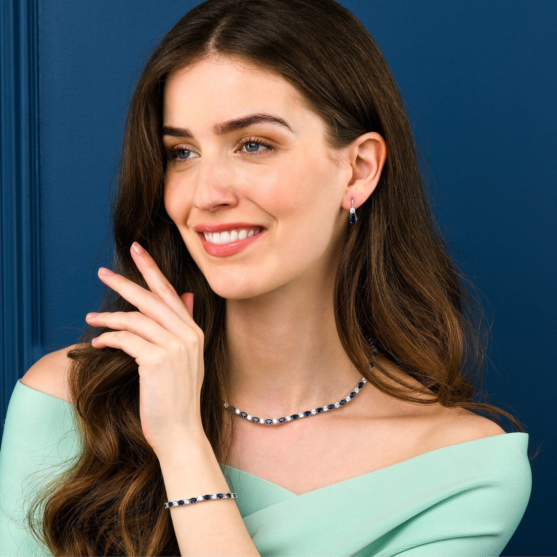 • Sterling silver blue drop earrings for women and girls. Elegant 925 sterling silver earrings for women with leverback clasps and sapphire blue and clear AAA Cubic Zirconia stones.