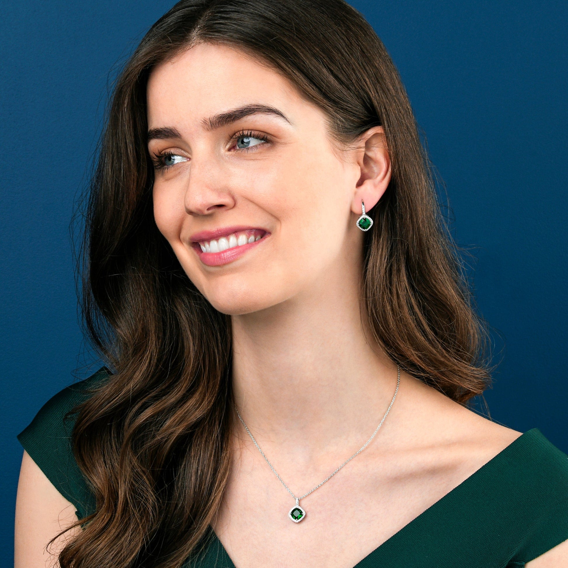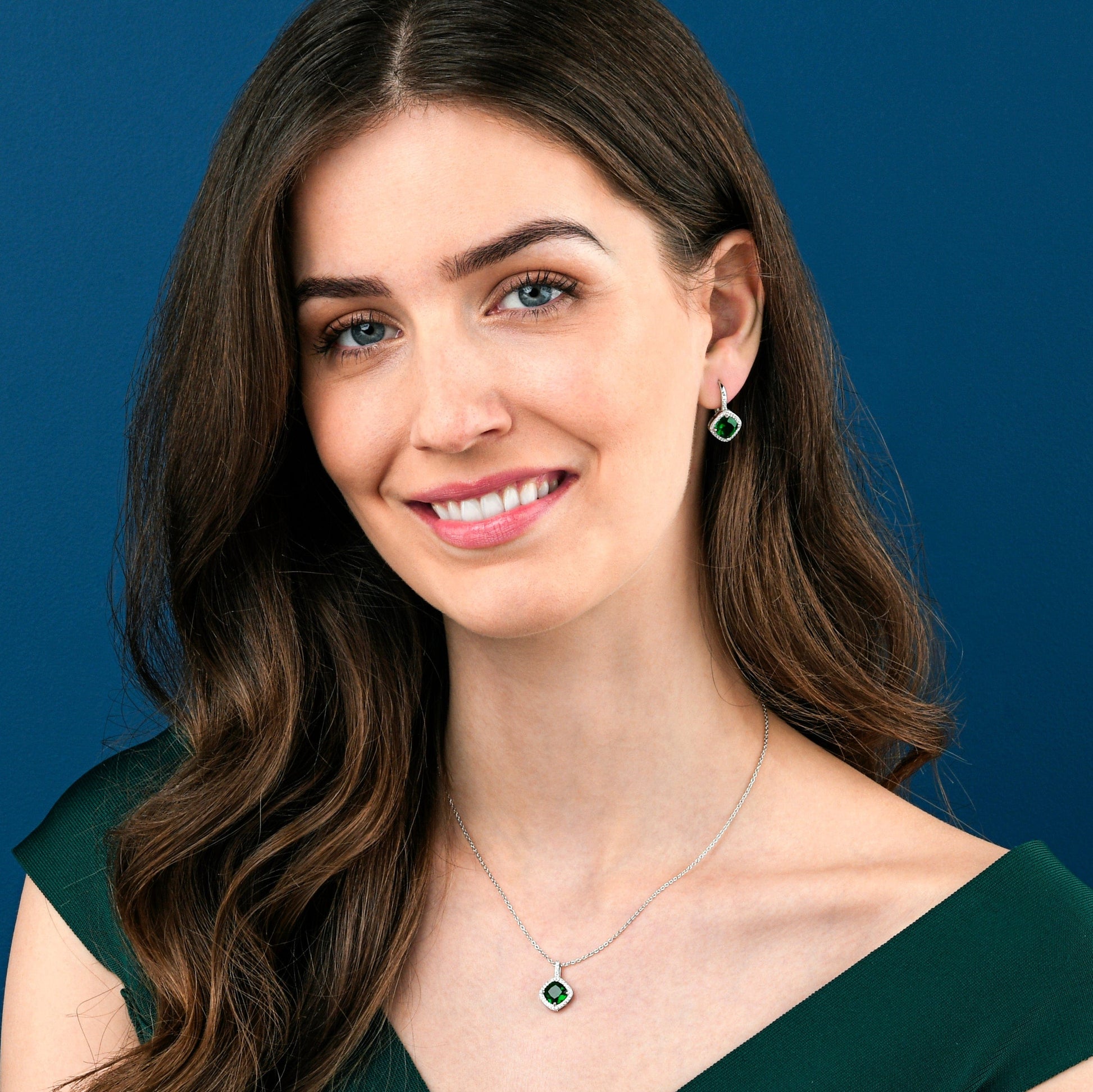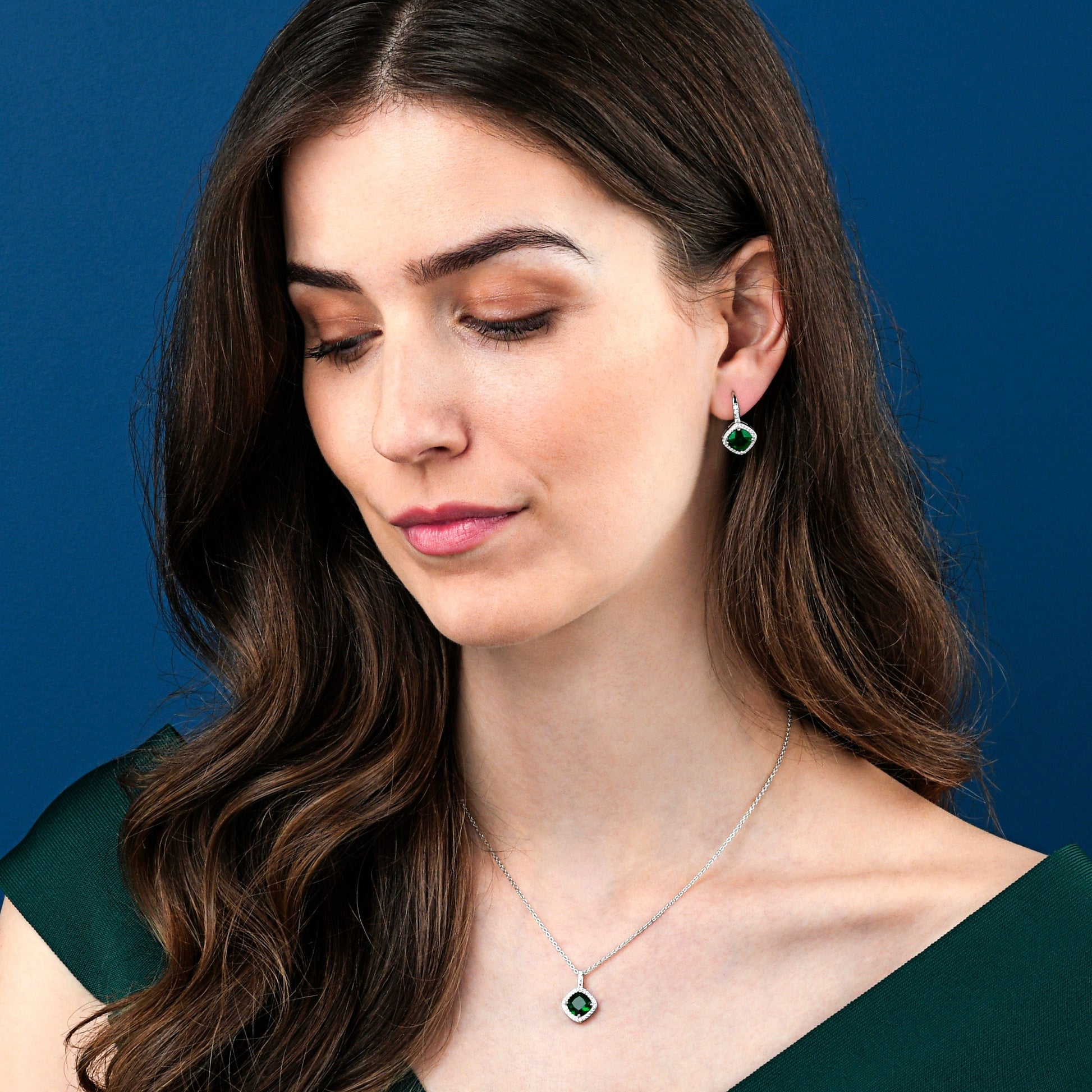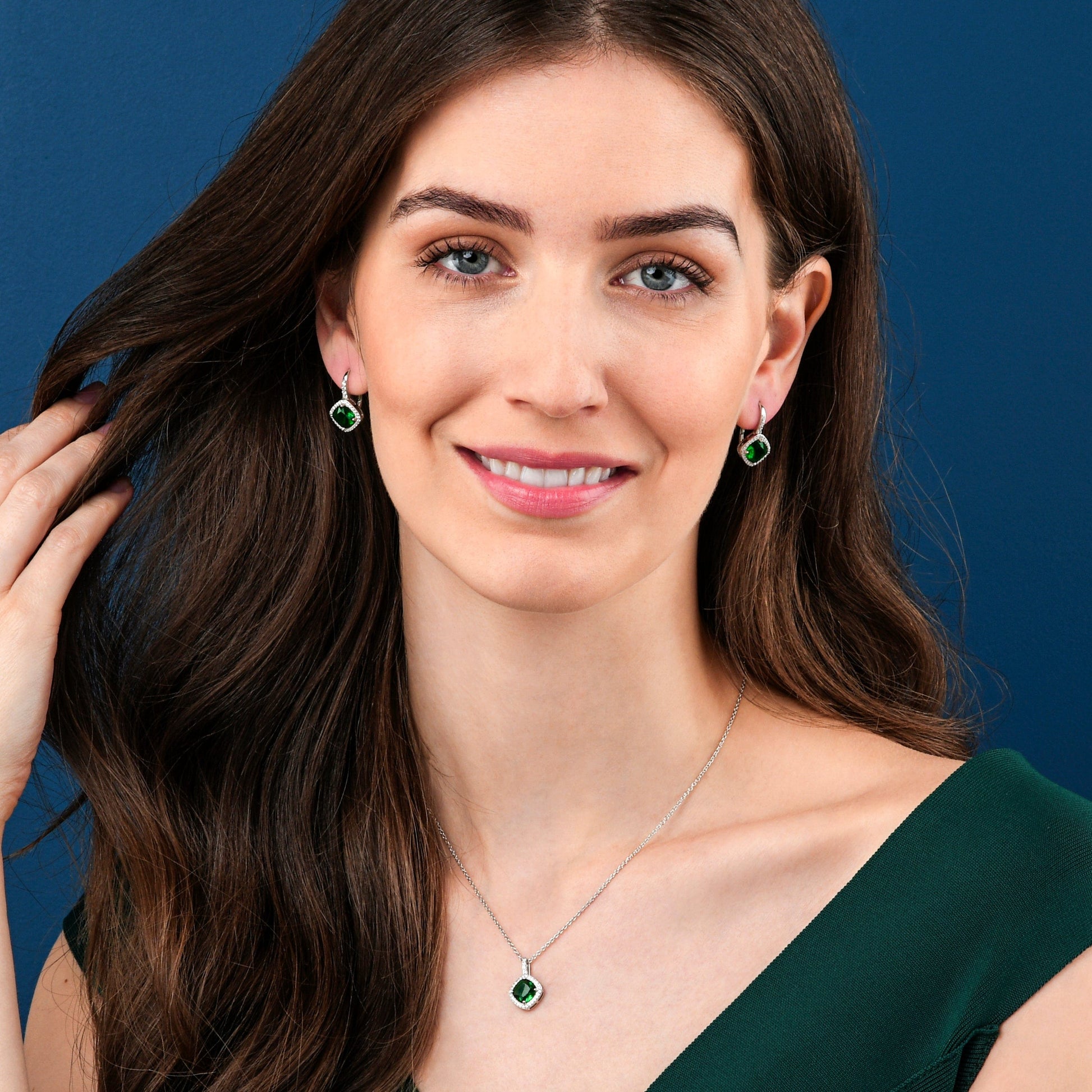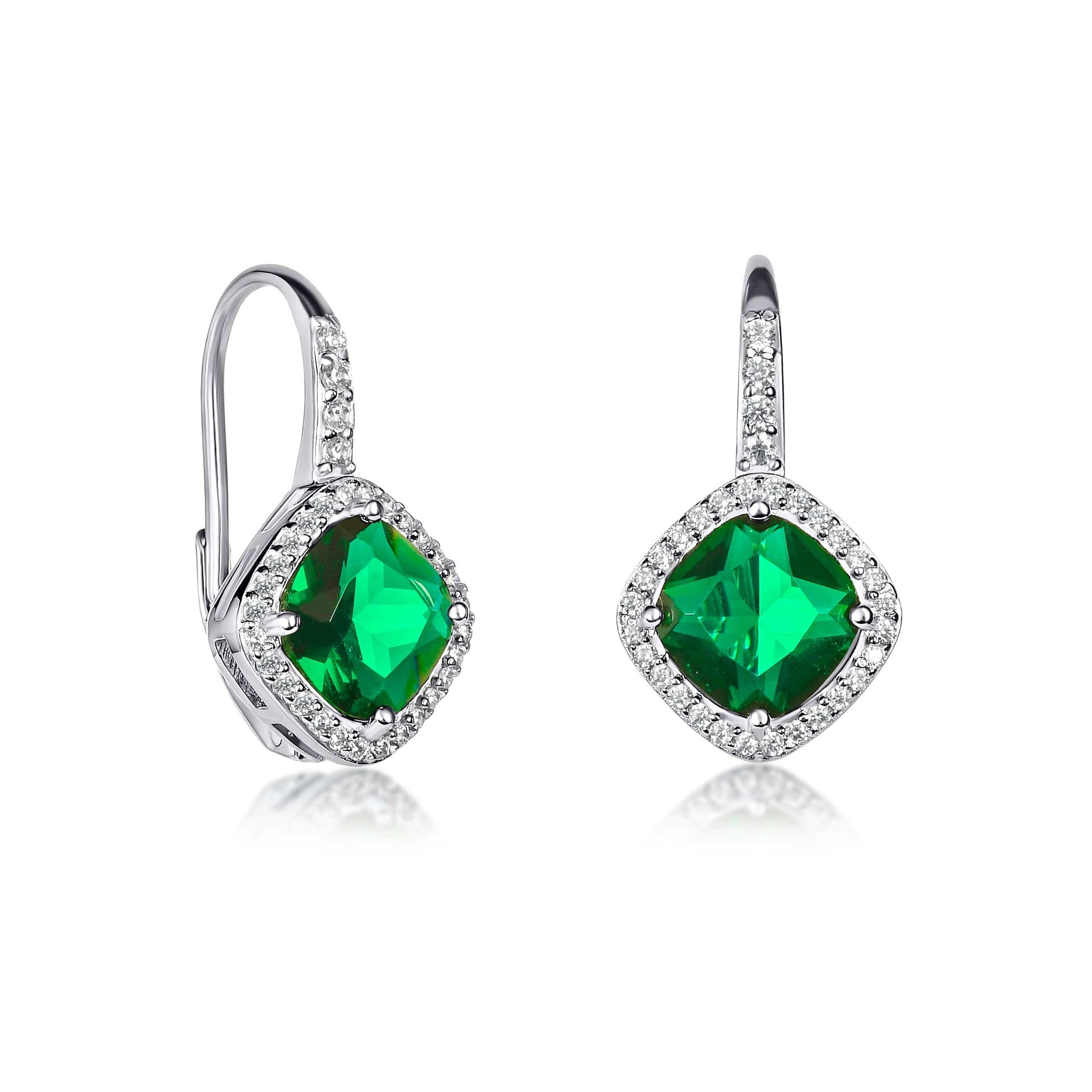 • Sterling silver green drop earrings for women and girls. Elegant 925 sterling silver earrings for women with leverback clasps and cushion-shaped emerald green and clear AAA Cubic Zirconia stones.