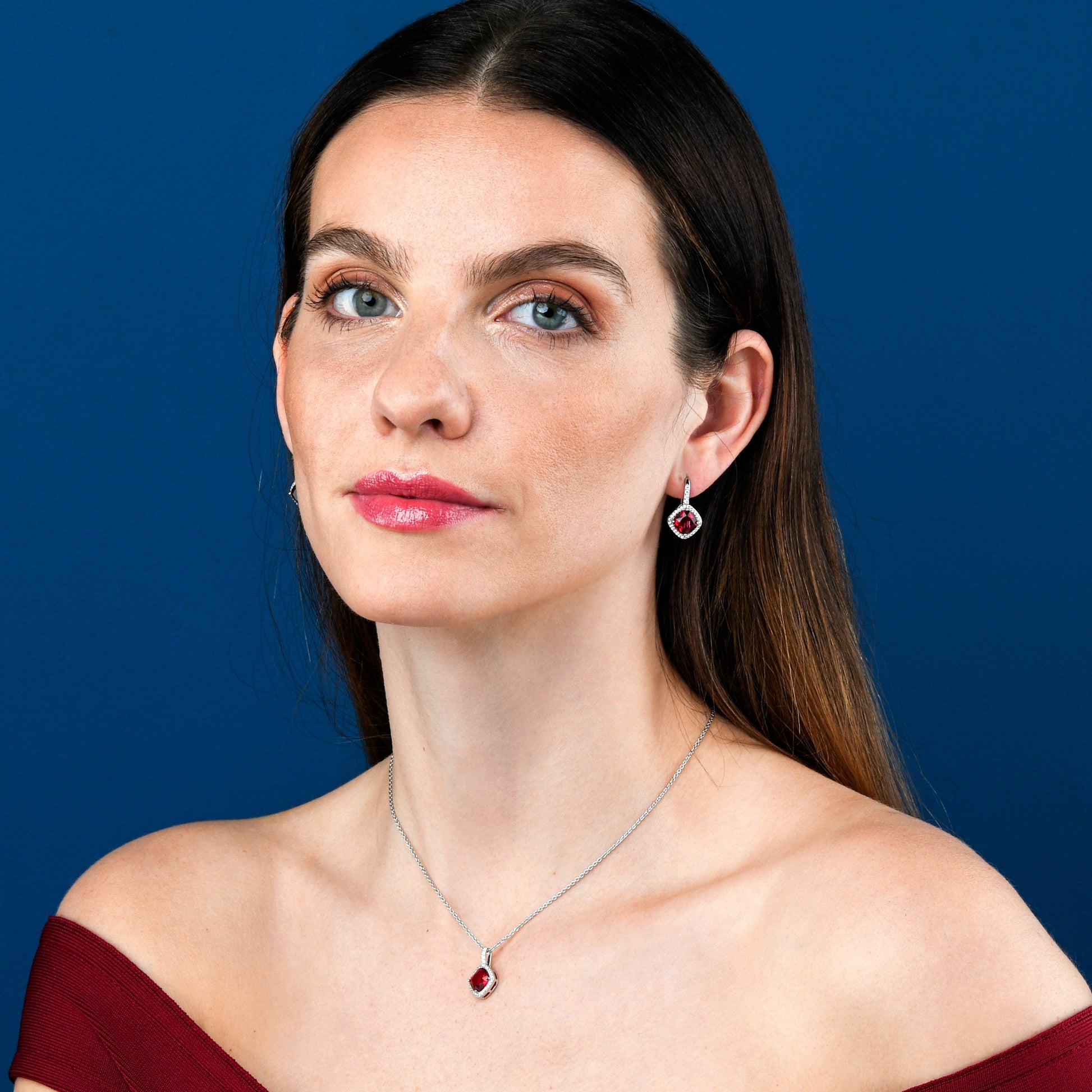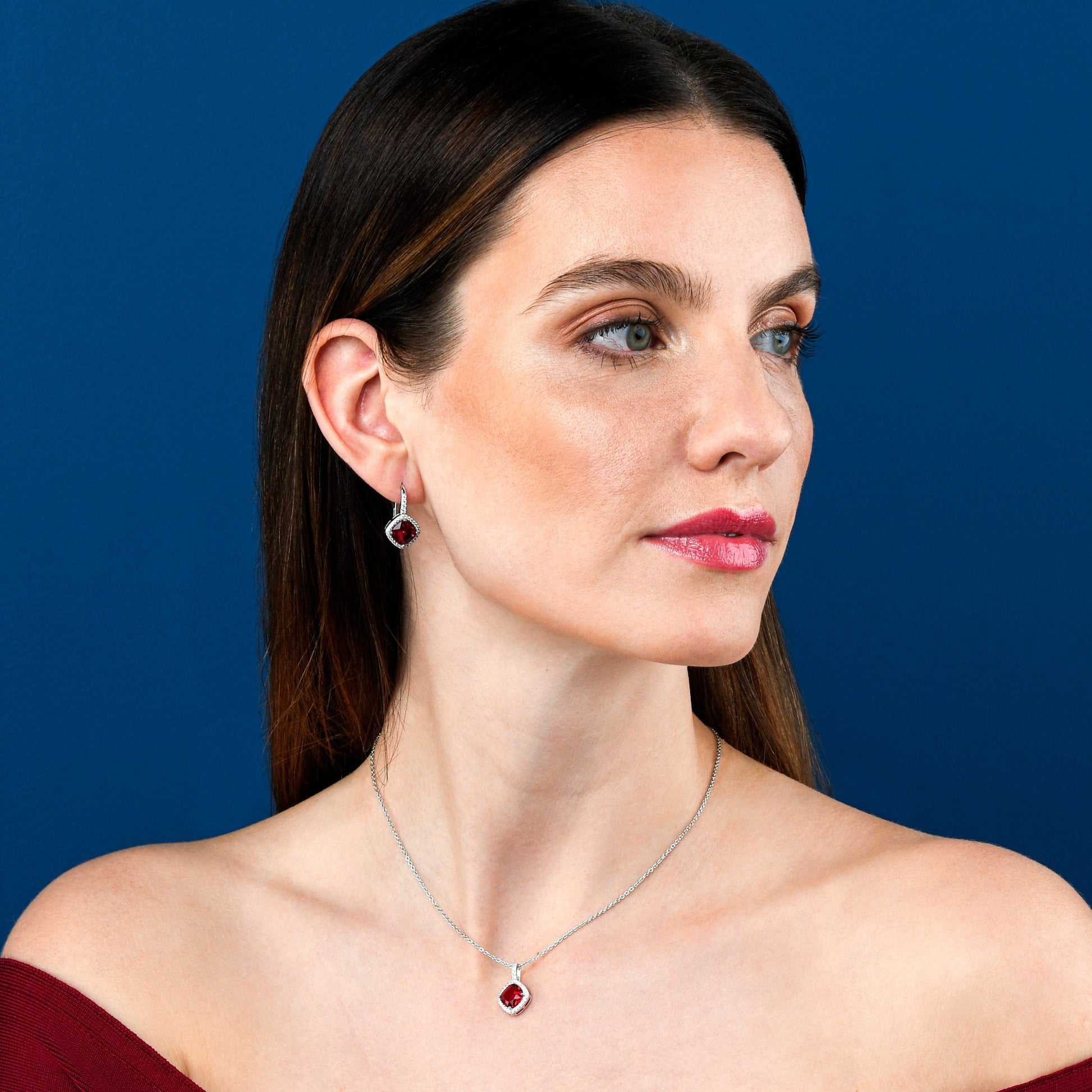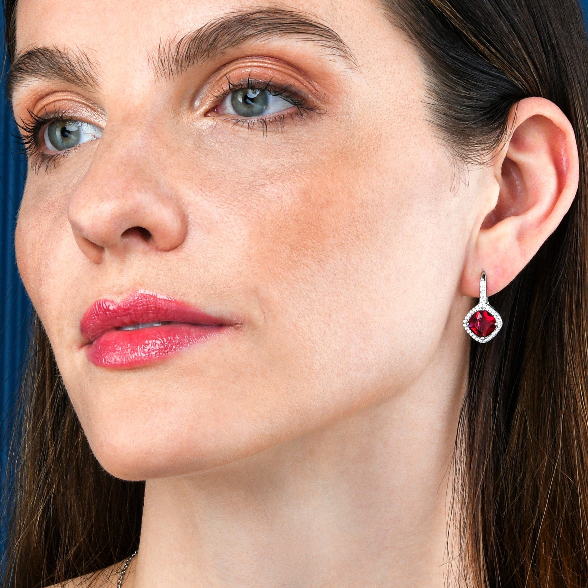 • Sterling silver red drop earrings for women and girls. Elegant 925 sterling silver earrings for women with leverback clasps and cushion-shaped ruby red and clear AAA Cubic Zirconia stones.