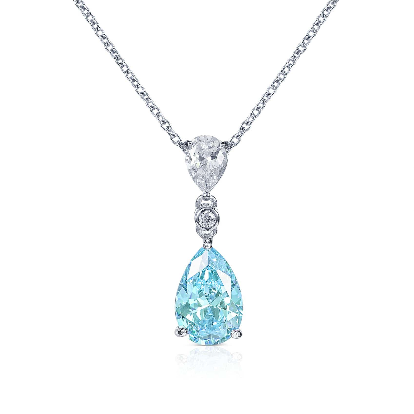 • 25mm long drop pendant set with a 8mm x 12mm pear shaped light Blue cubic zirconia stone and a 5mm x 7mm pear shaped white cubic zirconia stone, pendant on an adjustable 18” chain, including 2-inch extension links.