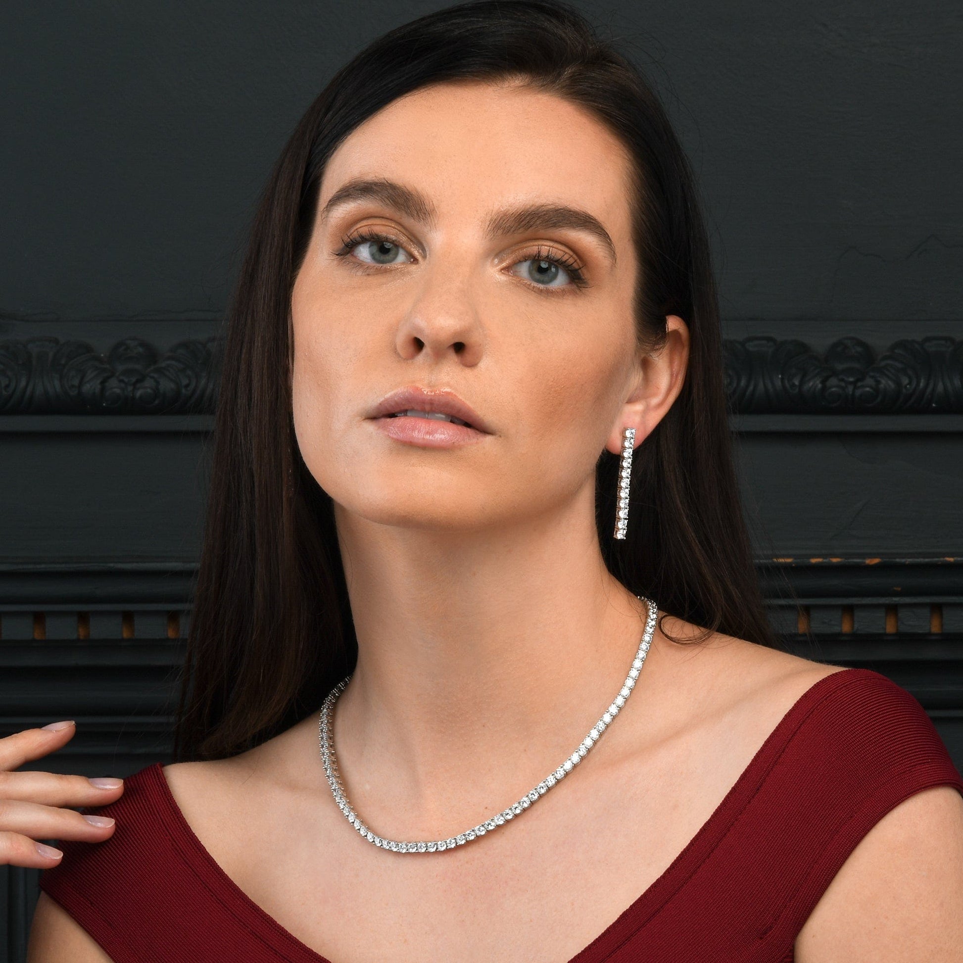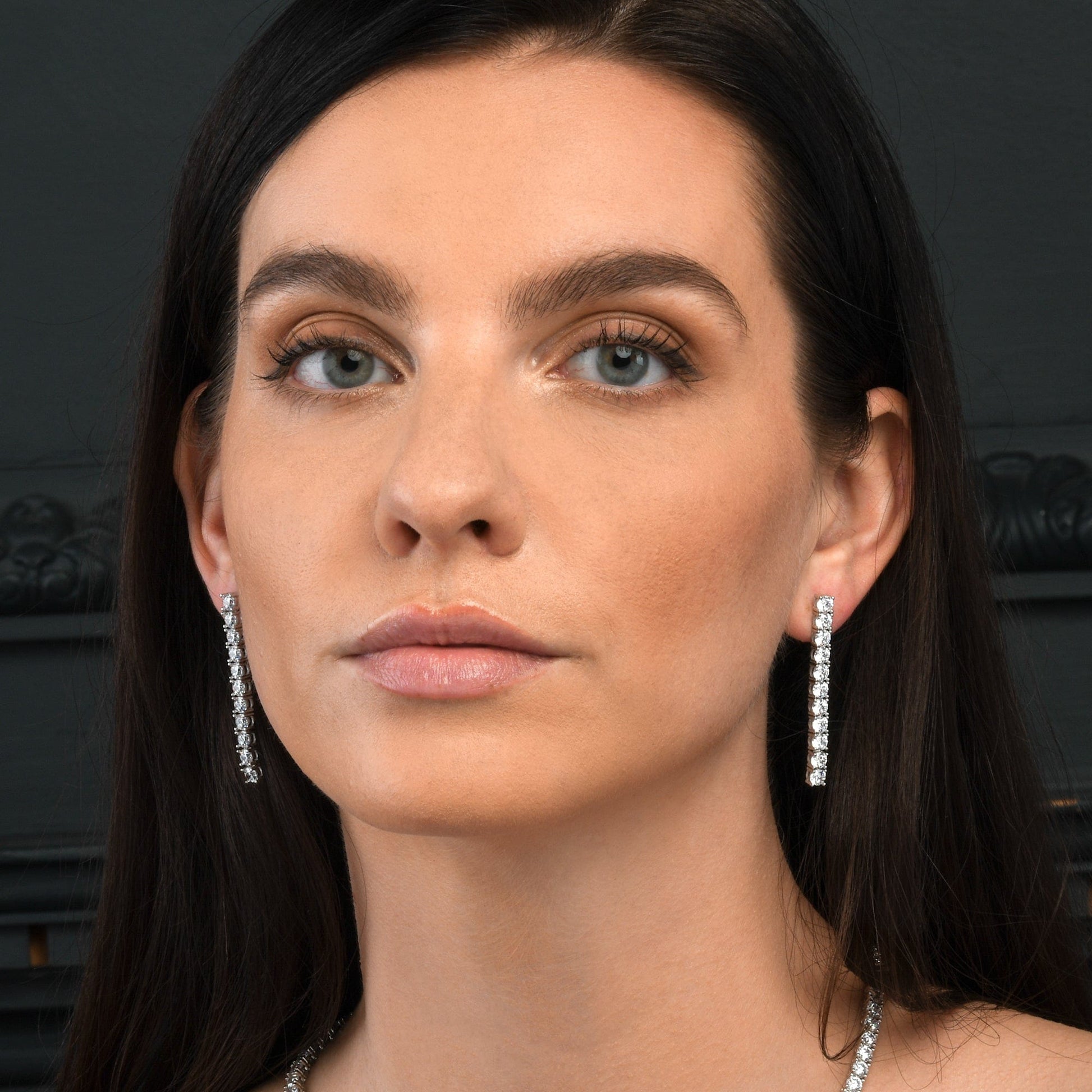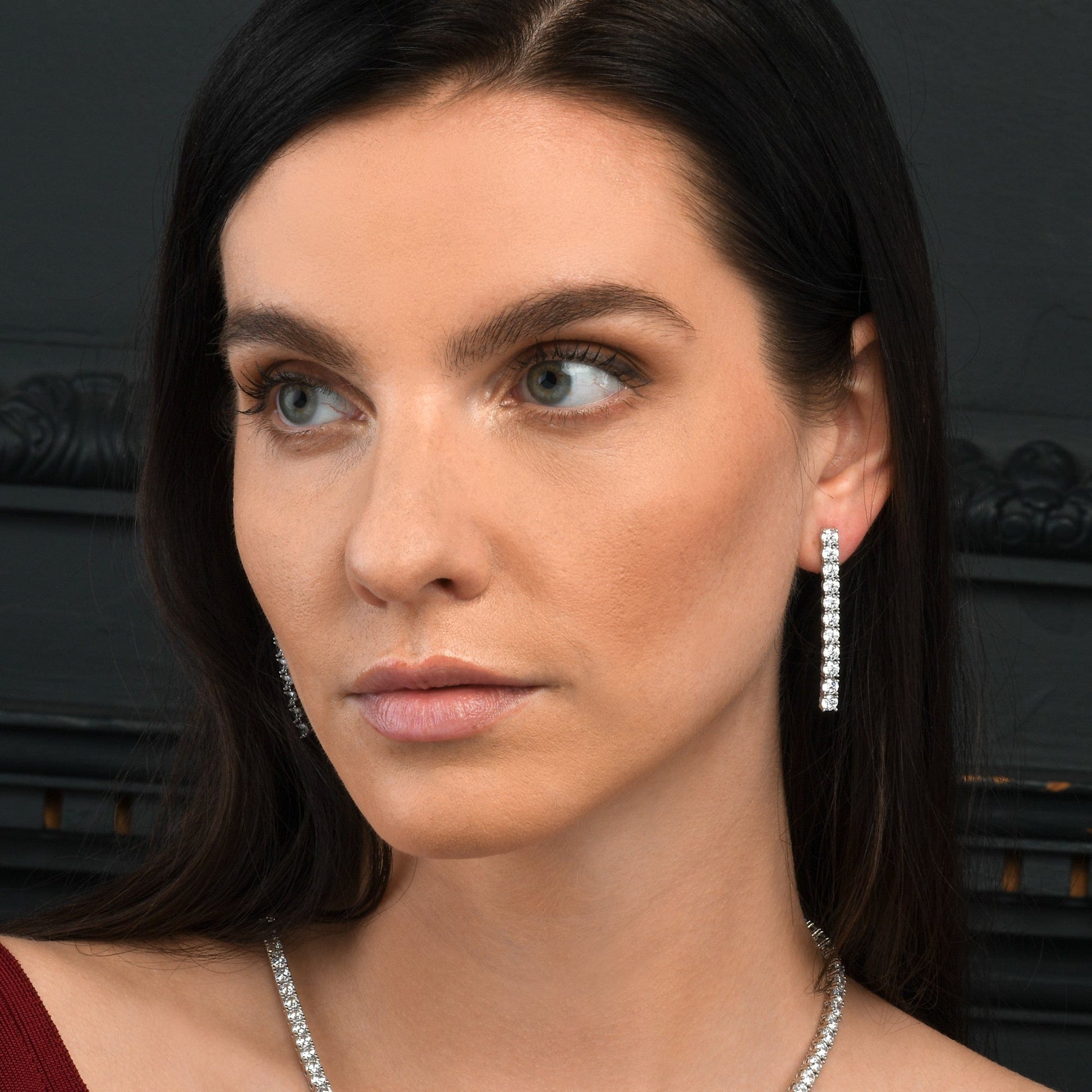 • Stunning dangle earrings for women and teenage girls. Elegant drop earrings set with sparkling Cubic Zirconia stones in a single line.