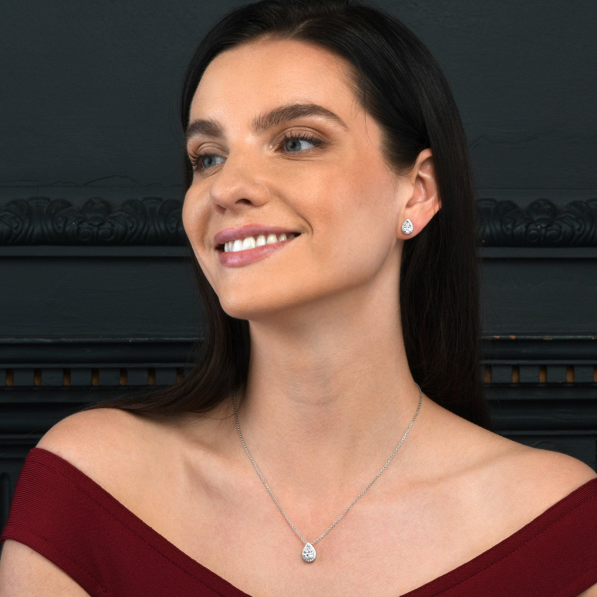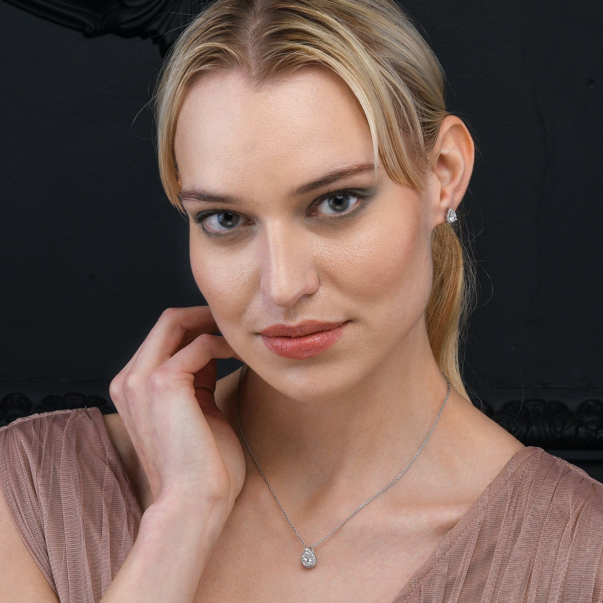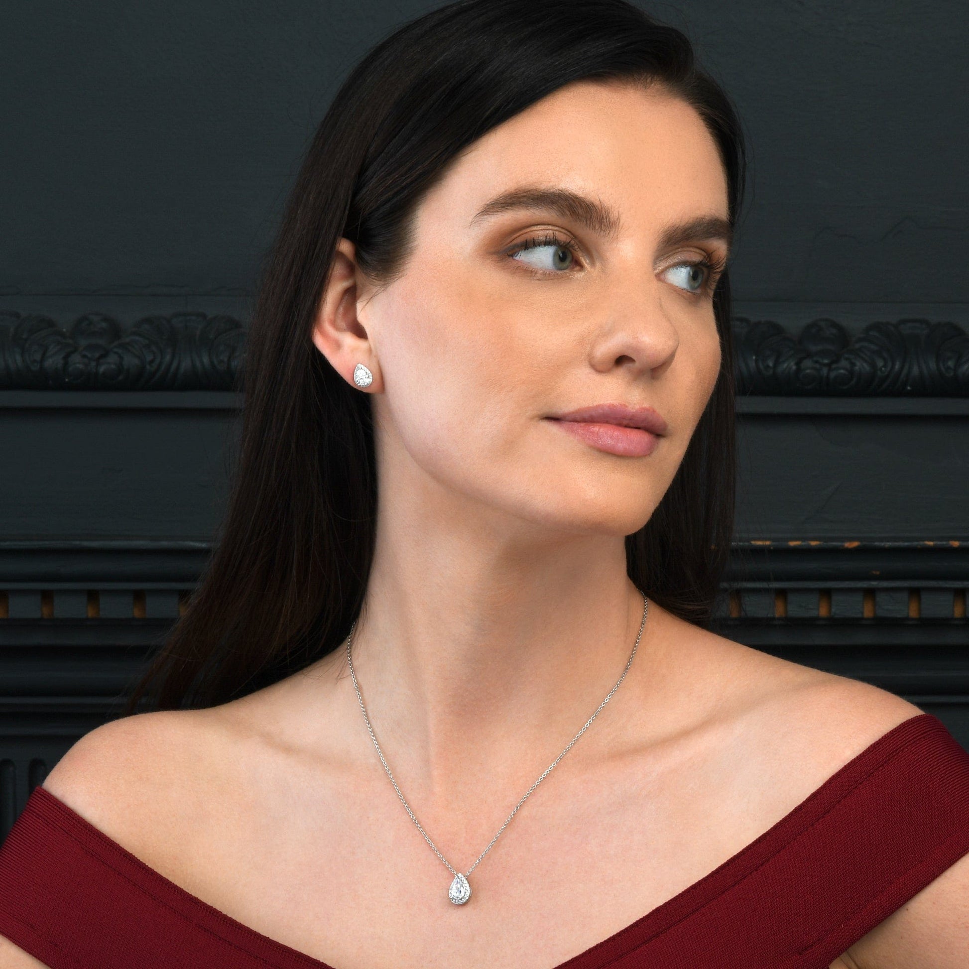 • 9 mm x 12.5 mm pear shaped halo pendant for women with 6 mm x 9 mm white stone encircled by a halo of smaller white stones on an adjustable 18” chain, including 2-inch extension links.