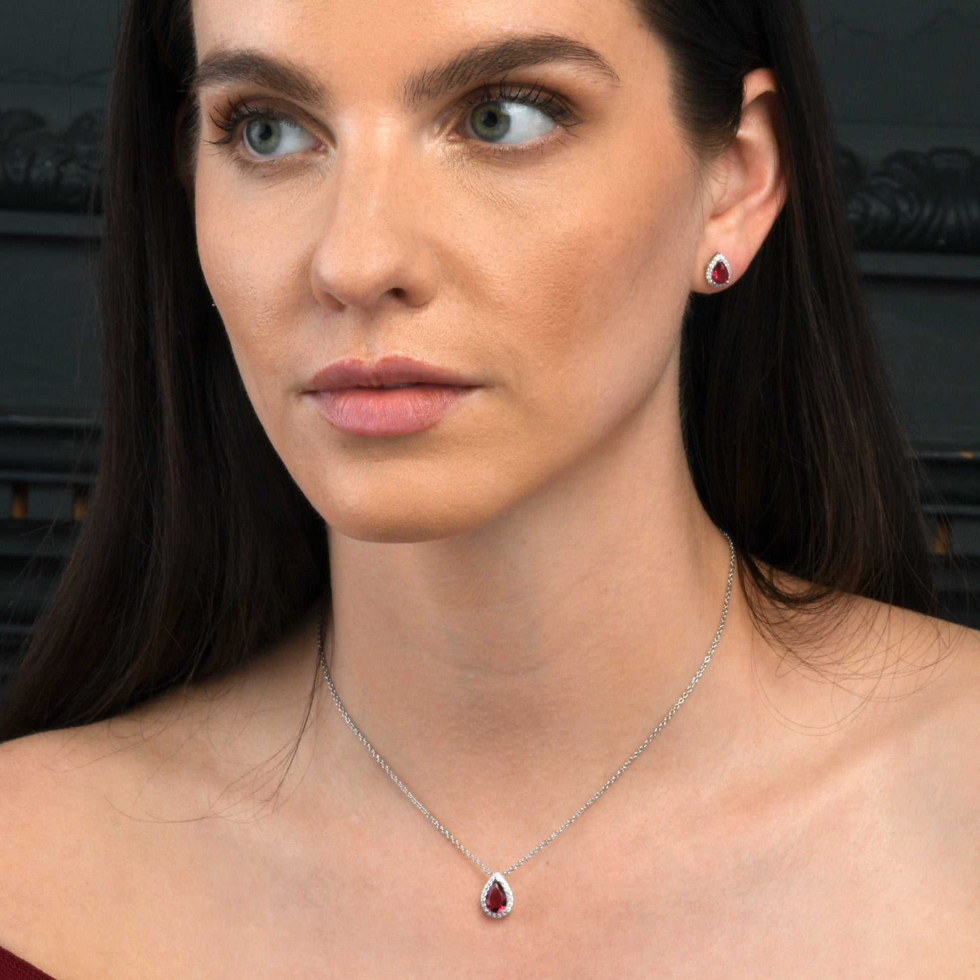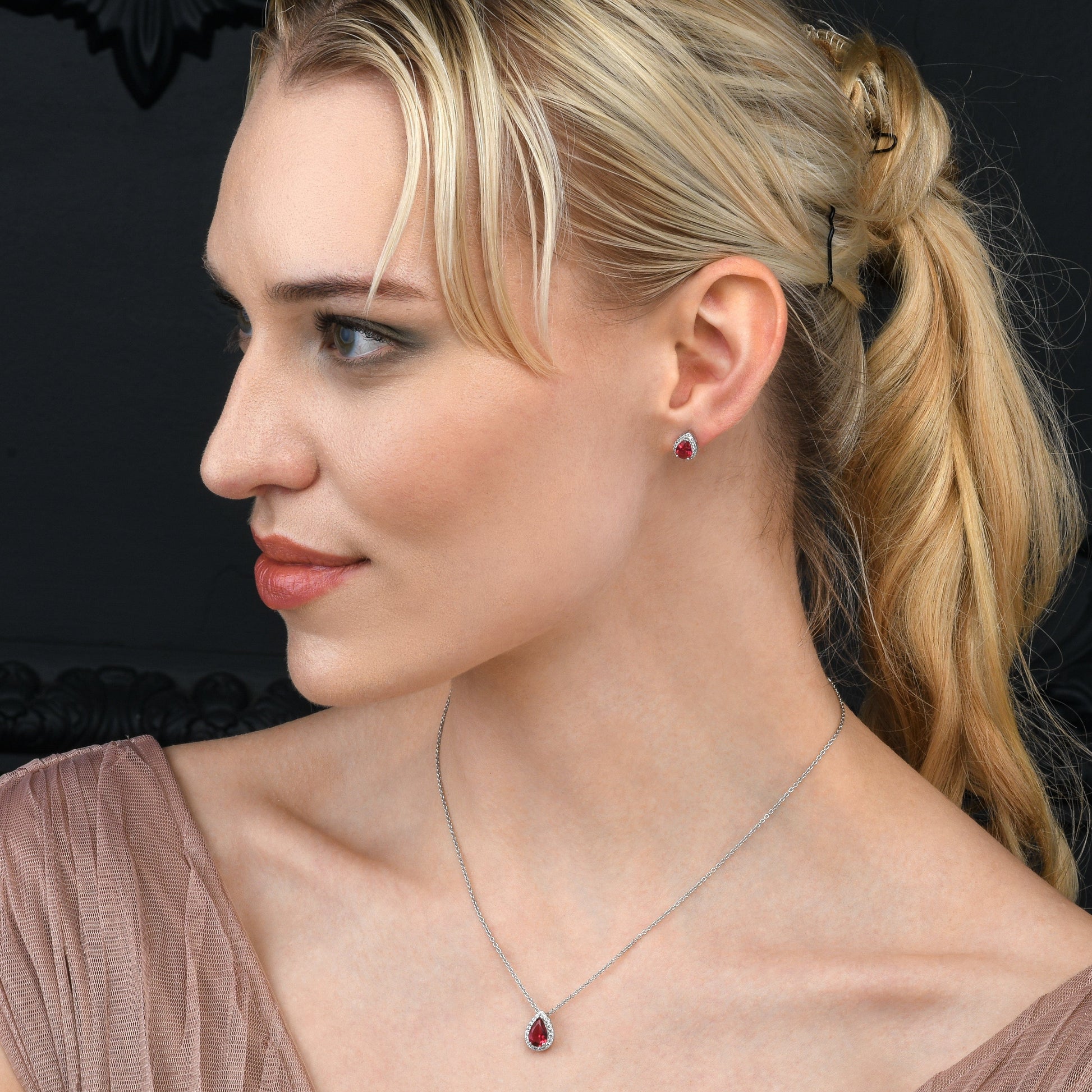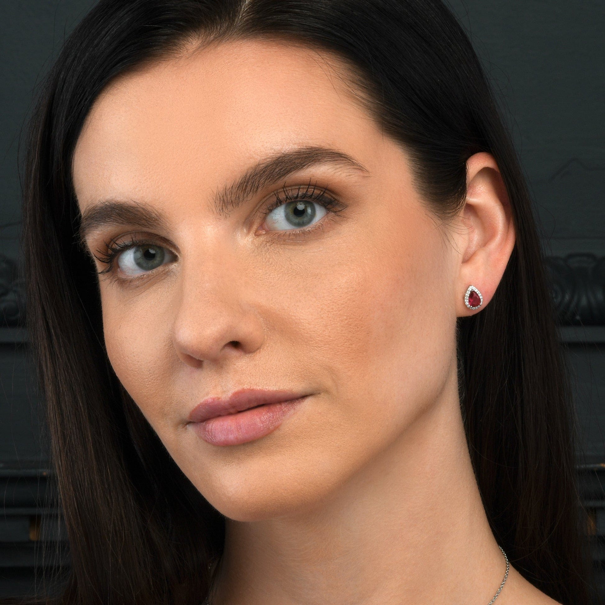 • 7.5mm x 9.5mm cute pear shaped studs are set with 5mm x 7mm pear cut ruby red cubic zirconia stones and 1.5mm small sparkling white cubic zirconia stones.