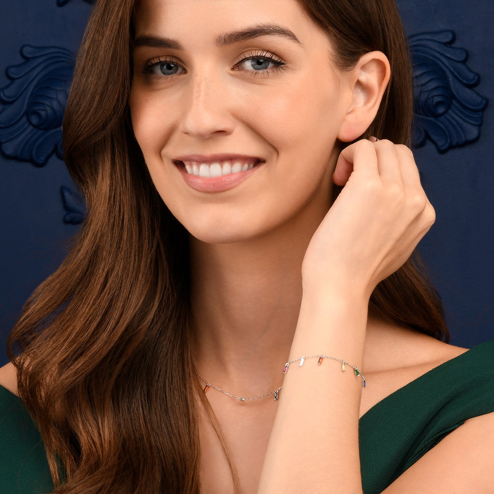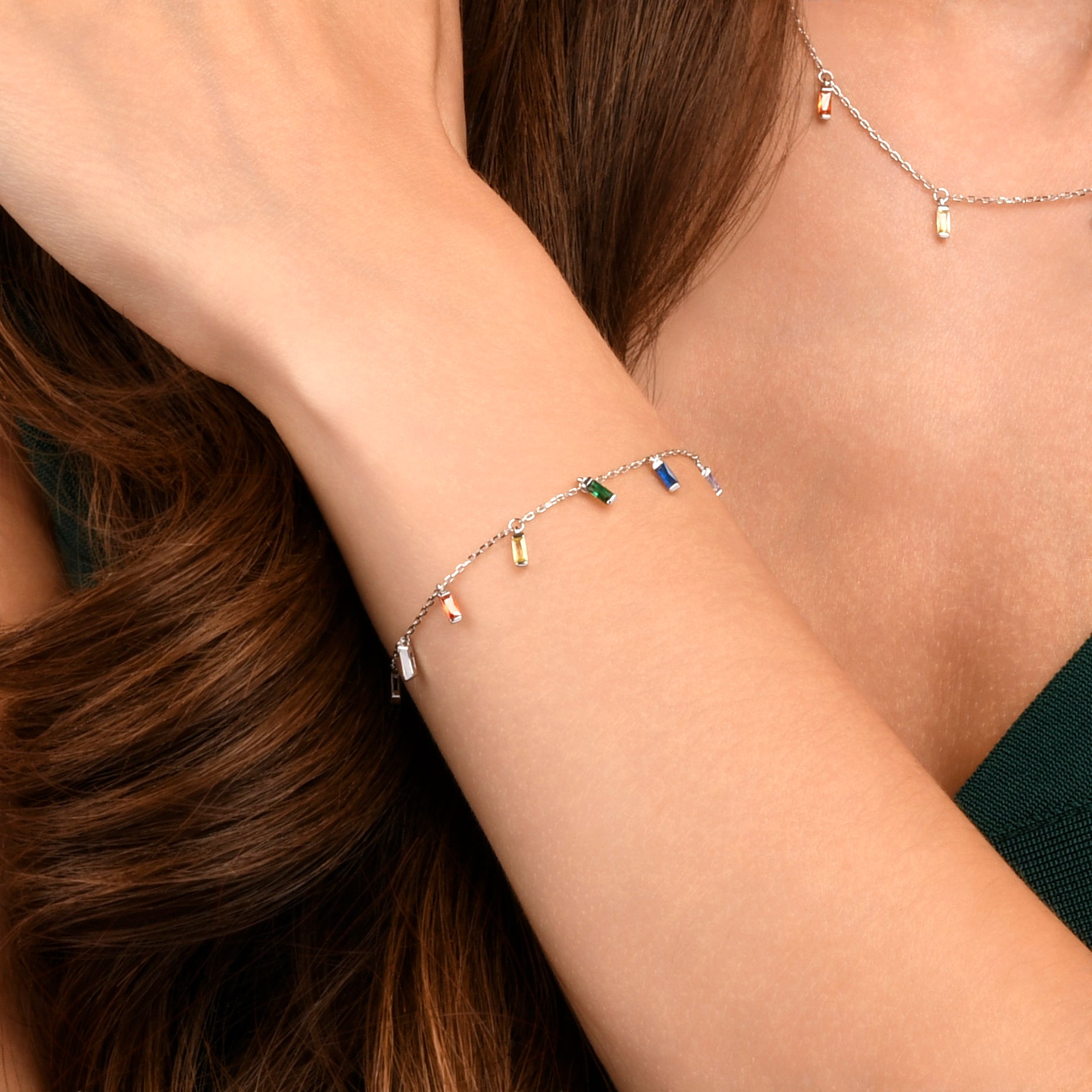 • Dainty silver bracelets for women with rainbow coloured charms in baguette-cut cubic zirconia stones.