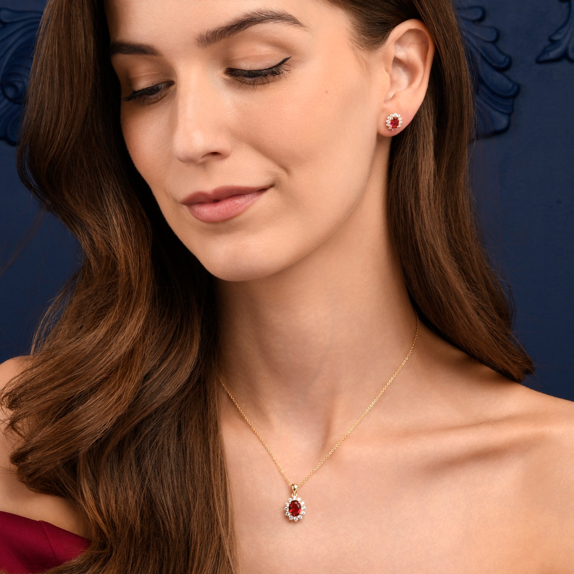 • Gold necklace for women with a classic halo pendant set with an oval red AAA cubic zirconia stone with a halo of smaller white cubic zirconia stones.