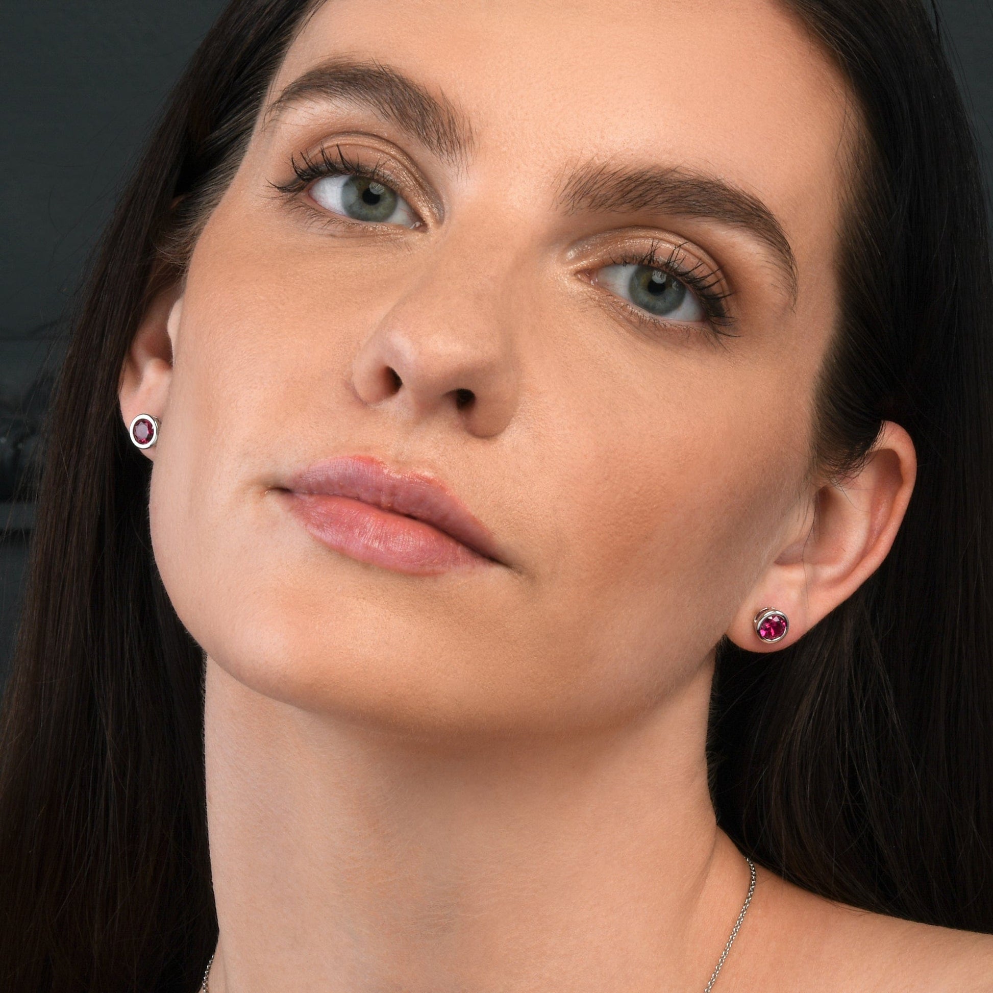 • 925 Sterling silver stud earrings for women and teen girls. Single stone stud earrings for women set with round sparkling red Cubic Zirconia stones.
