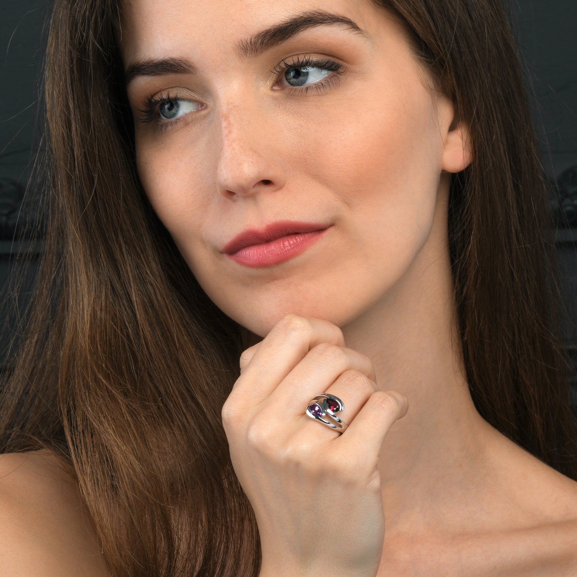• Elegant sterling silver ring for women with two pear-shaped semi-precious gemstones. These stylish silver ladies rings are set with a purple amethyst and a rhodolite garnet. A Rhodolite is a pink Garnet.
