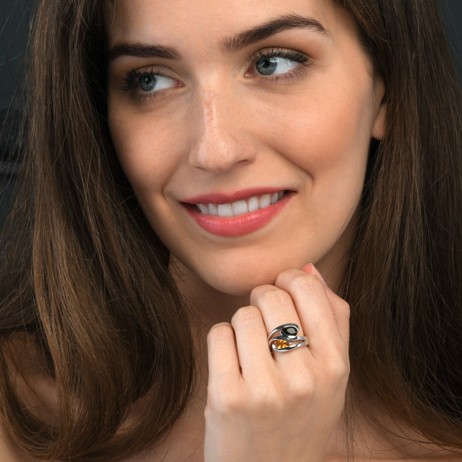 • Elegant 925 sterling silver ring for women with two pear-shaped semi-precious gemstones. These stylish silver ladies rings are set with a Citrine and a Smoky Quartz gemstone.