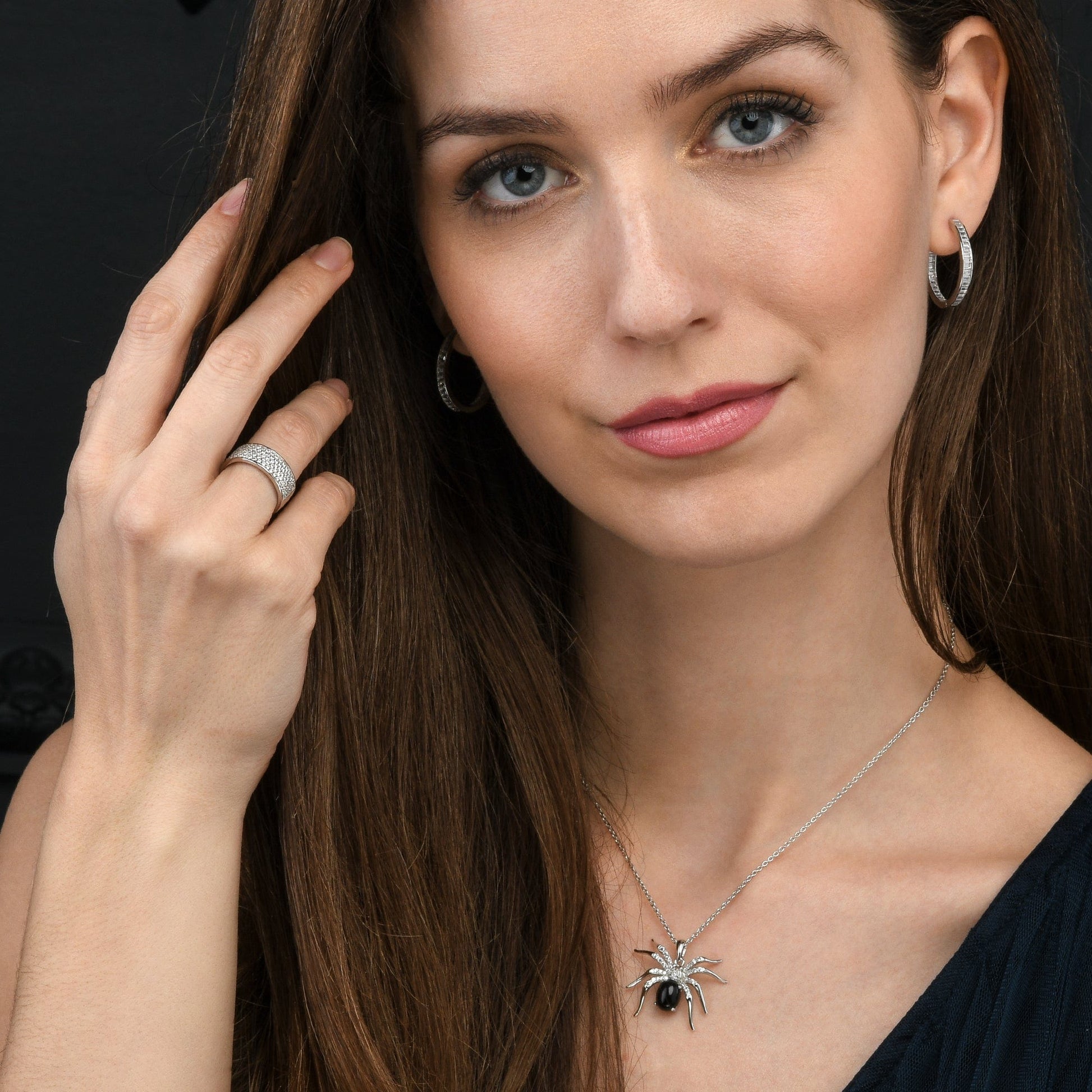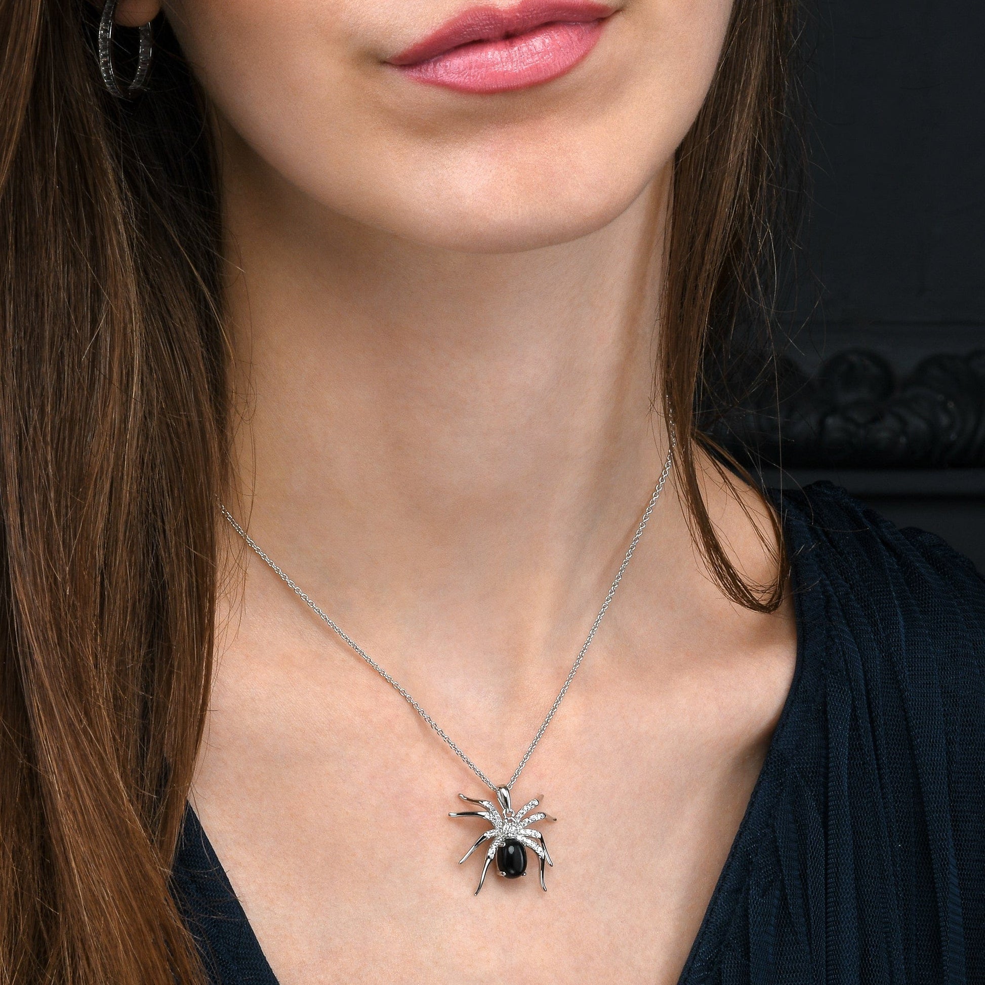 • Striking 925 silver necklace for women with a 27.5mm by 22mm spider pendant. Big spider pendant set with a 7mm x 9mm cabochon cut black agate and small round cubic zirconia stones, on an adjustable 18 inch silver chain, including 2-inch extension links.