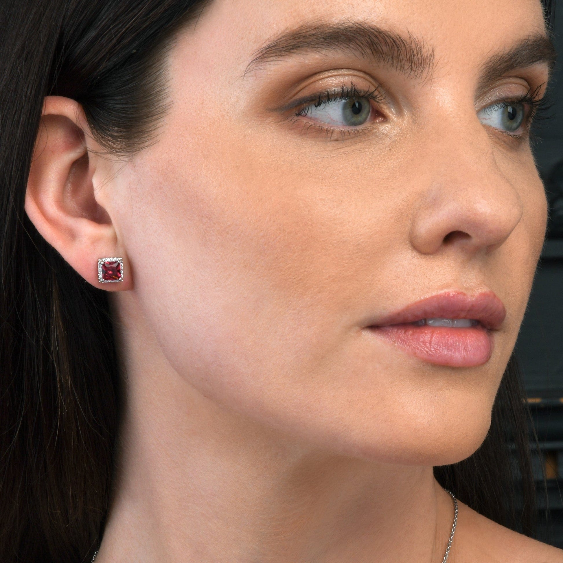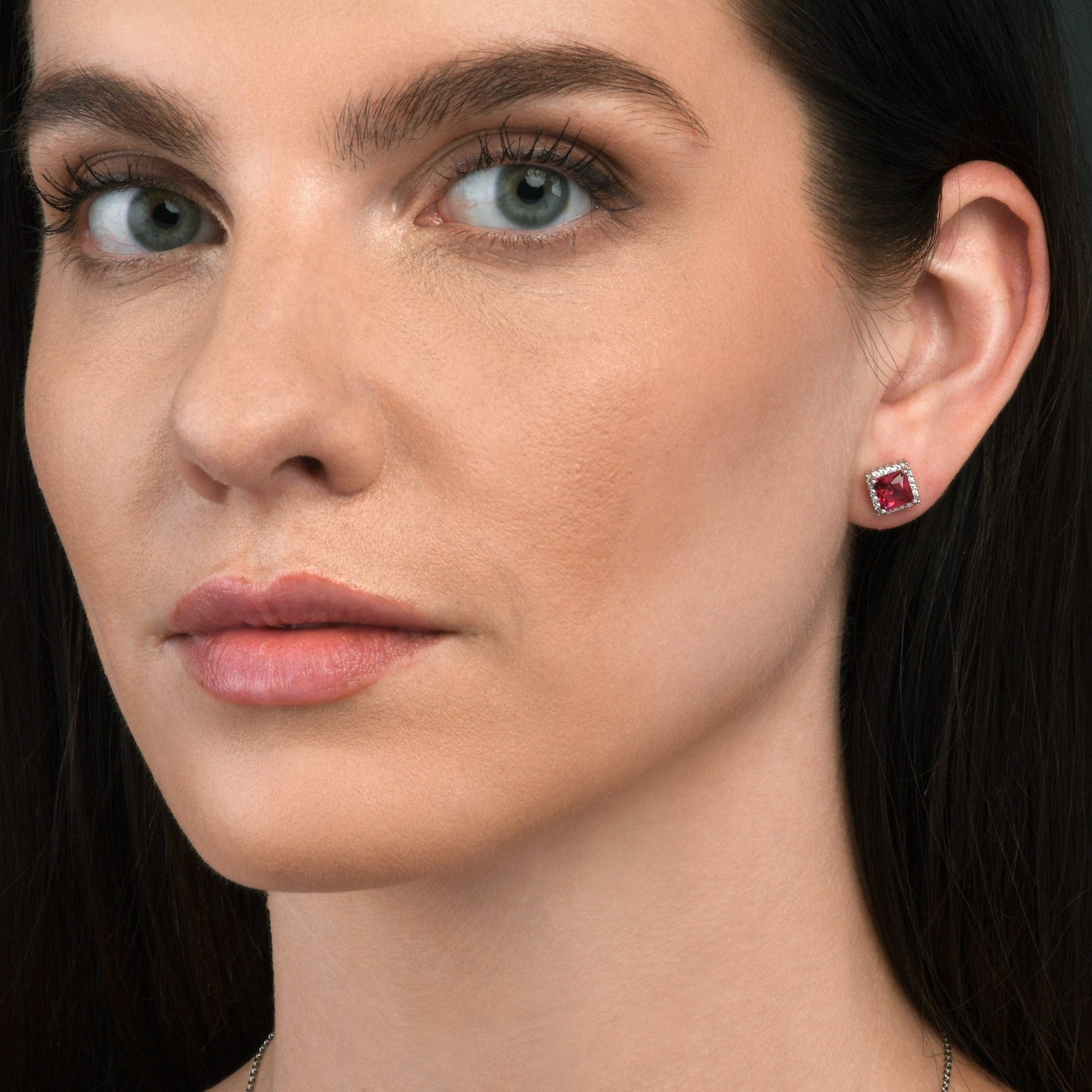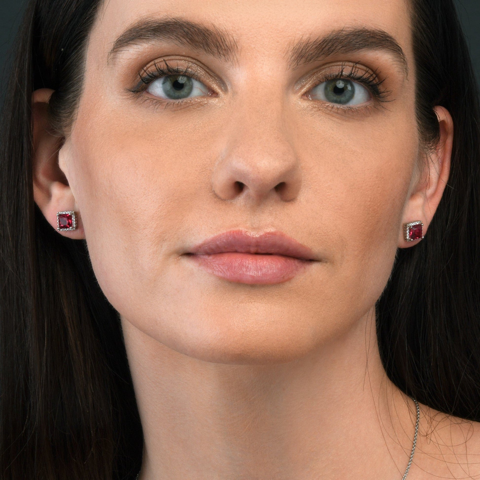 - 8 mm x 8 mm square studs for women with 6 mm red-pink stones encircled by a halo of smaller white stones