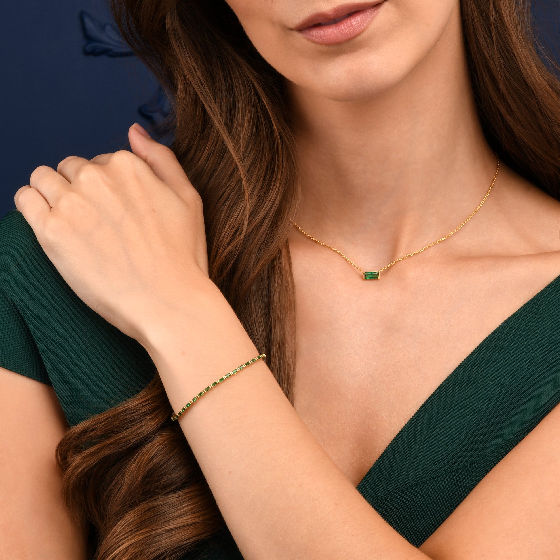 - Dainty gold bracelet for women set with baguette-cut green cubic zirconia stones.