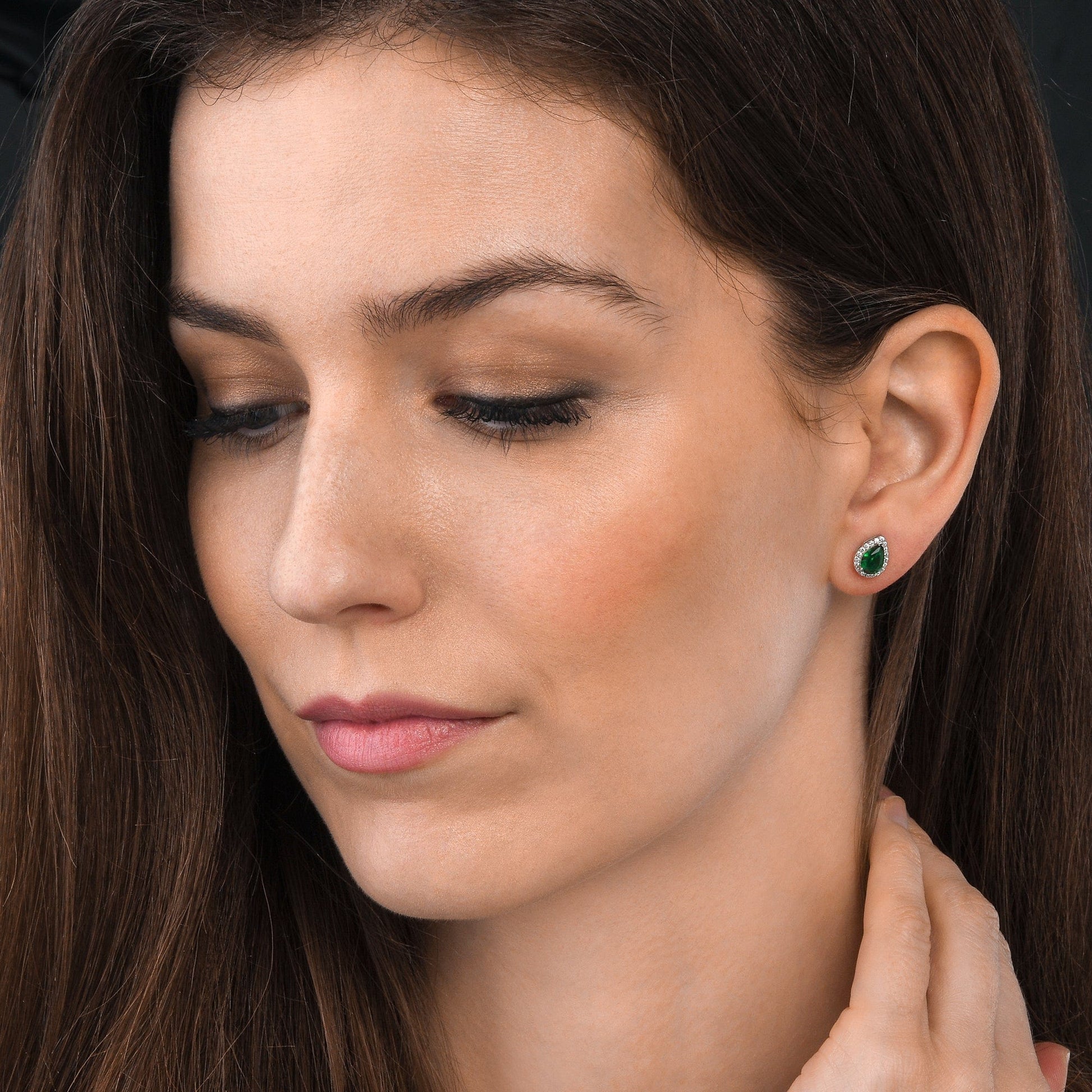 925 Sterling Silver Pear Shaped Green Halo Stud Earrings For Women