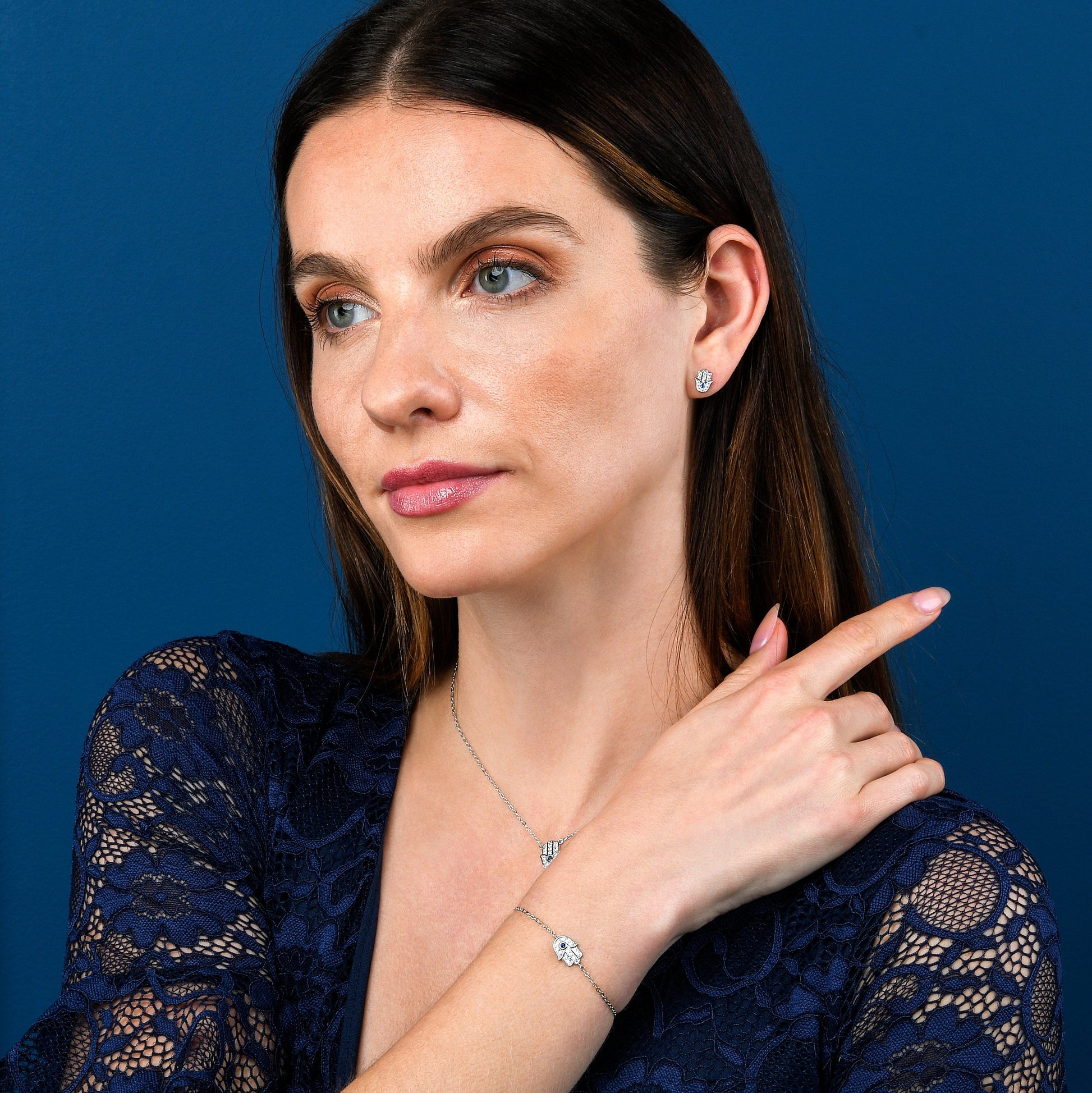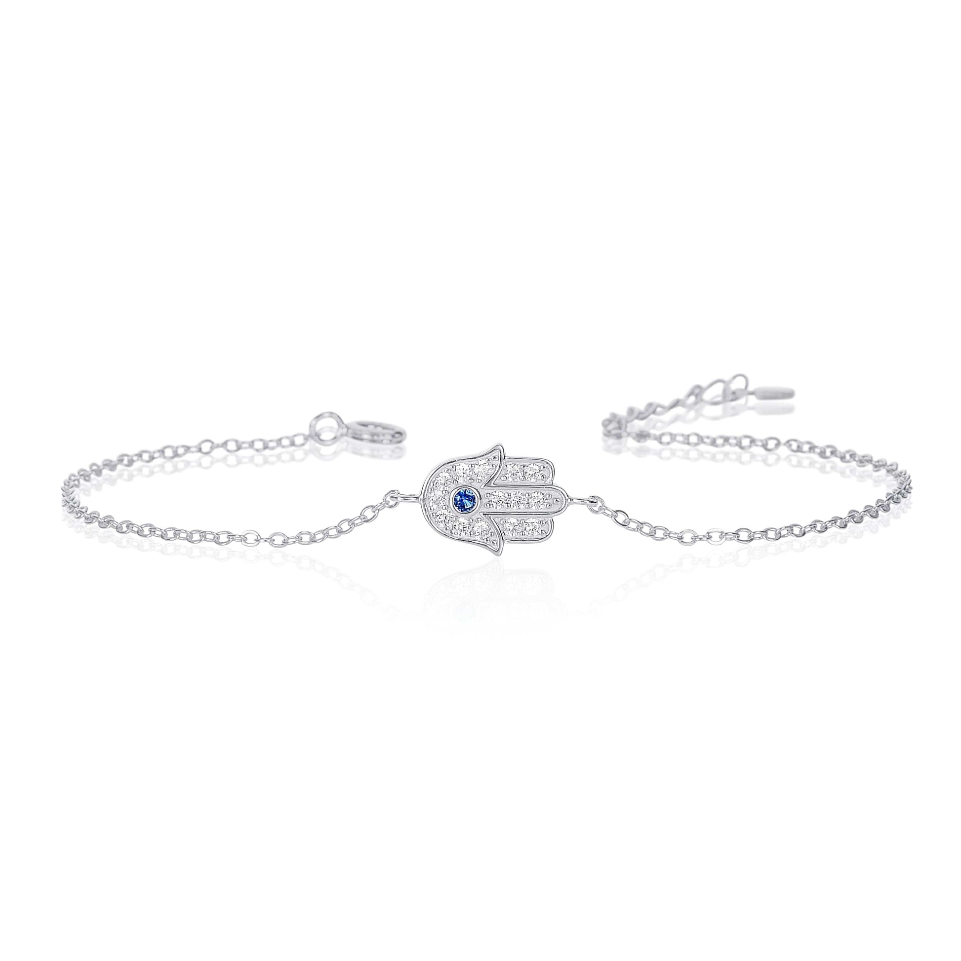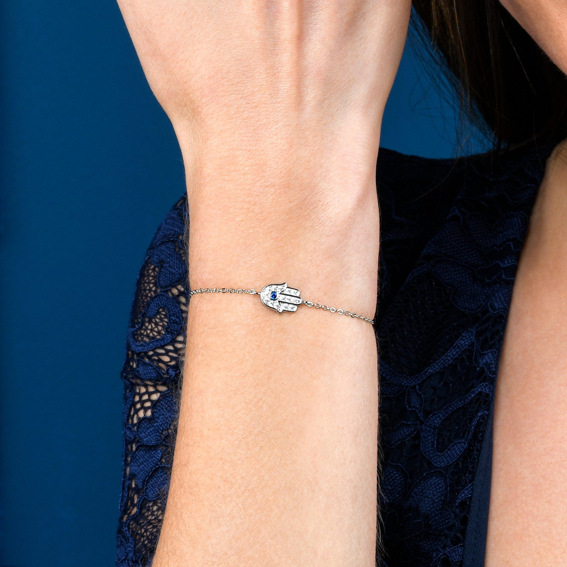 • 925 Sterling silver bracelet for women with a hamsa charm set with white and blue cubic zirconia stones. Cute hamsa bracelets for women with a small 9mm by 12mm hand of Fatima charm. 6.5 inch long chain bracelet with 1 inch extension links.