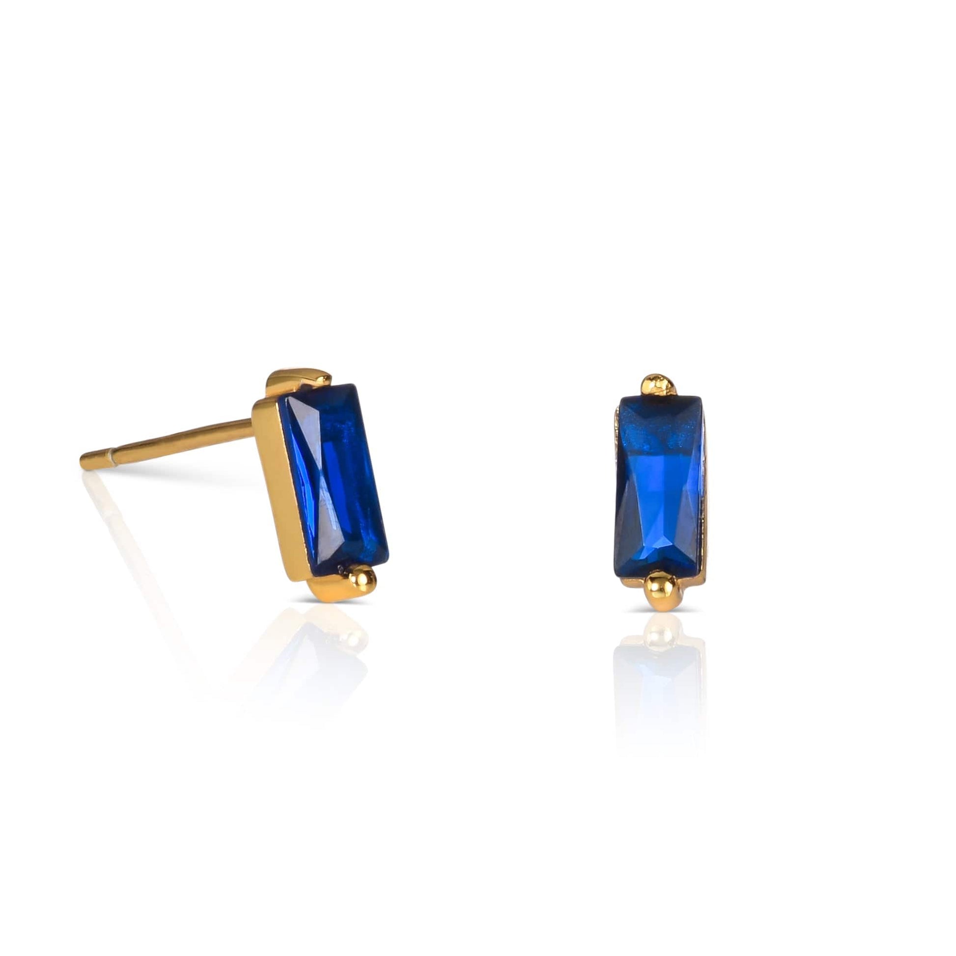 - Dainty gold stud earrings for women and teen girls set with 3mm x 6mm baguette cut cubic zirconia stones. Gold plated sapphire blue earrings with a total length of 7.5 mm x 3 mm
