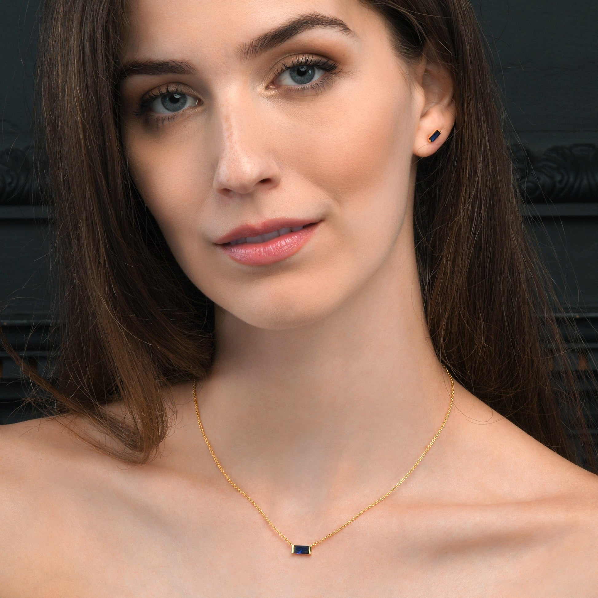 - Small stud earrings for women and teenage girls set with single dark blue baguette cut stones, dainty bar earrings set with baguette-cut blue Cubic Zirconia stones. Stylishly elegant with 2 delicate claws holding the stones from the sides, these tiny ear studs for women can be be worned on the main or the second hole.