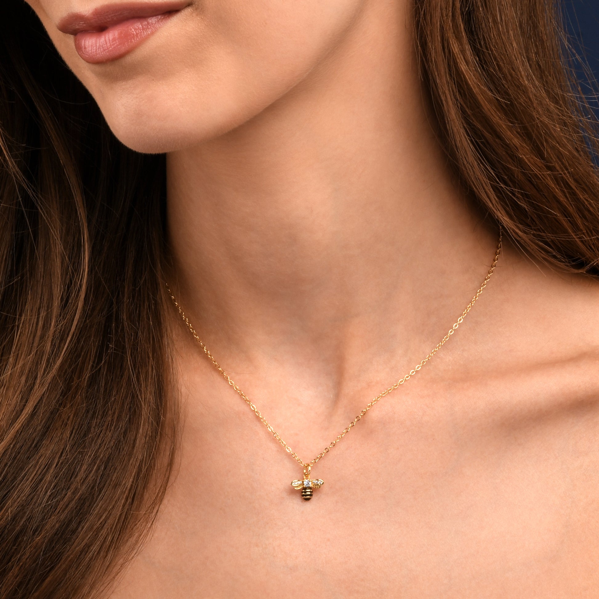 - Delicate gold necklaces for women with a bumblebee pendant set with Cubic Zirconia and black enamel details
