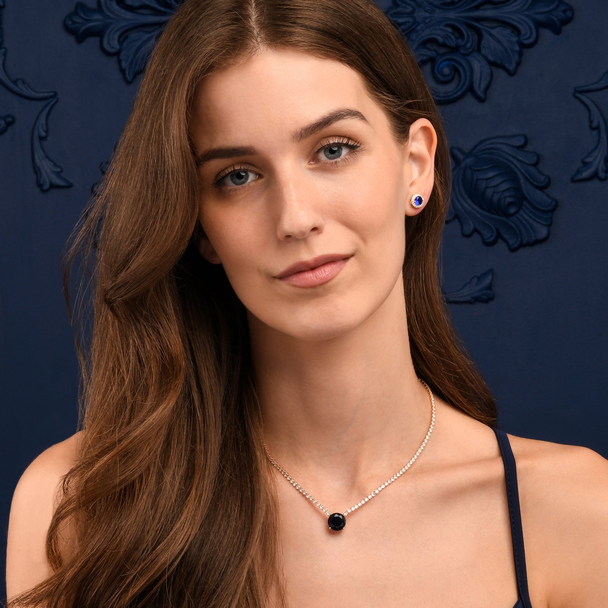 - Stunning gold necklaces for women set with 2.5 mm small cubic zirconia stones and a large 12 mm round dark blue stone. 40 cm long collar necklace with 5 cm extension links