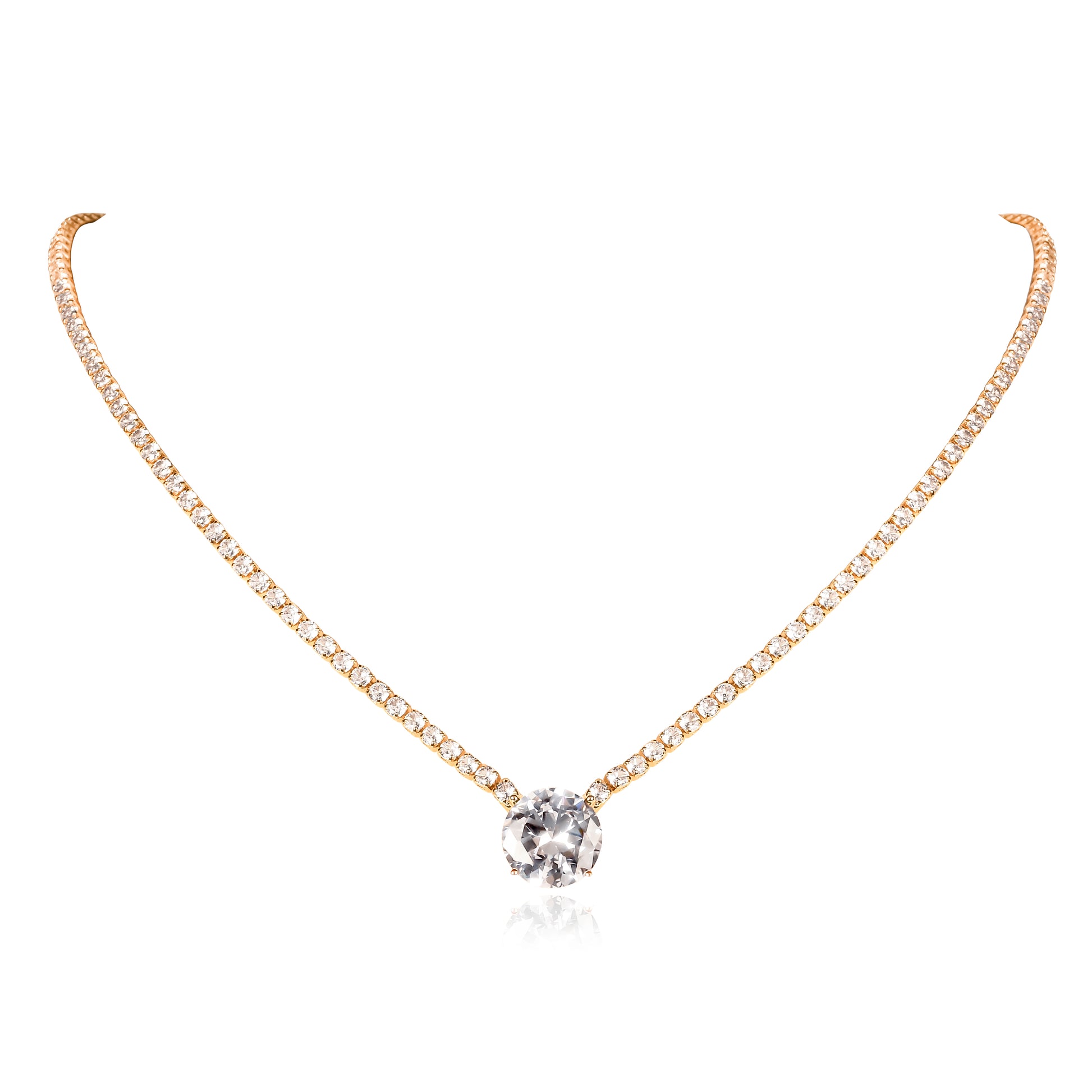 - Stunning gold necklaces for women set with 2.5 mm small cubic zirconia stones and a large 12 mm round cubic zirconia stone. 40 cm long collar necklace with 5 cm extension links