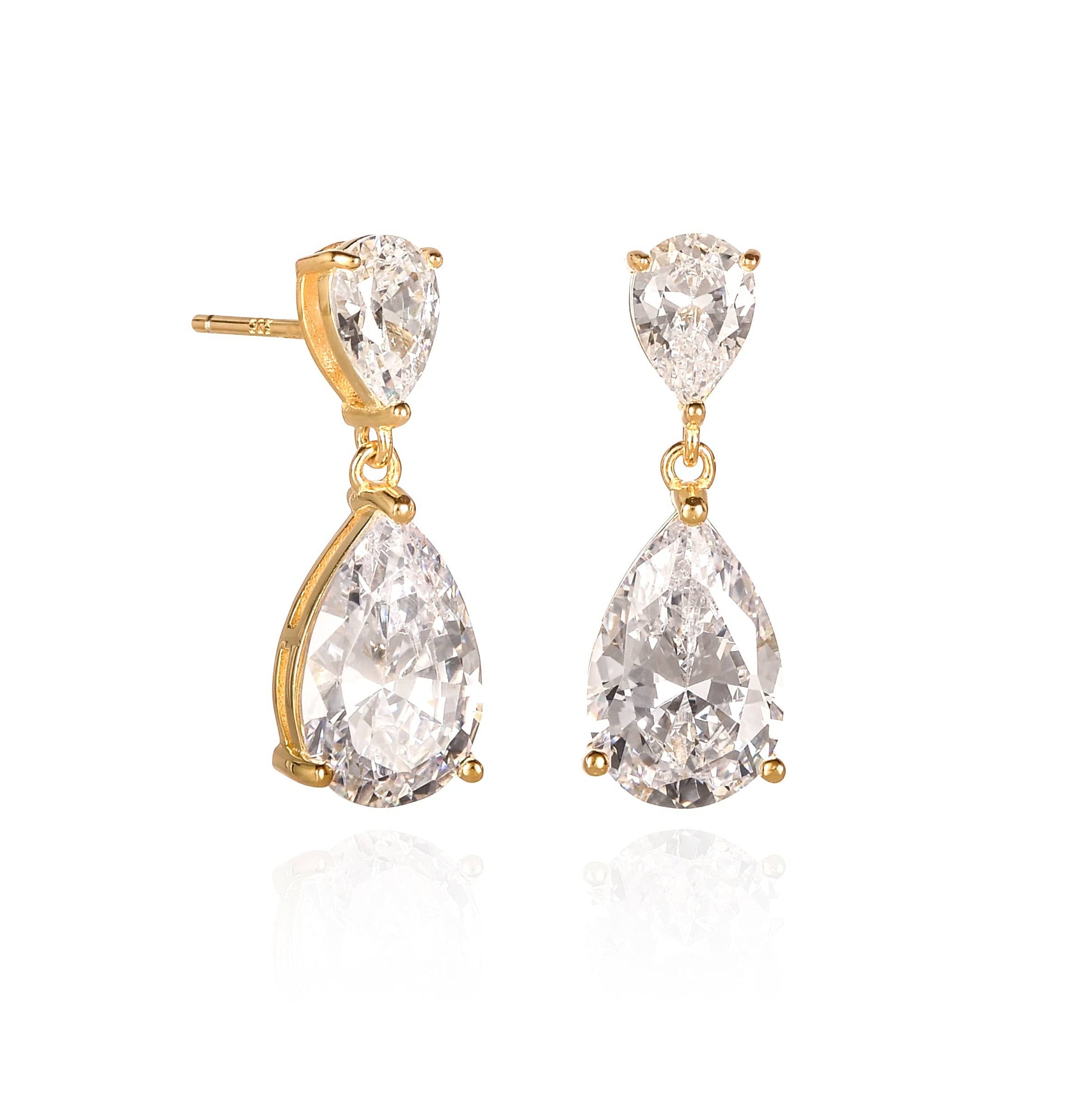 • 8mm by 23mm teardrop earrings with 2 pear-shaped clear Cubic Zirconia stones.