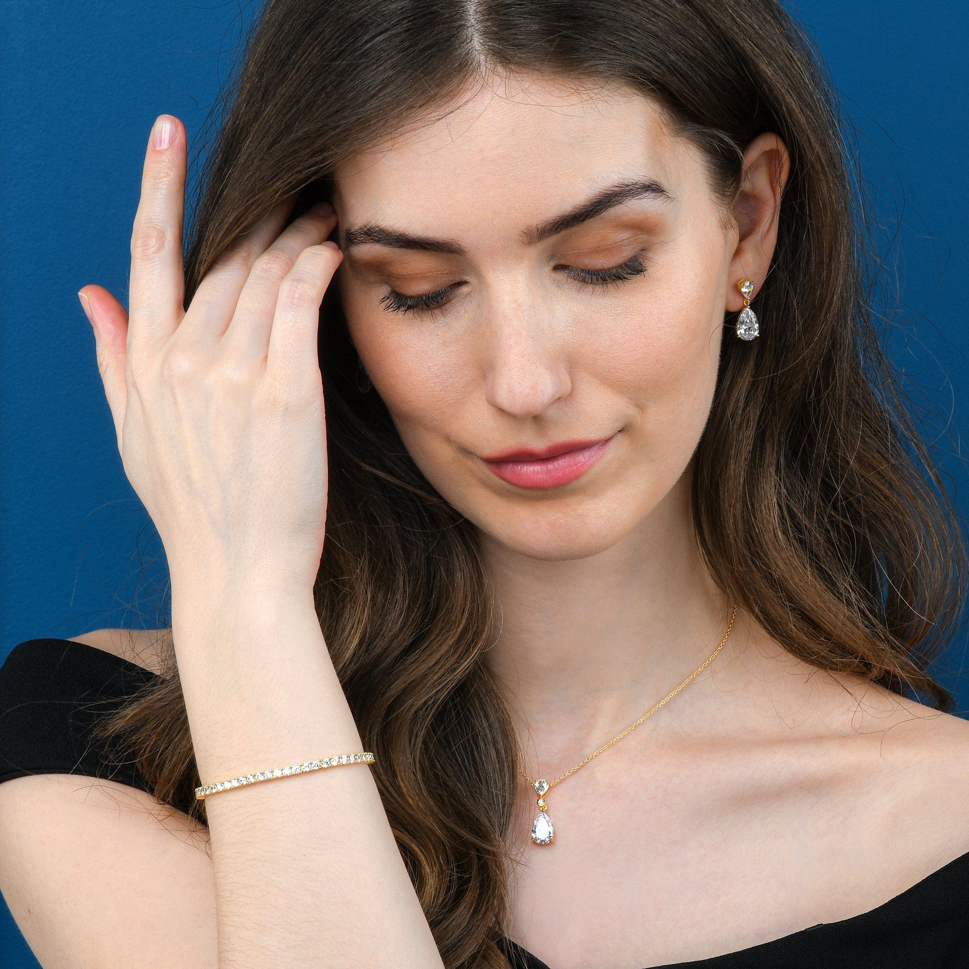 • Gold drop earrings for women and girls. Elegant gold plated earrings for women with pear-shaped sparkling AAA Cubic Zirconia stones.