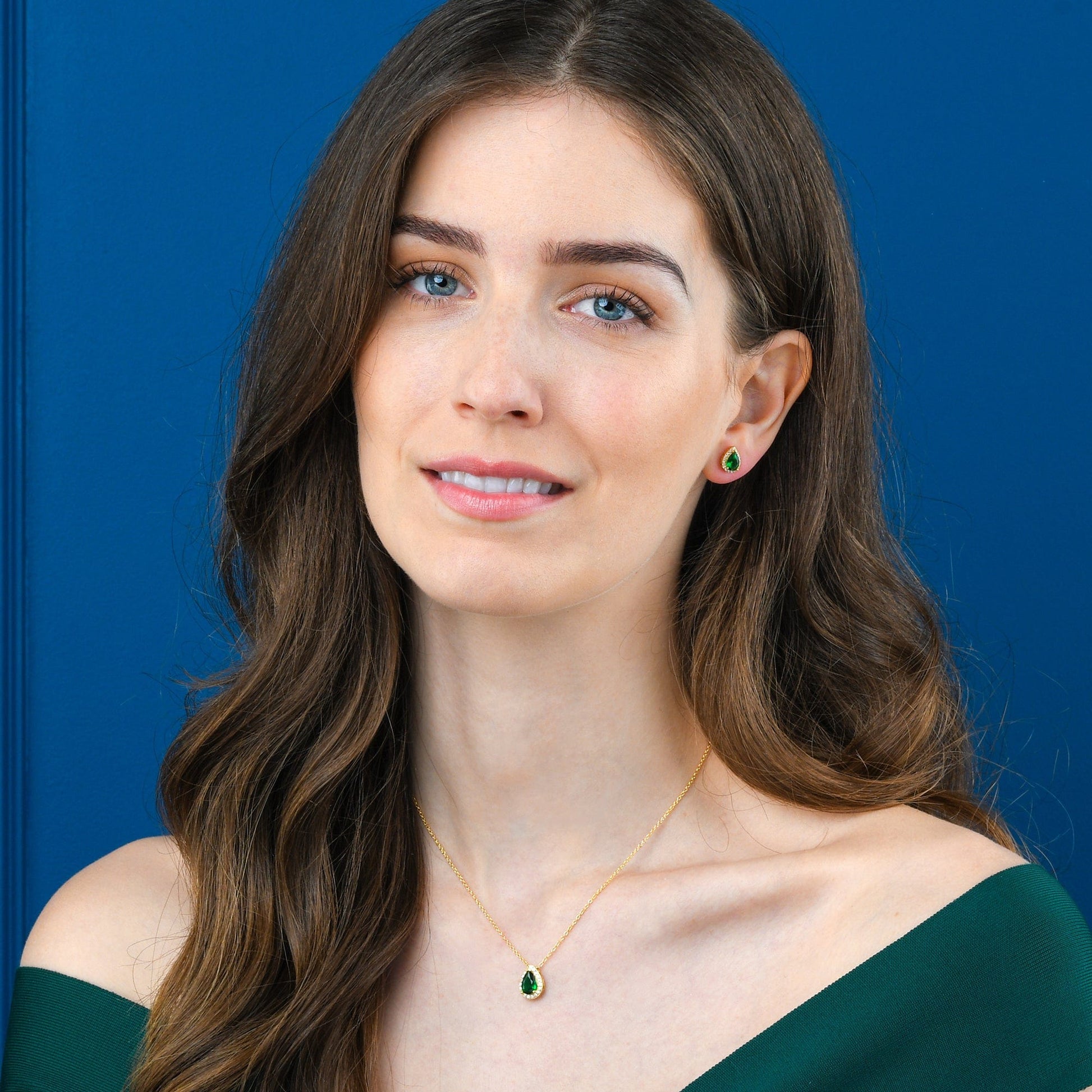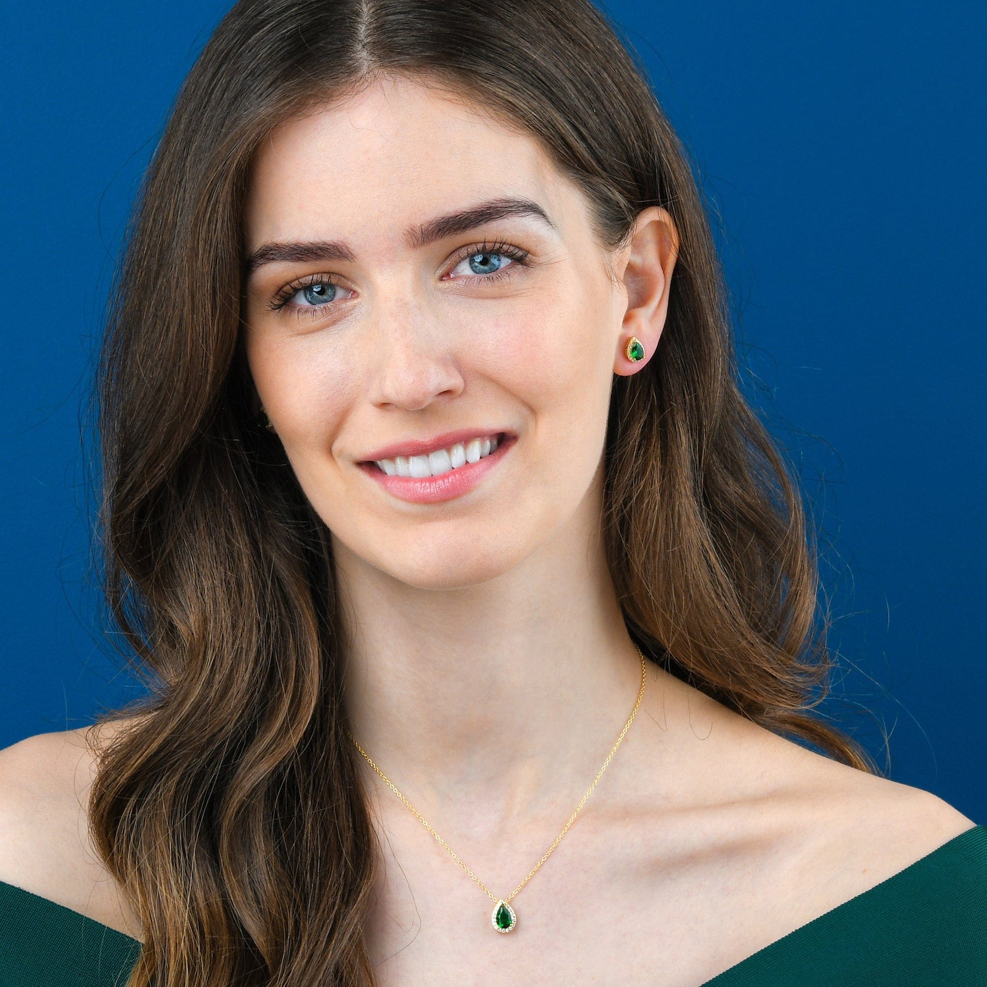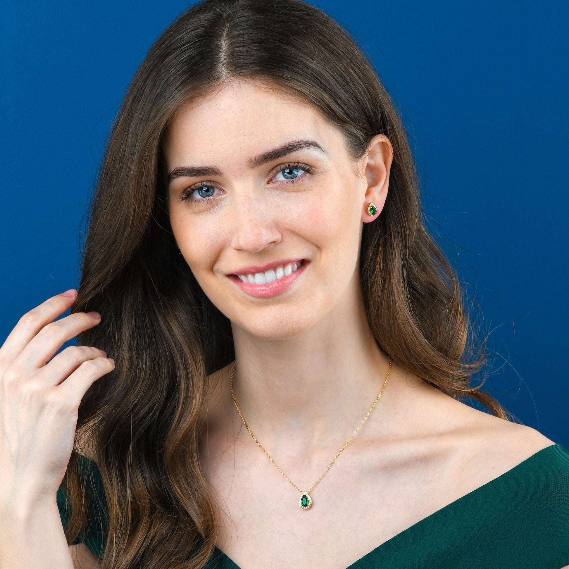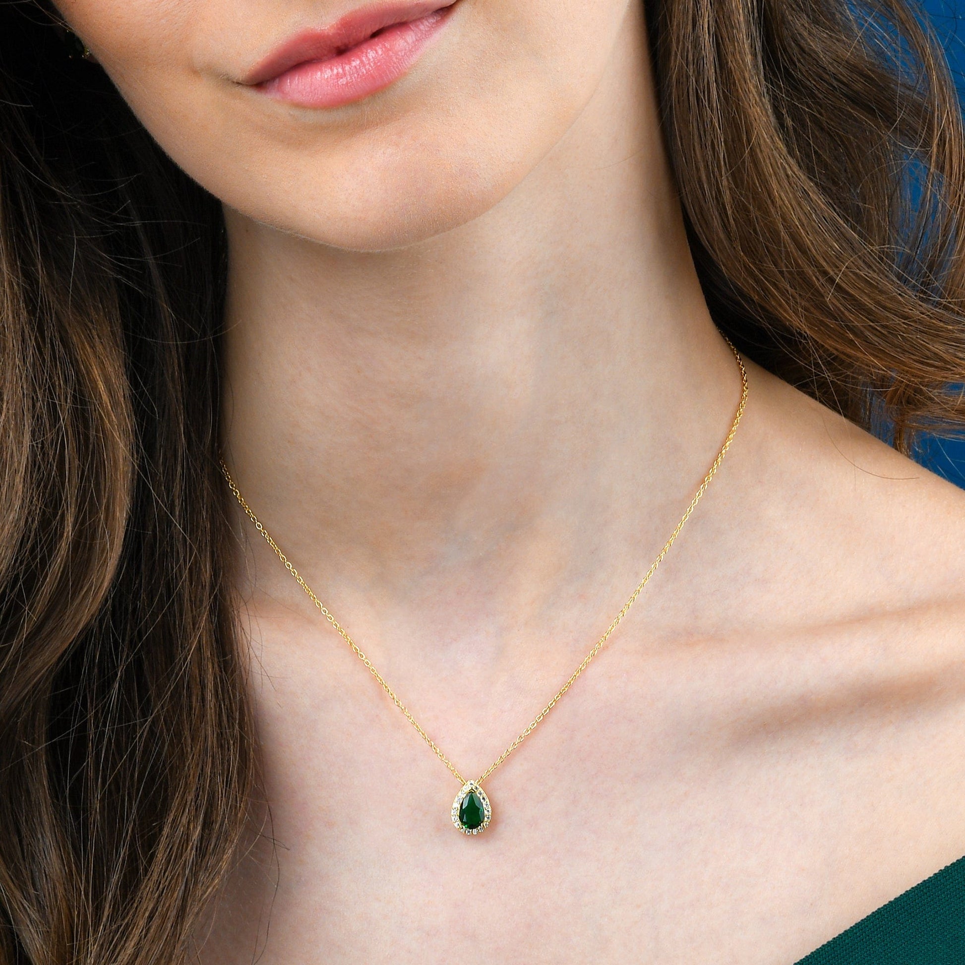 • 9mm x 12.5mm pear shaped halo pendant for women with 6mm x 9mm emerald green stone encircled by a halo of smaller white stones on an adjustable 18” chain, including 2-inch extension links.