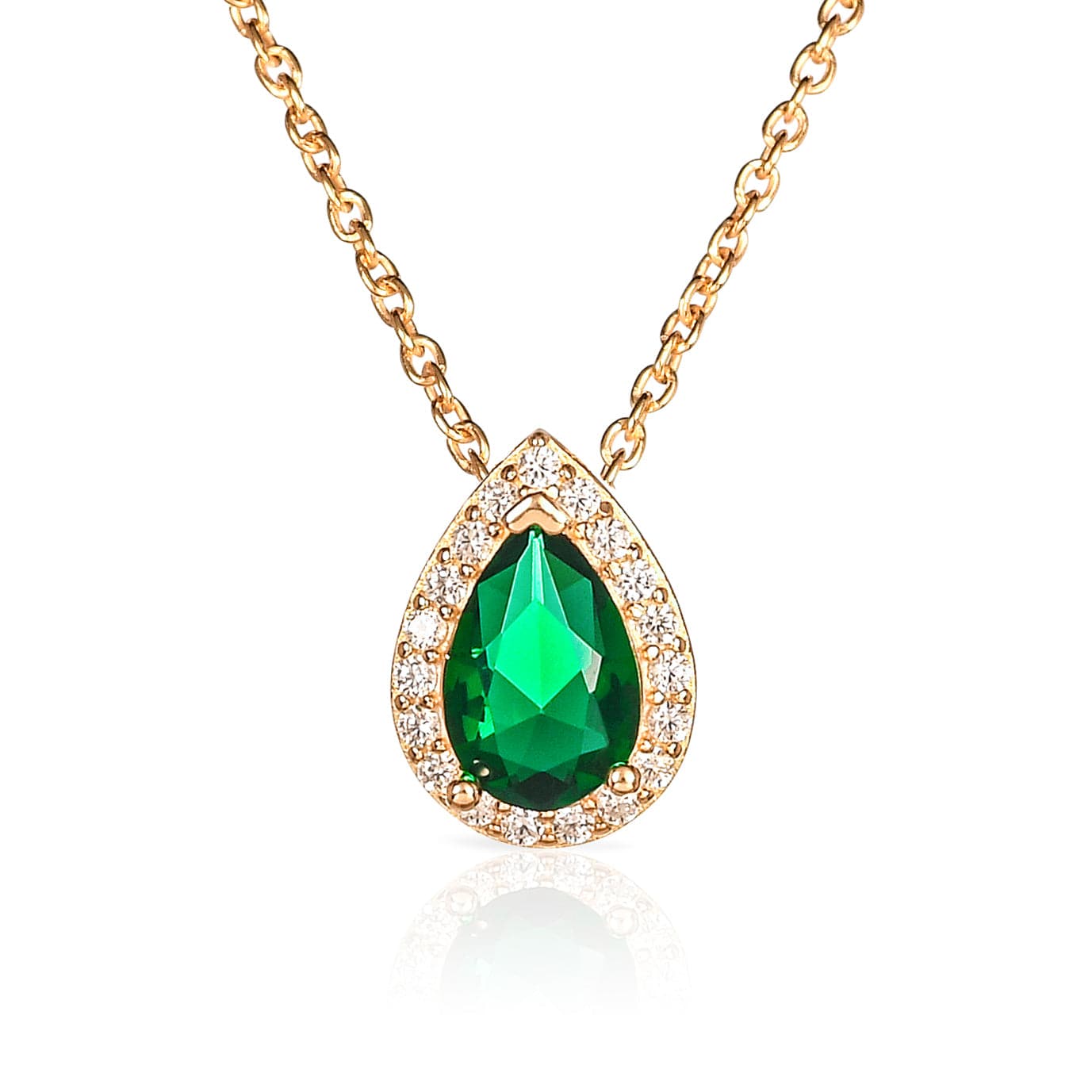 Gold Plated 925 Sterling Silver Green Pear Drop Halo Pendant Necklace for Women