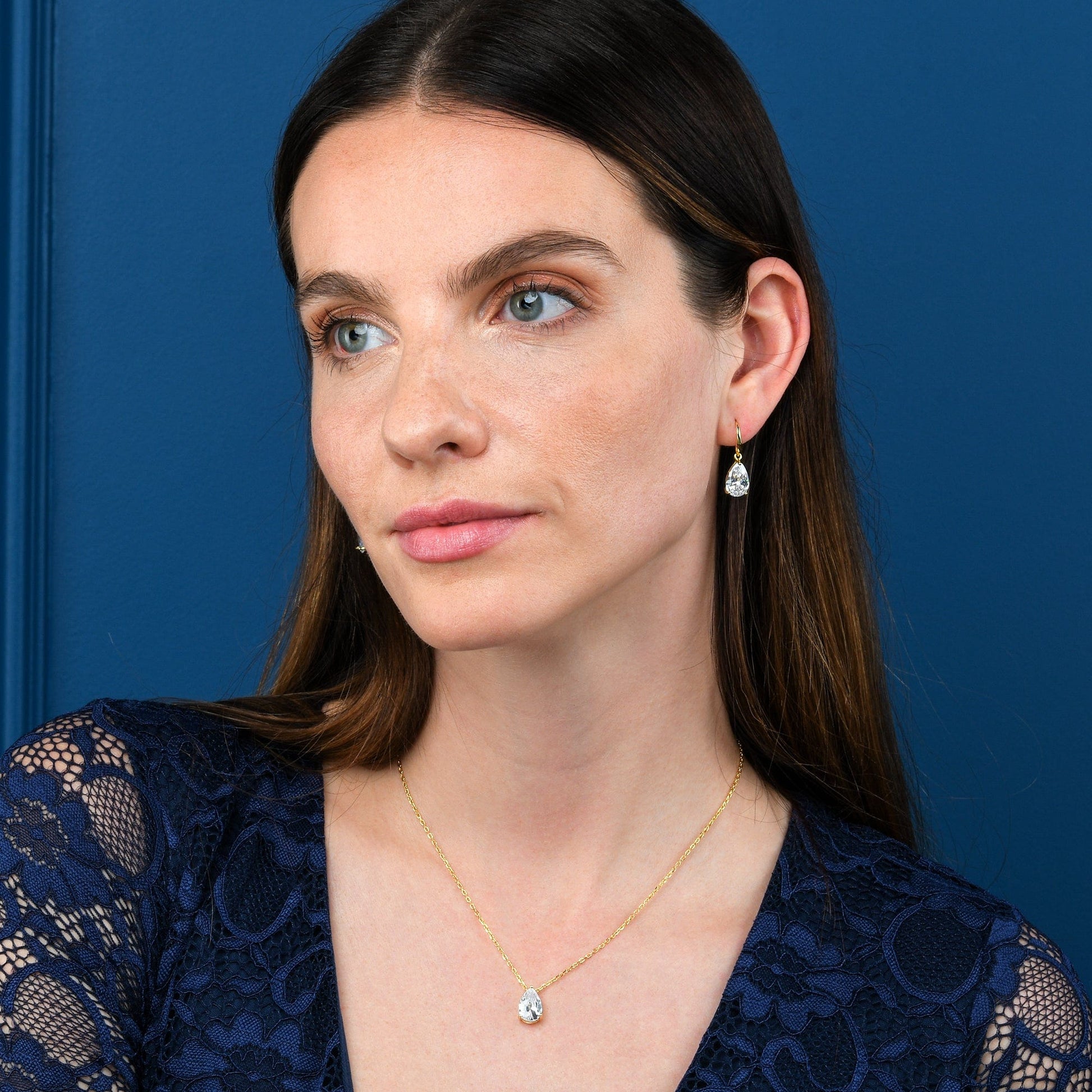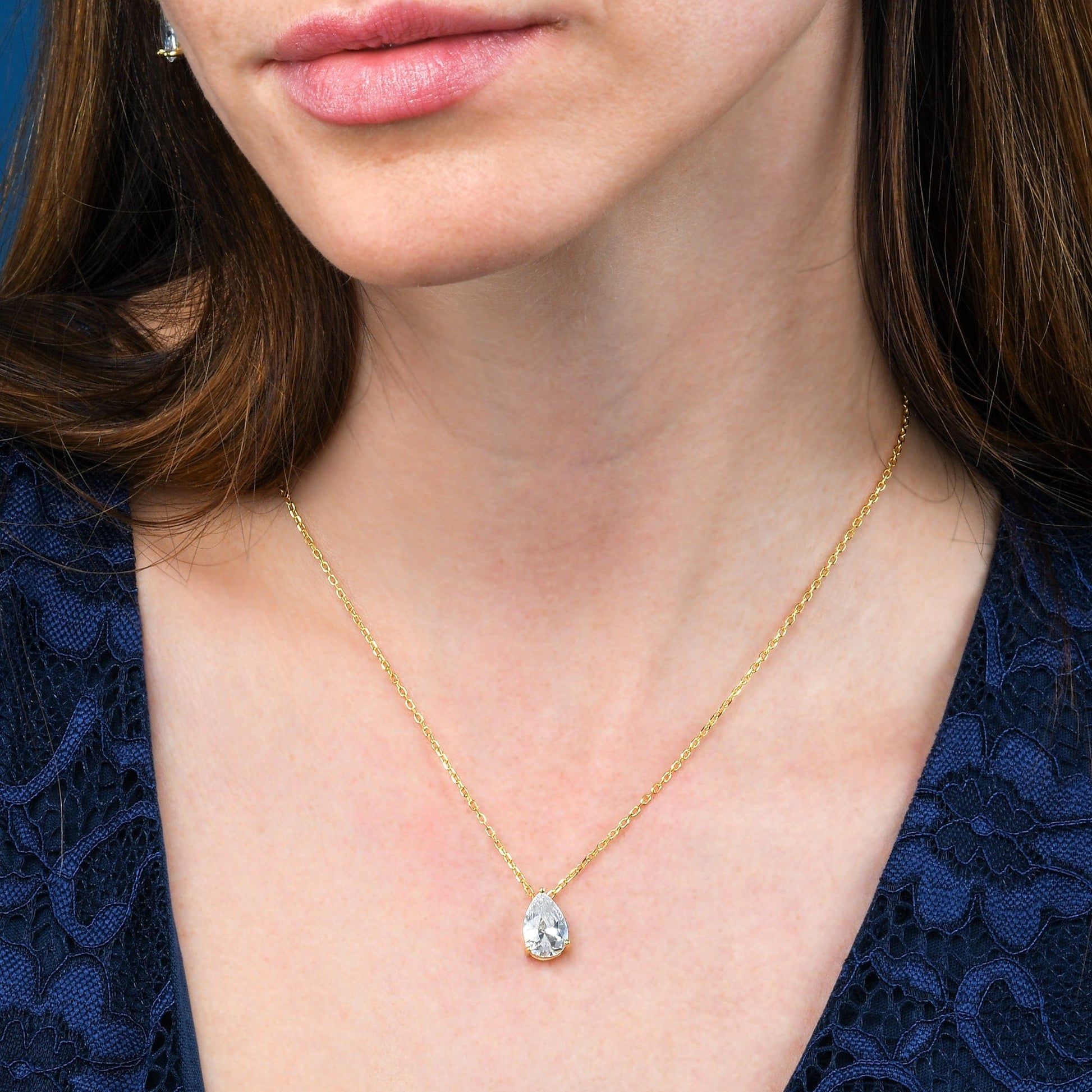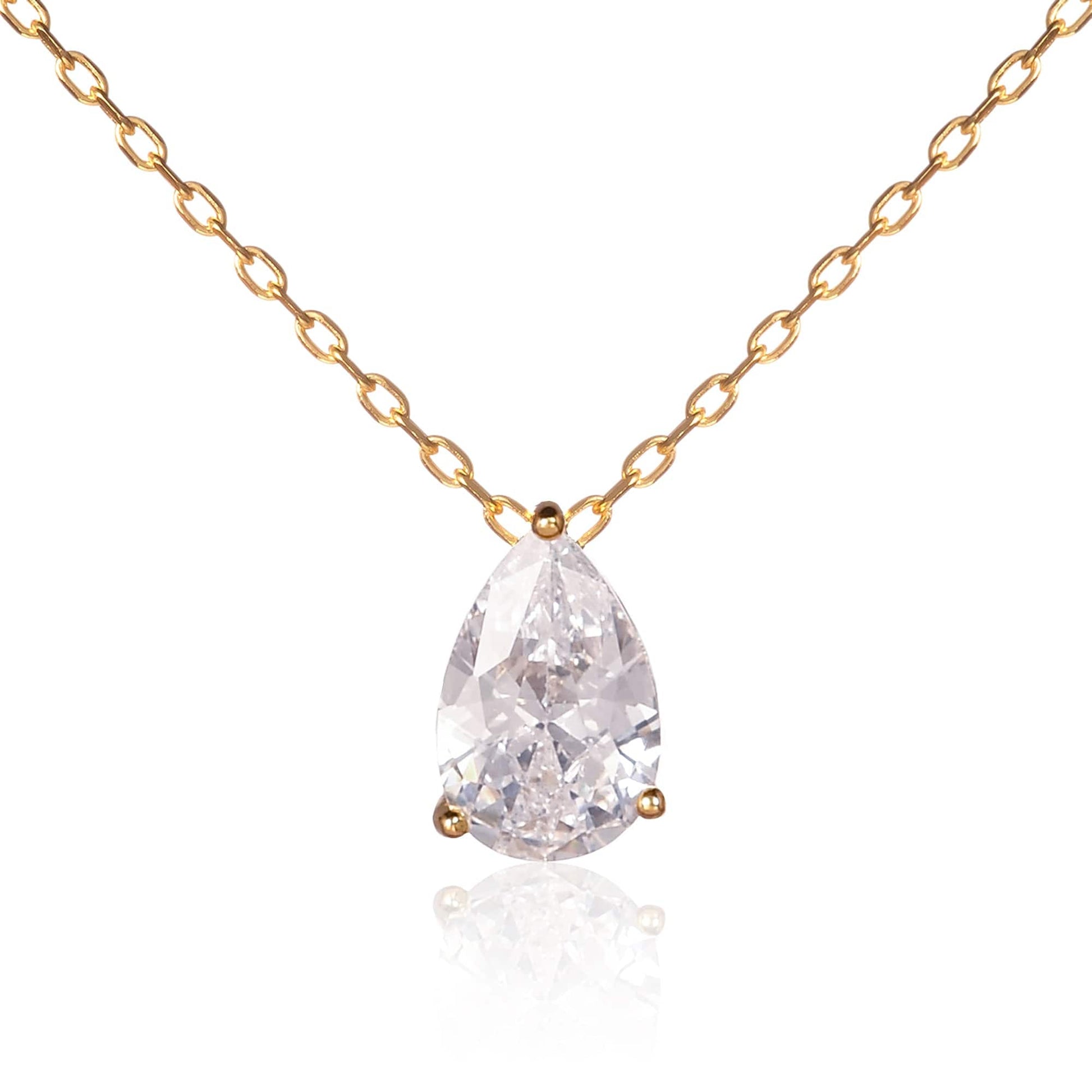 • Gold plated necklace for women with a pear-shaped pendant. Simple stone necklaces for women with 8mm by 12mm pear-shaped cubic zirconia stone.