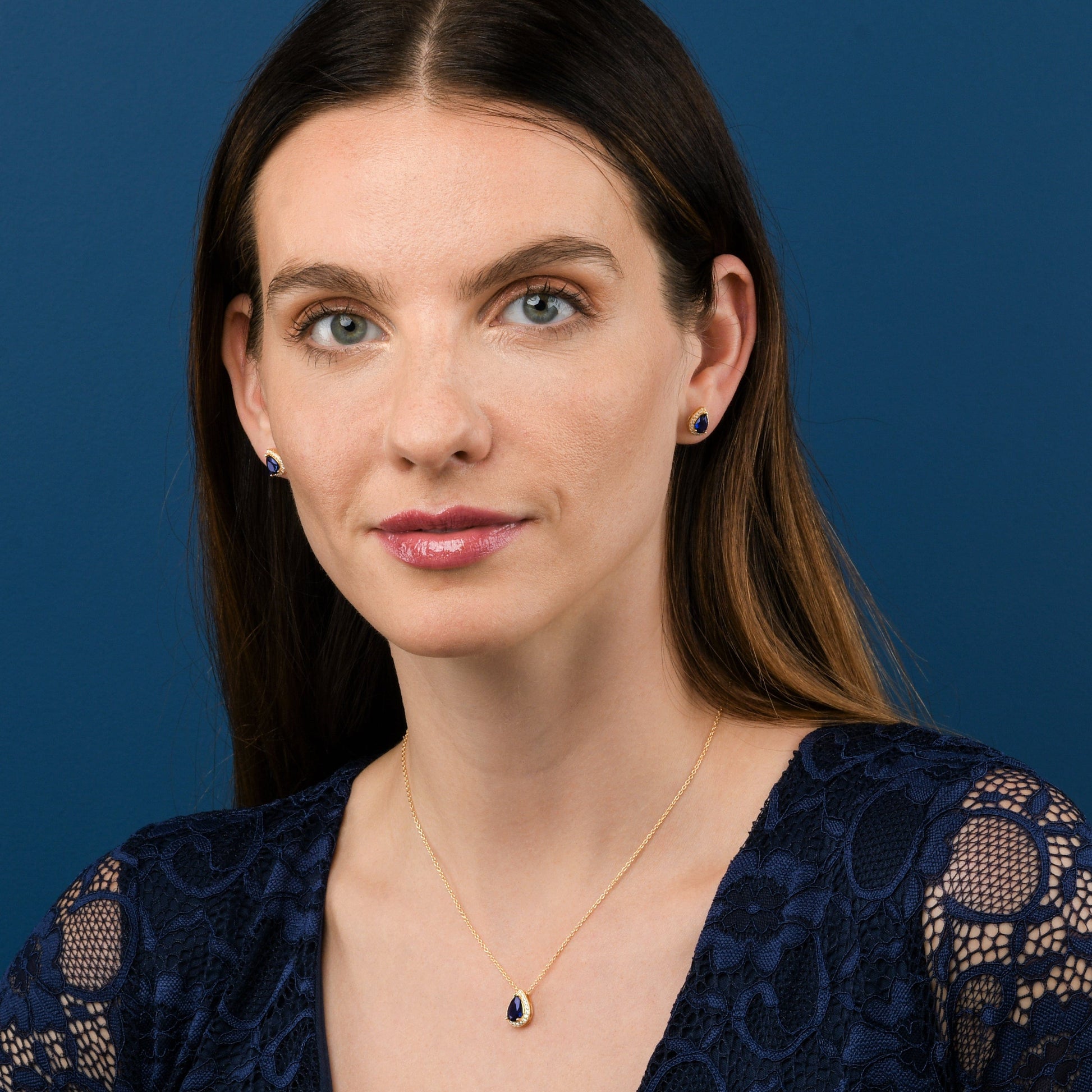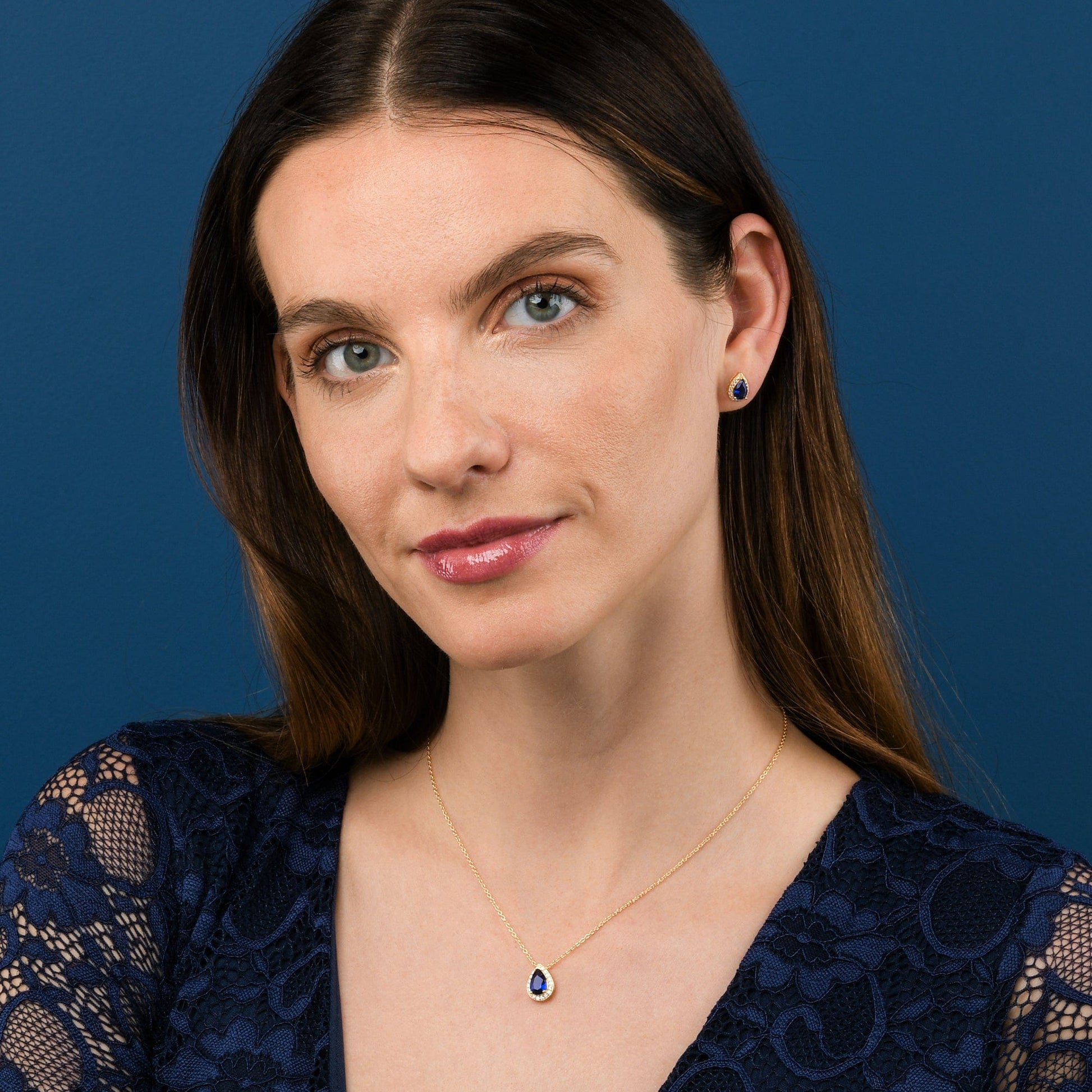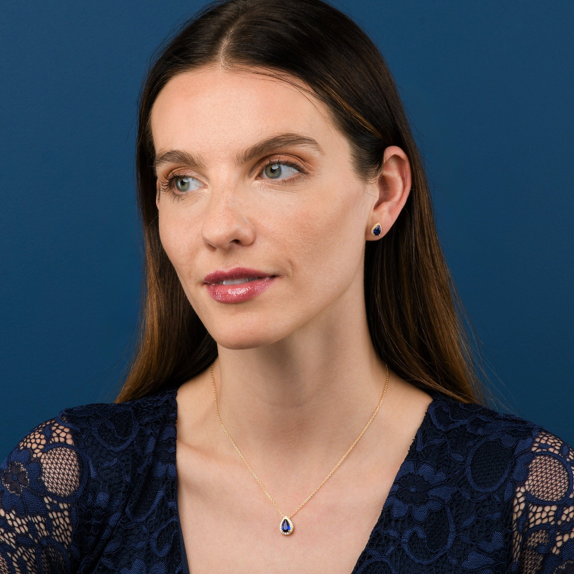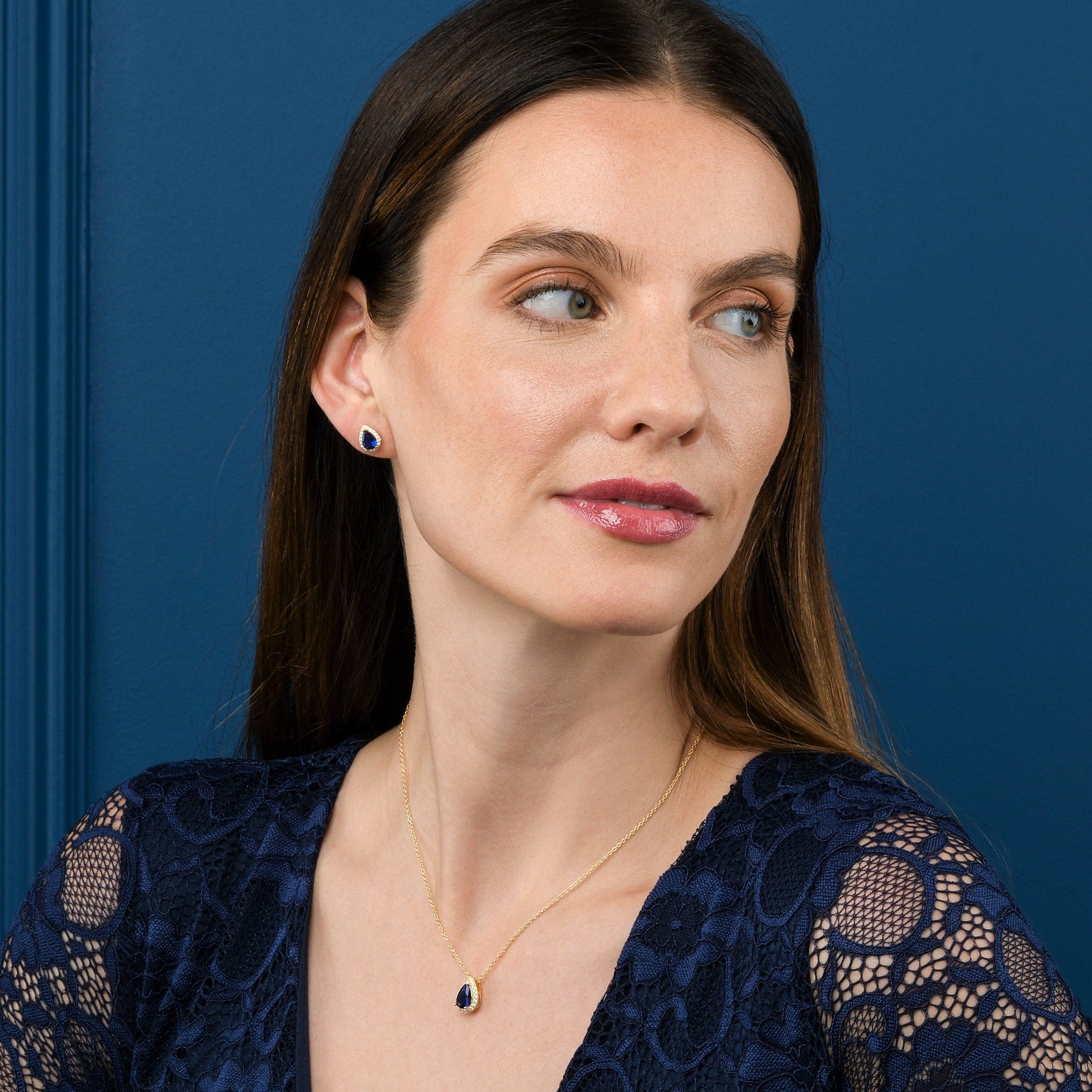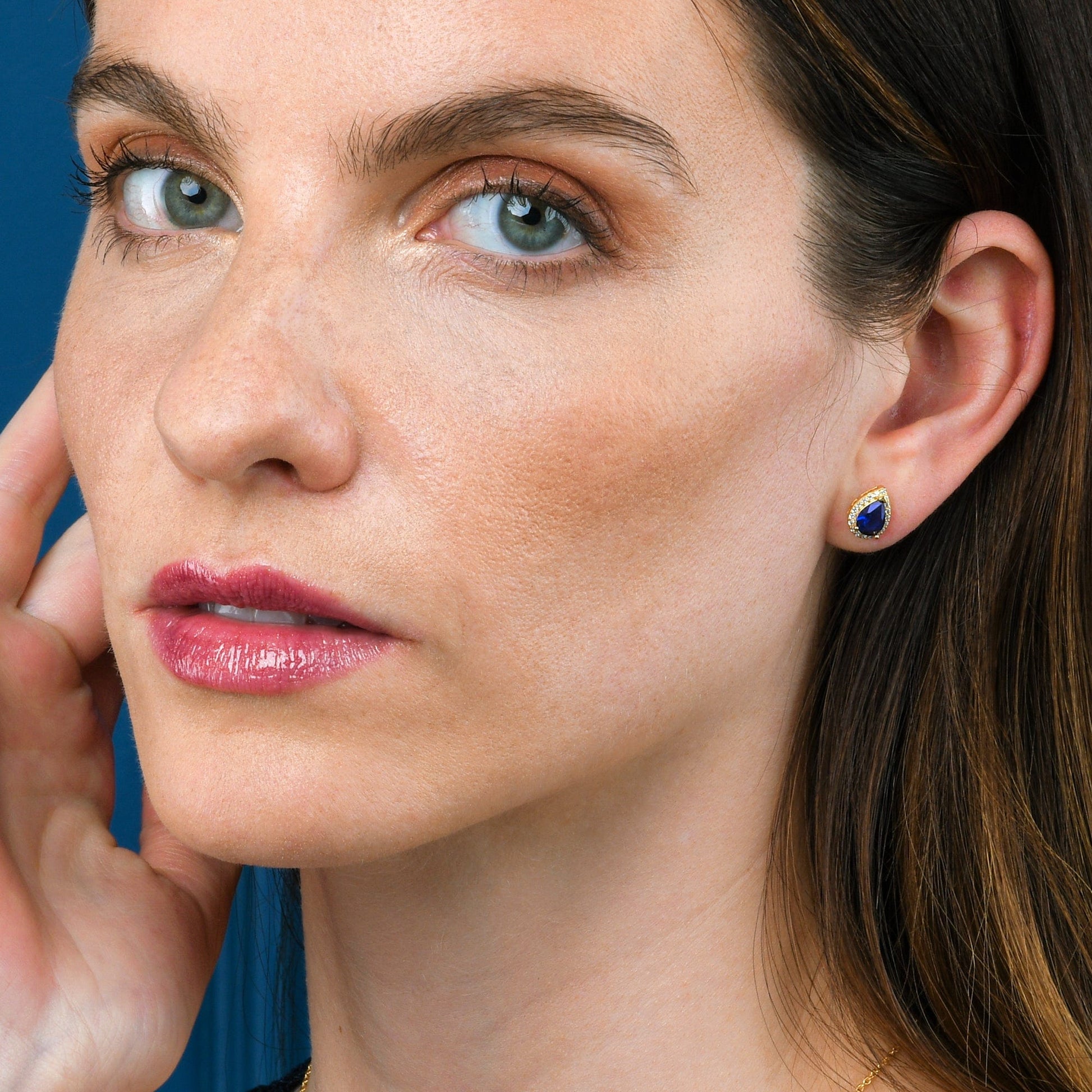 • 7.5mm x 9.5mm cute pear shaped studs are set with 5mm x 7mm pear cut sapphite blue cubic zirconia stones and 1.5mm small sparkling white cubic zirconia stones.