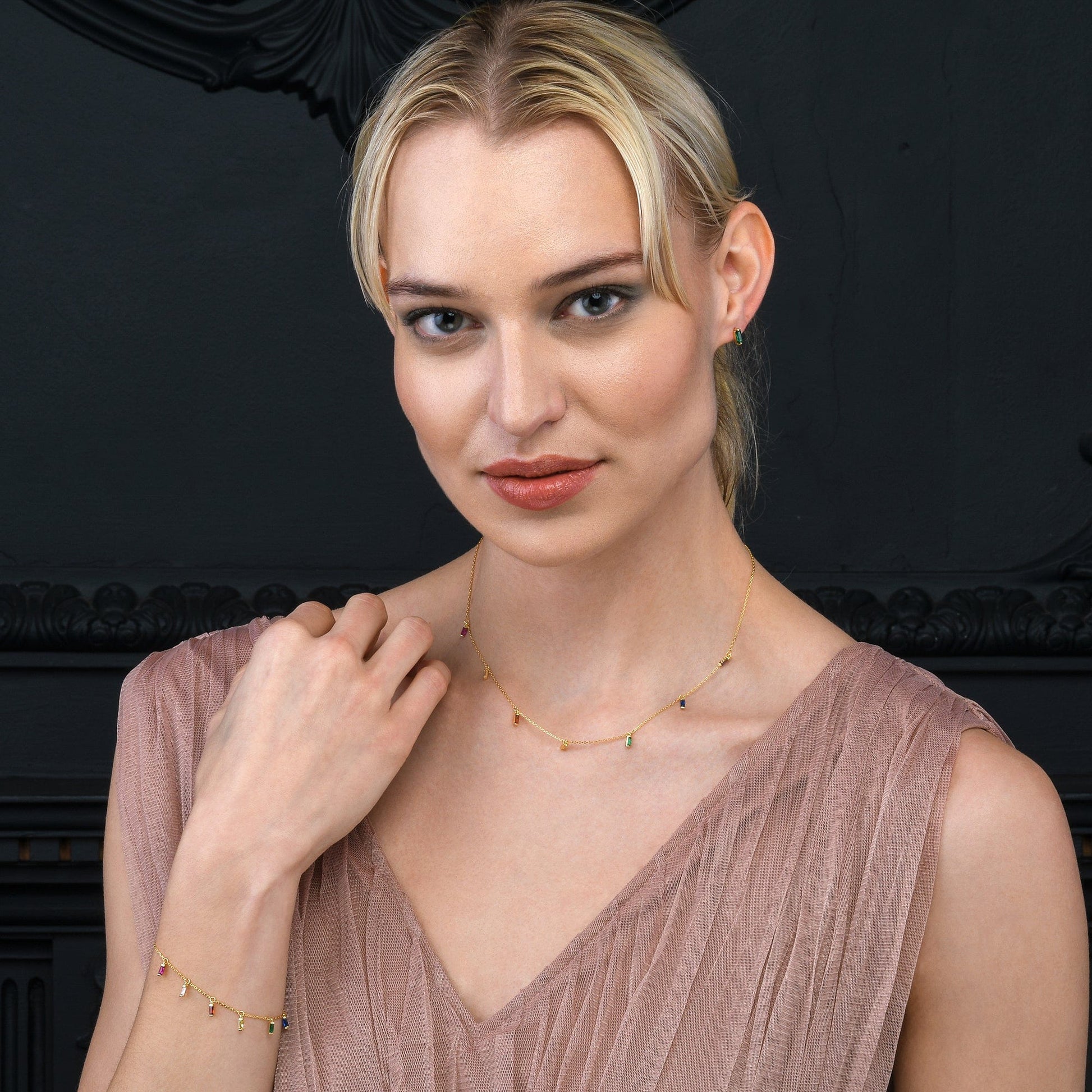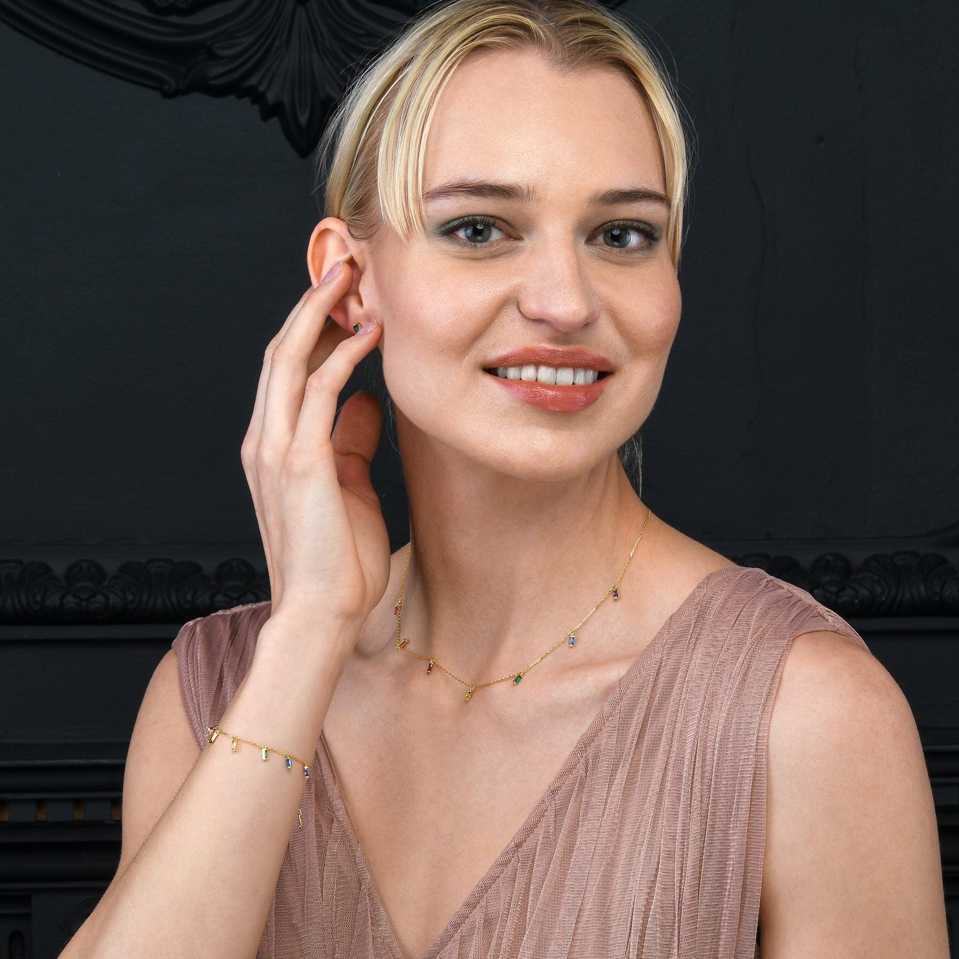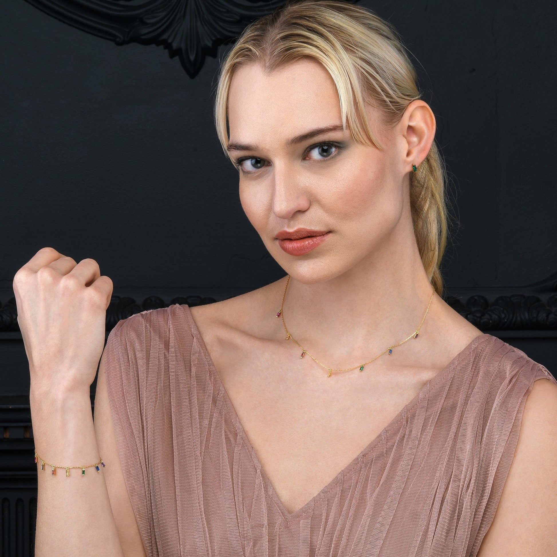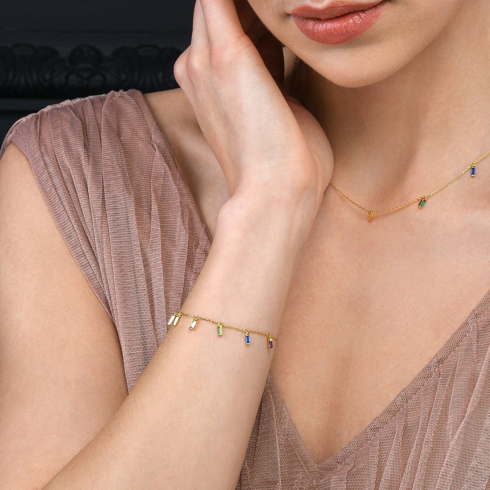 • Dainty gold bracelets for women with rainbow-coloured charms in baguette-cut cubic zirconia stones.