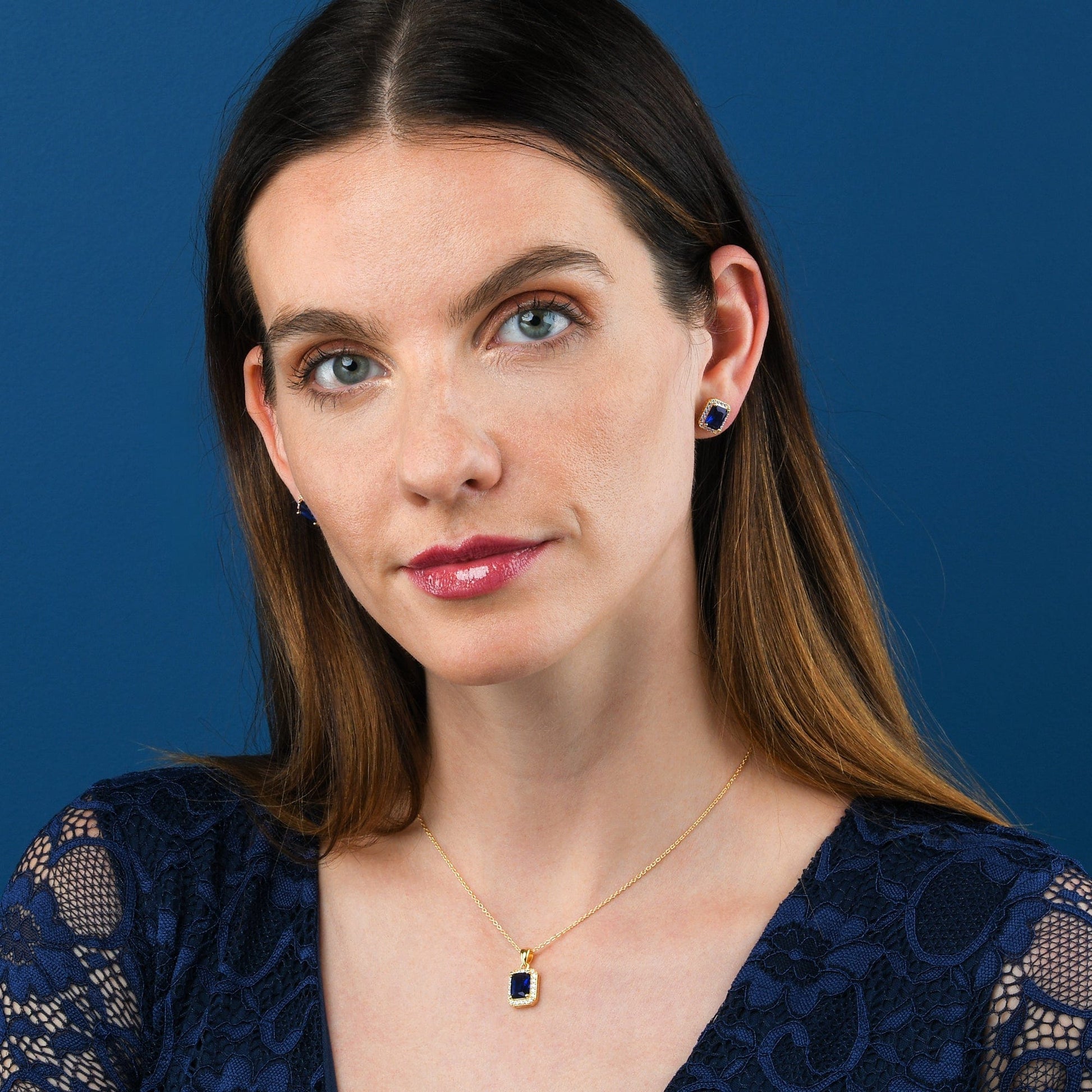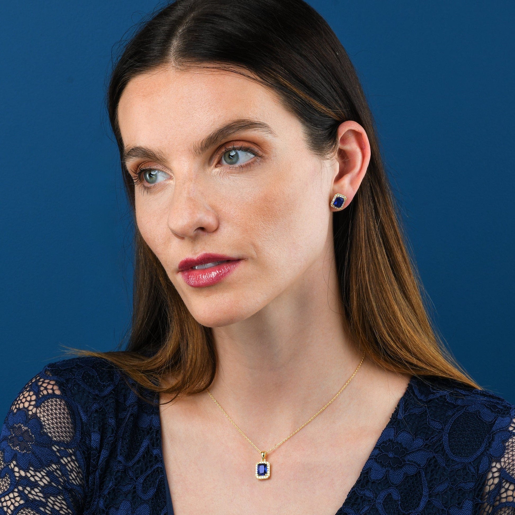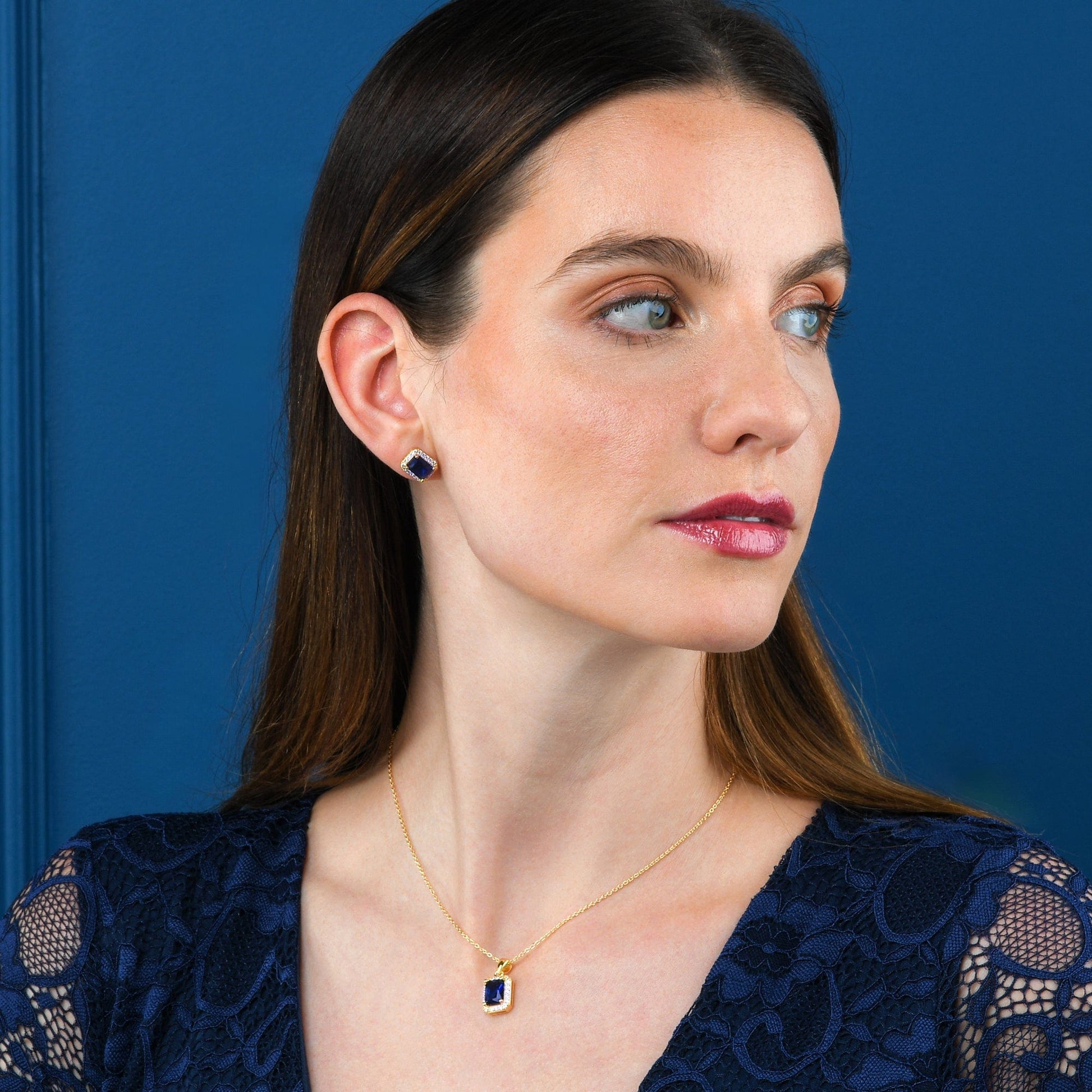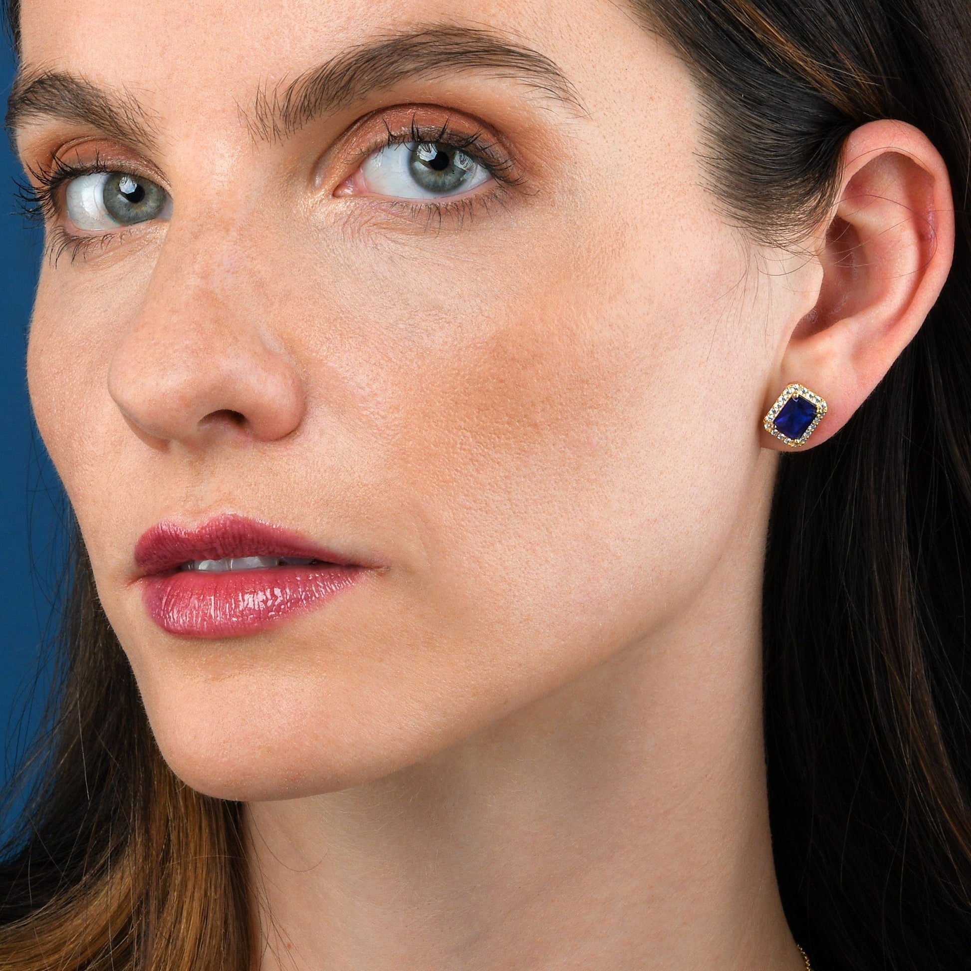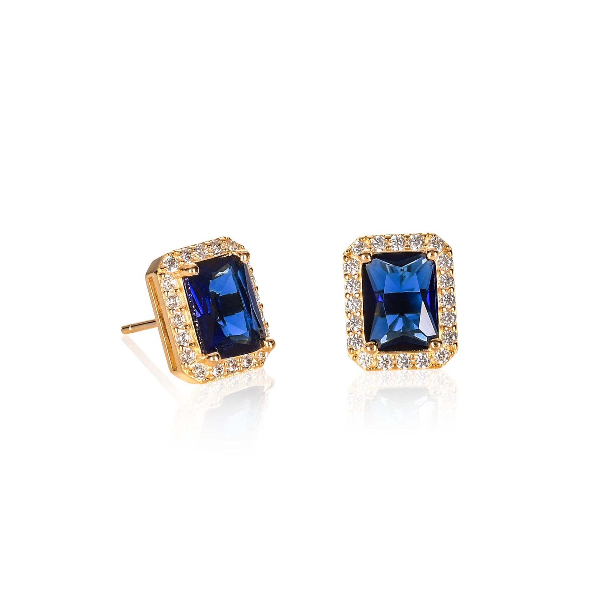 • 9mm x 11mm rectangle studs are set with 6mm x 8mm emerald cut sapphire blue cubic zirconia stone and 1.5mm small sparkling white cubic zirconia stones.