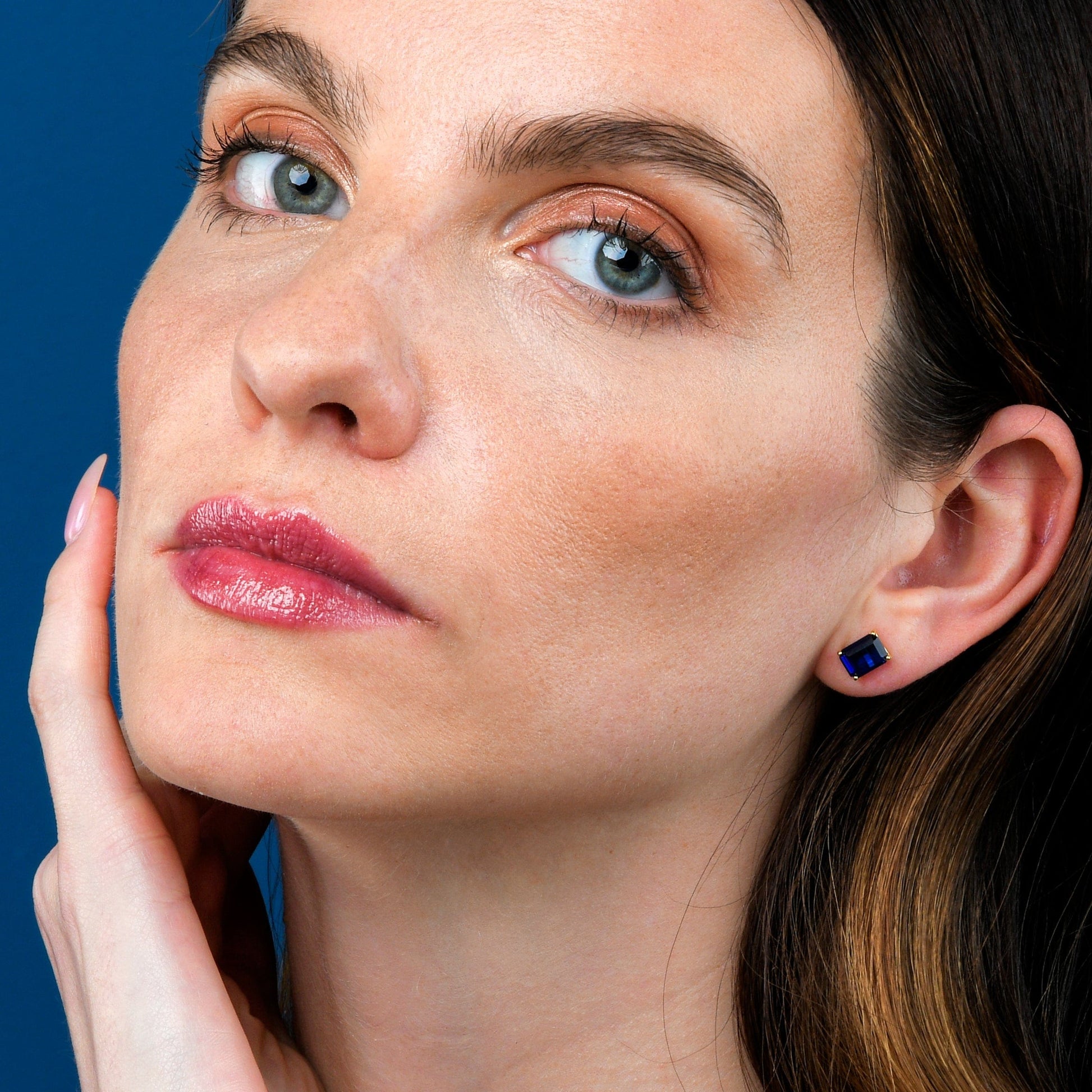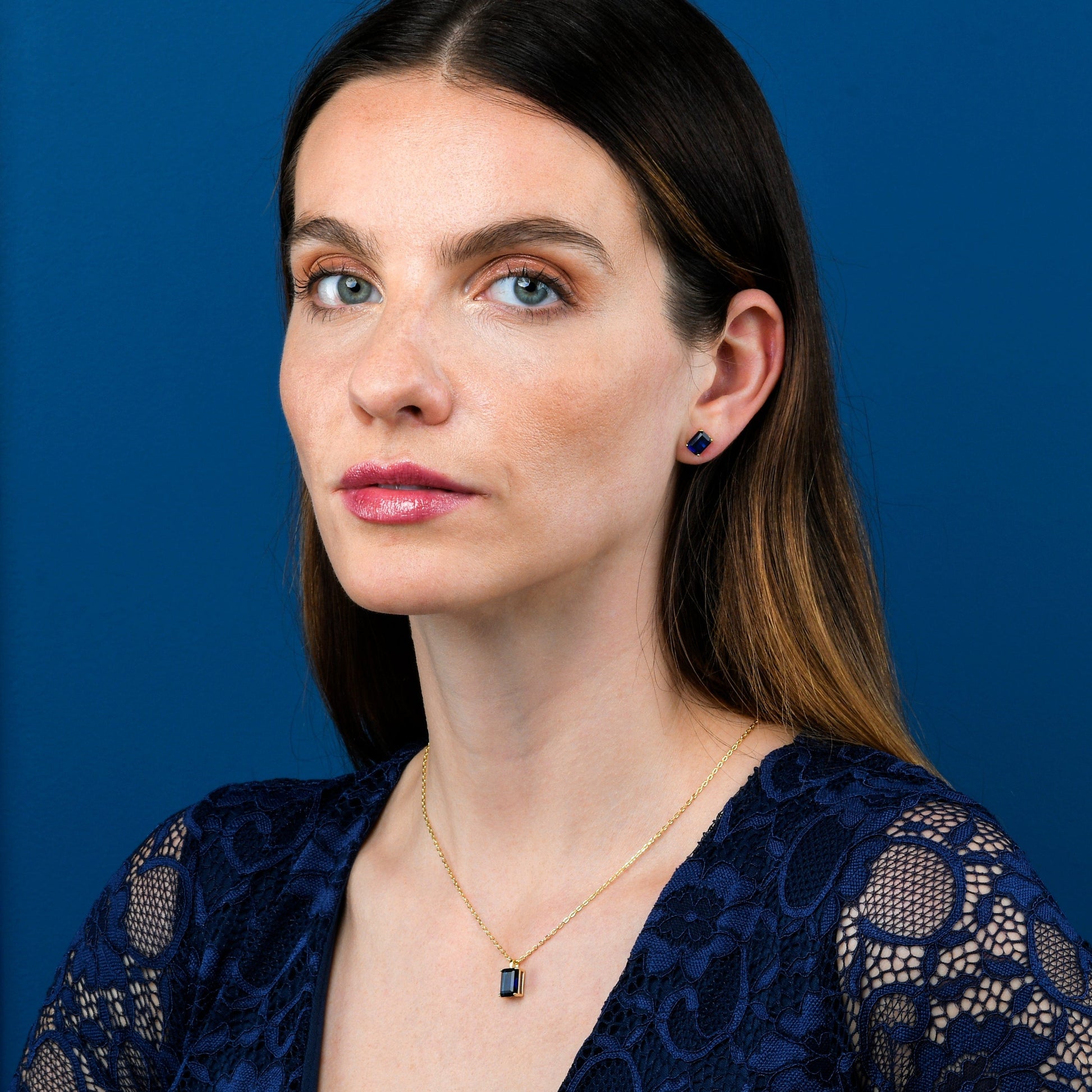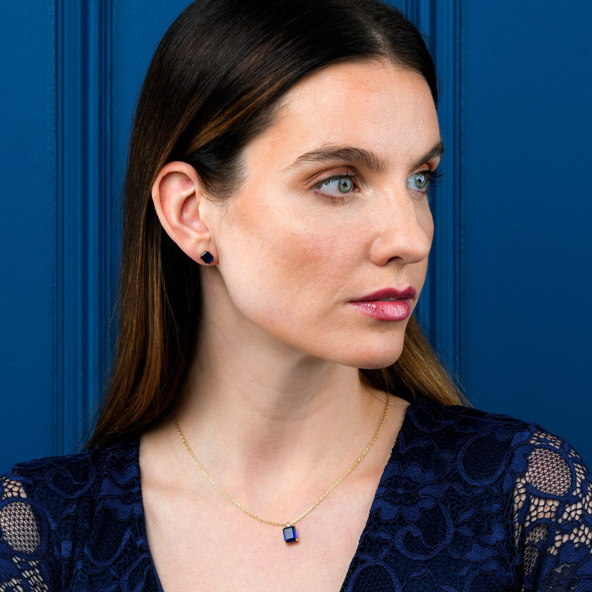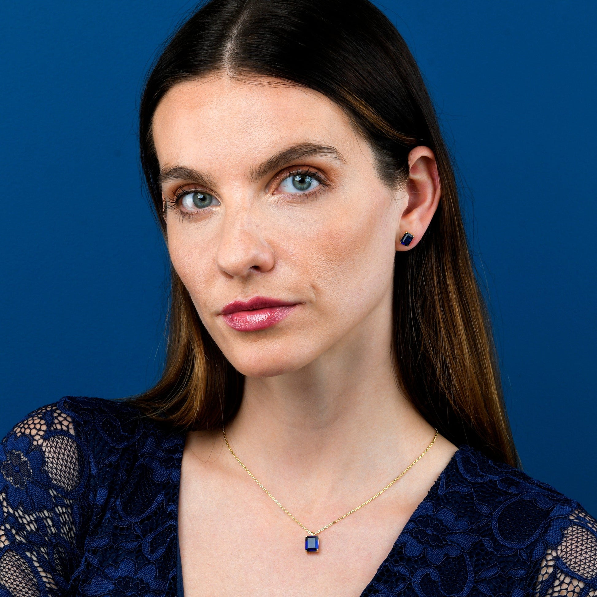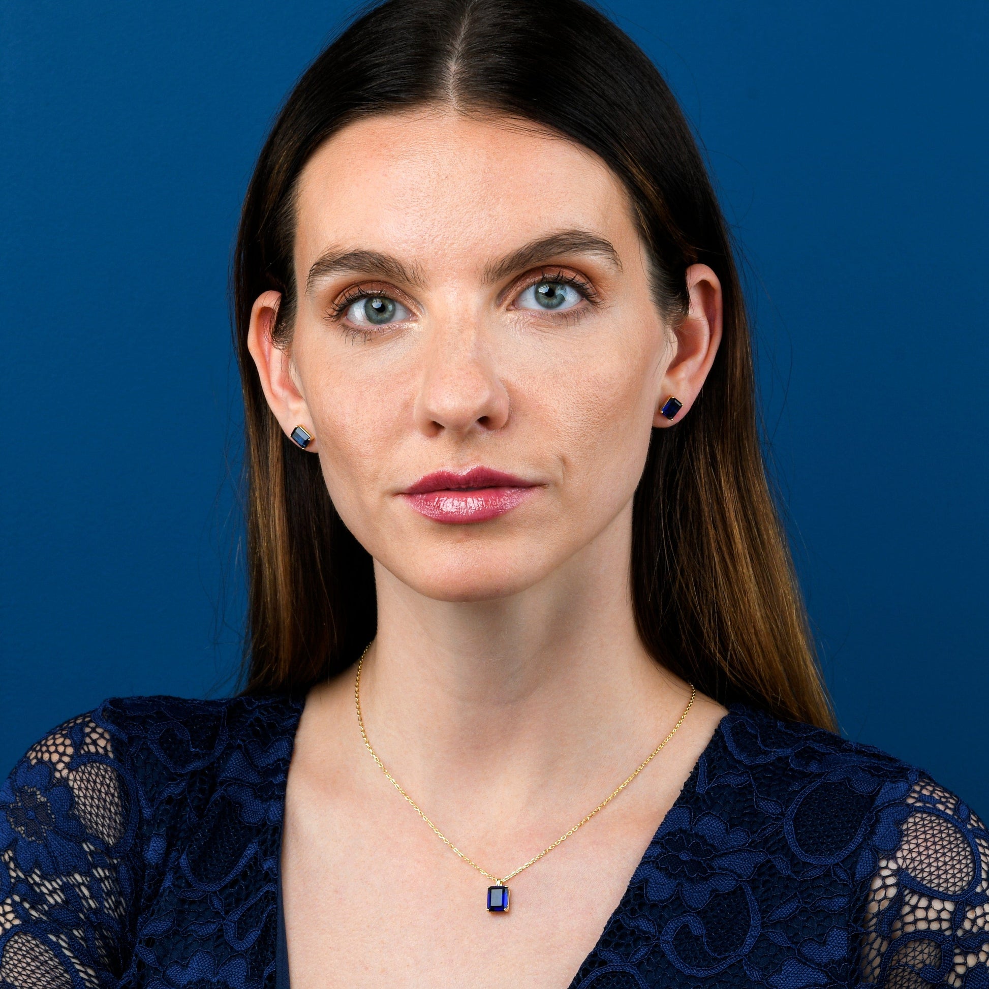 • Dainty gold earrings for women with 6mm by 8 mm Emerald-cut blue stones.